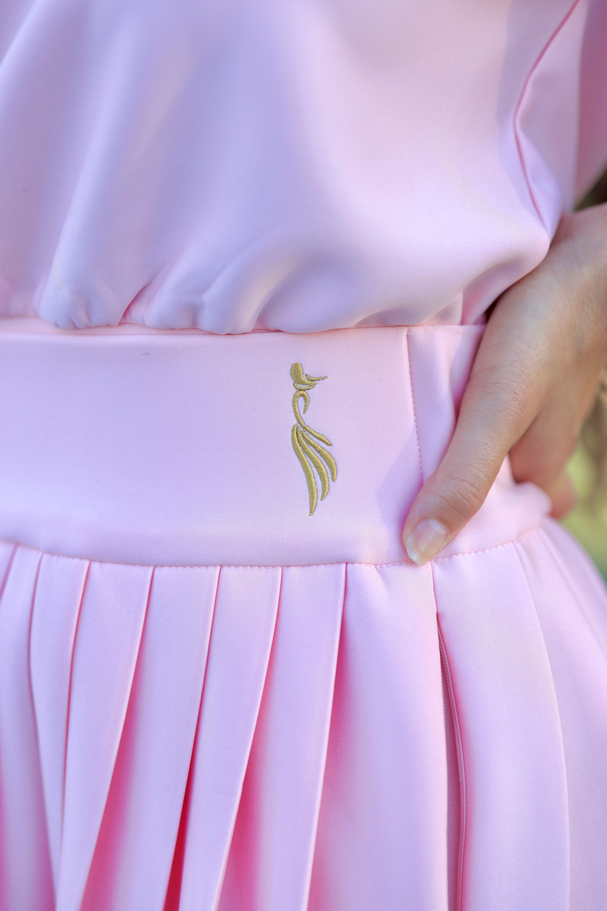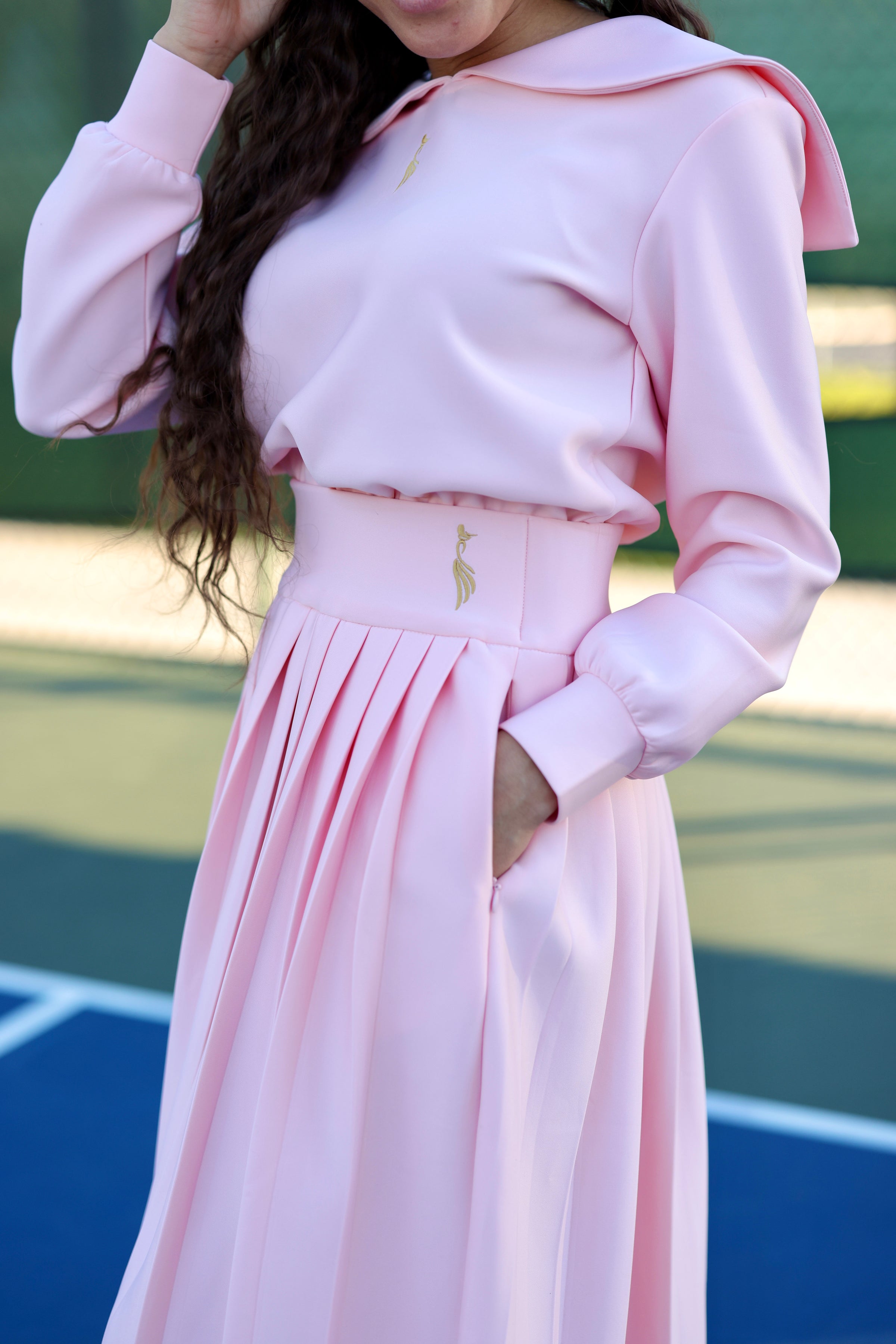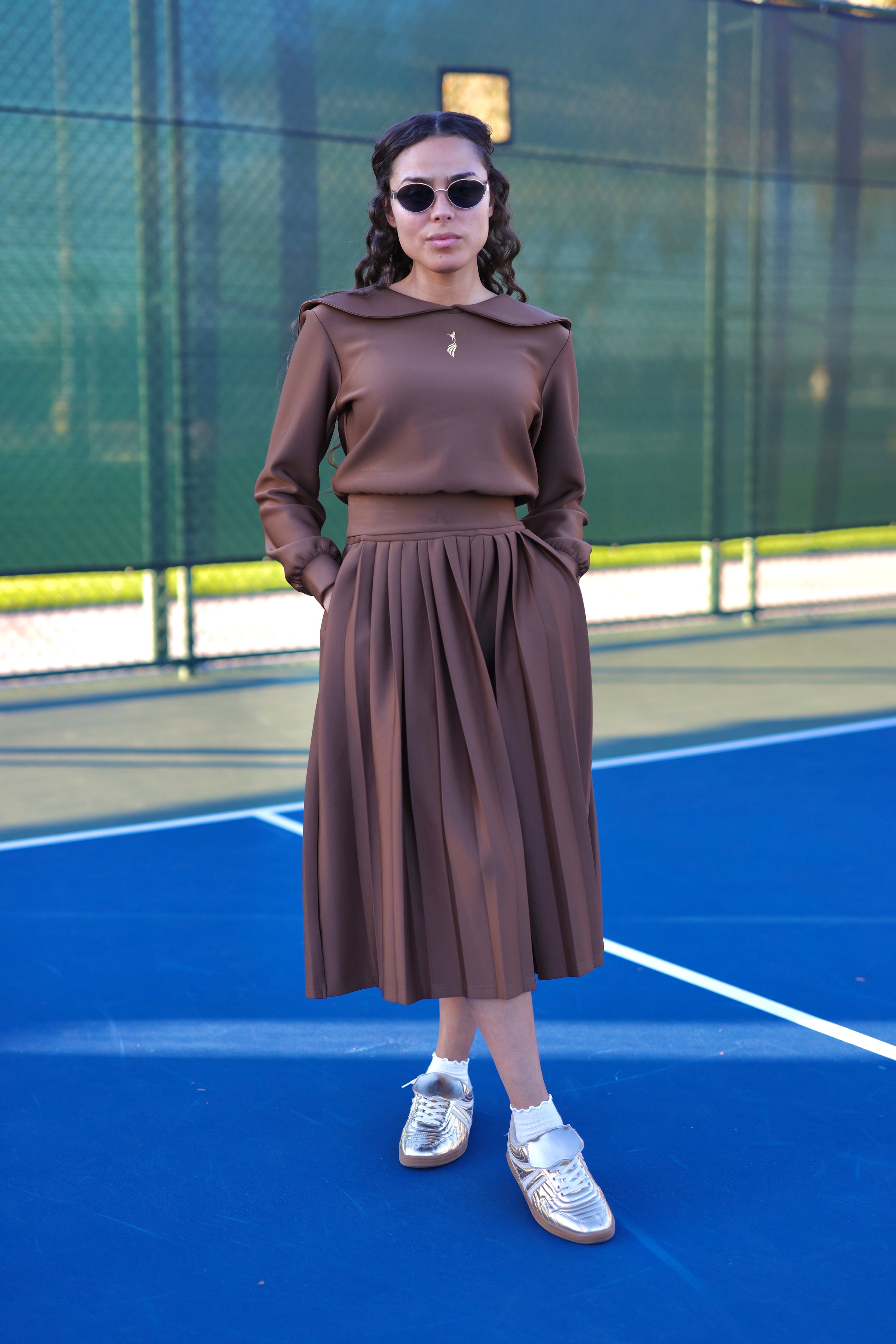 Crafted from an ultra-soft, breathable fabric, the top pairs effortlessly with a high-waisted pleated skirt featuring a thick, flattering waistband and deep zippered pockets on both sides — designed to hold your essentials securely without compromising the silhouette.