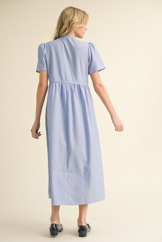 Classic, sweet, and effortless, this striped shirt dress blends a polished button-up feel with charming bow-tie details down the front. The lightweight cotton-blend fabric drapes softly through the midi length, while the relaxed waist gives it an easy, breathable silhouette you can wear all day. Finished with short sleeves and a modest neckline, it’s a pretty, everyday dress that still feels special.
