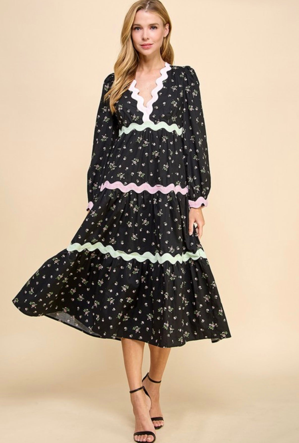 Pair this floral tiered midi dress with simple flats or block heels for a clean and classic look. It’s an ideal choice for church services, luncheons, or daytime gatherings where timeless modesty meets effortless style.