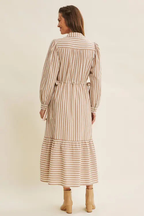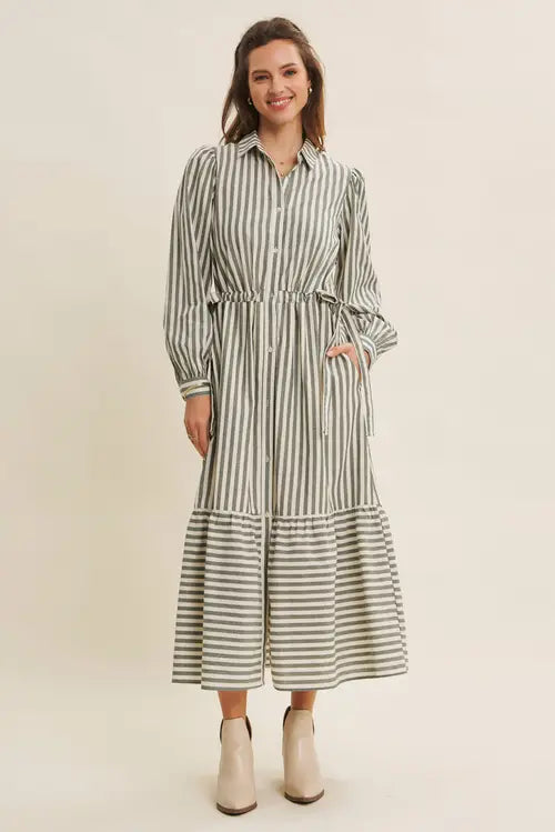Effortlessly chic and endlessly versatile, this striped midi dress is a timeless piece for every season. Crafted from 100% cotton, it features a button-down front, flattering tiered skirt, and long sleeves with a tailored cuff. The adjustable waist tie adds definition, while side pockets bring a touch of functionality. Designed for breathable comfort and easy wear, this piece transitions seamlessly from workdays to brunch to casual outings, making it a wardrobe staple you’ll wear on repeat.