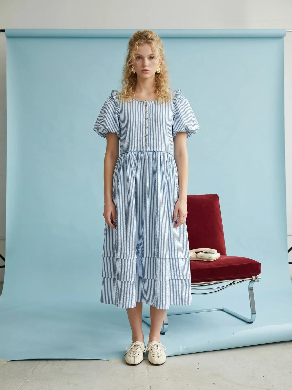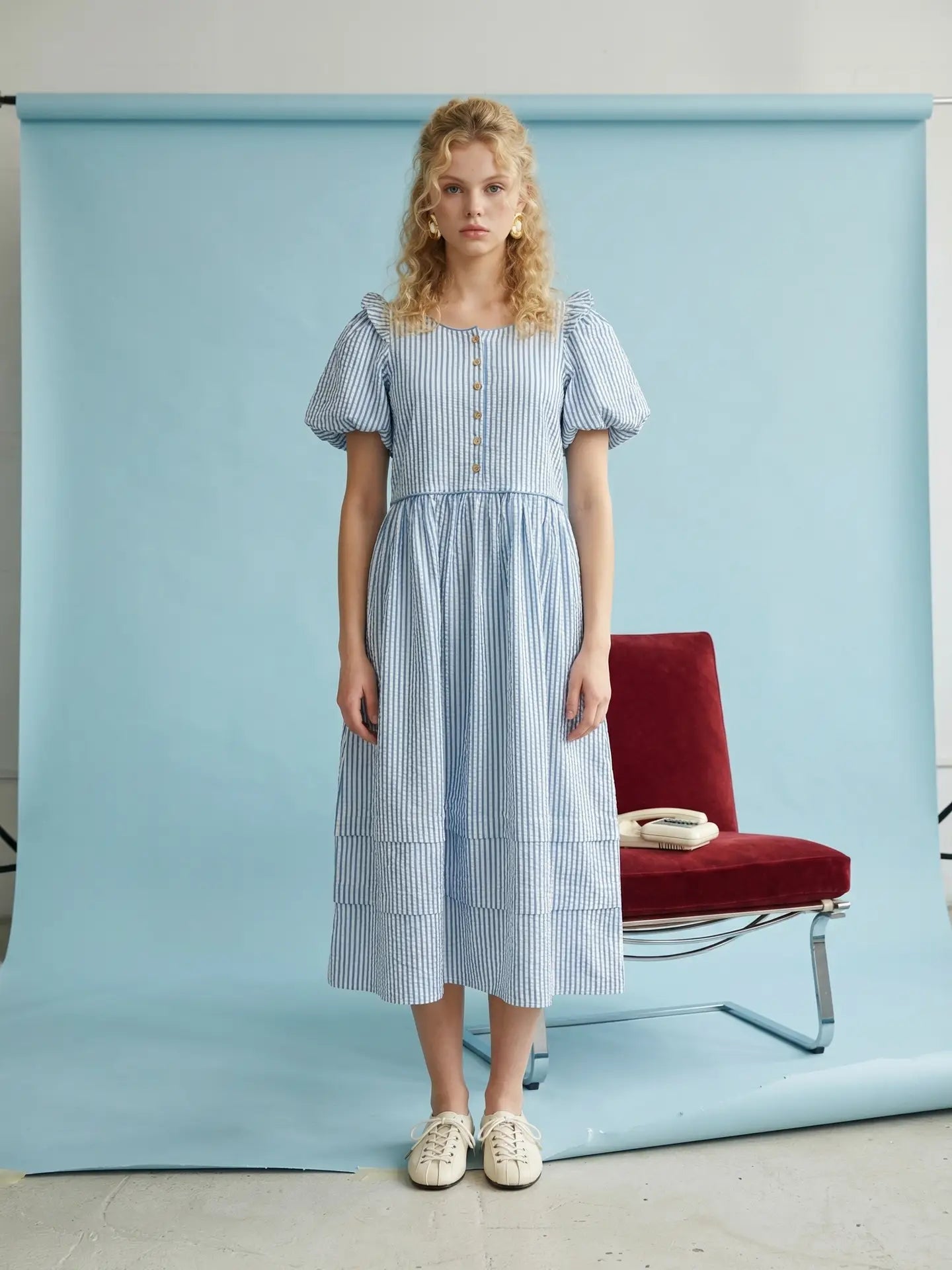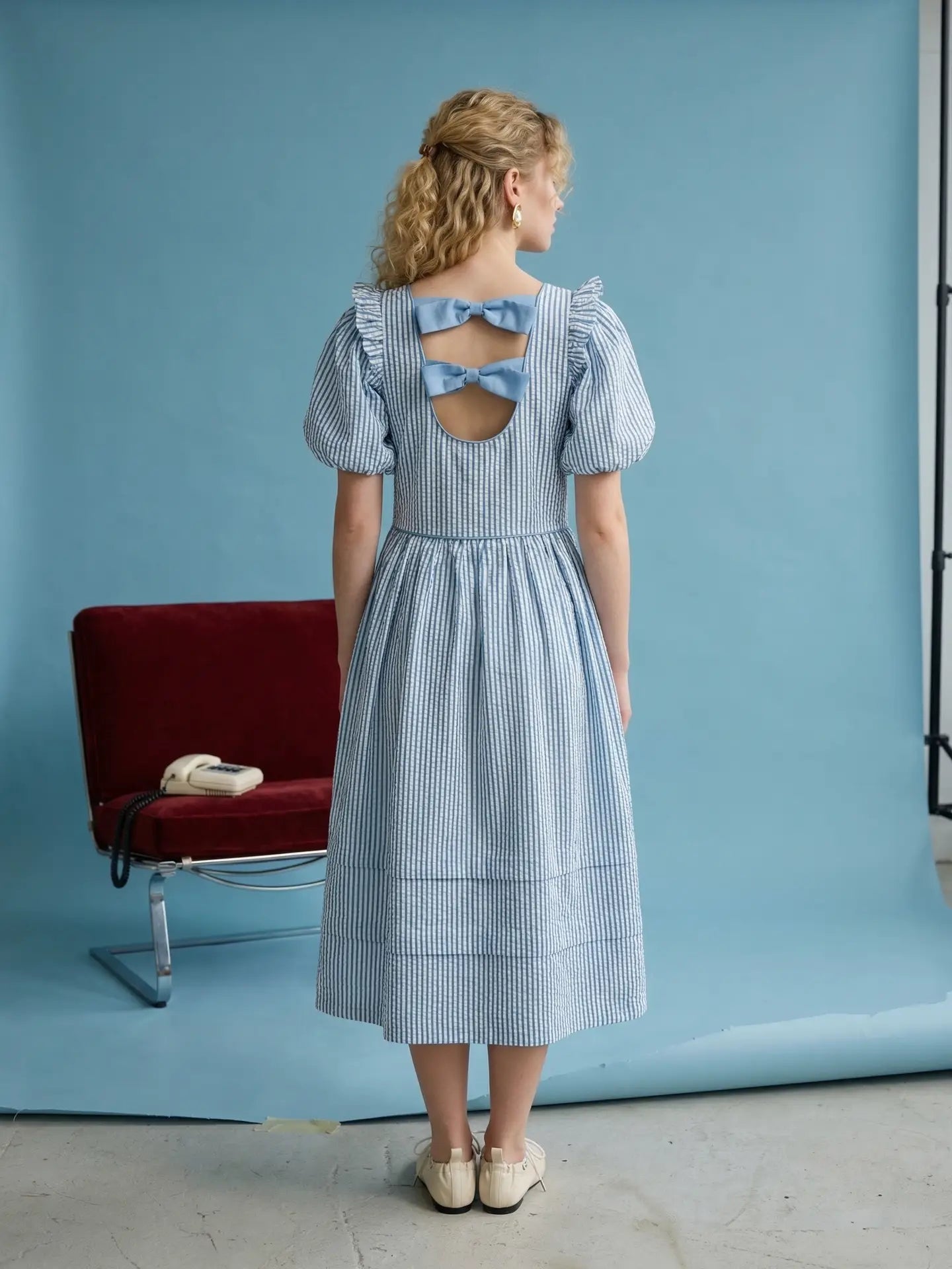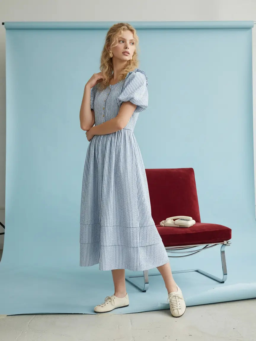 Effortlessly feminine and easy to wear, this striped midi dress blends timeless style with everyday comfort. The soft puff sleeves and tiered skirt create a graceful silhouette, while the button-front bodice and delicate back bow add thoughtful detail. Made from breathable cotton, it’s a versatile piece perfect for spring and summer days, whether you're heading to brunch, running errands, or enjoying a casual outing.