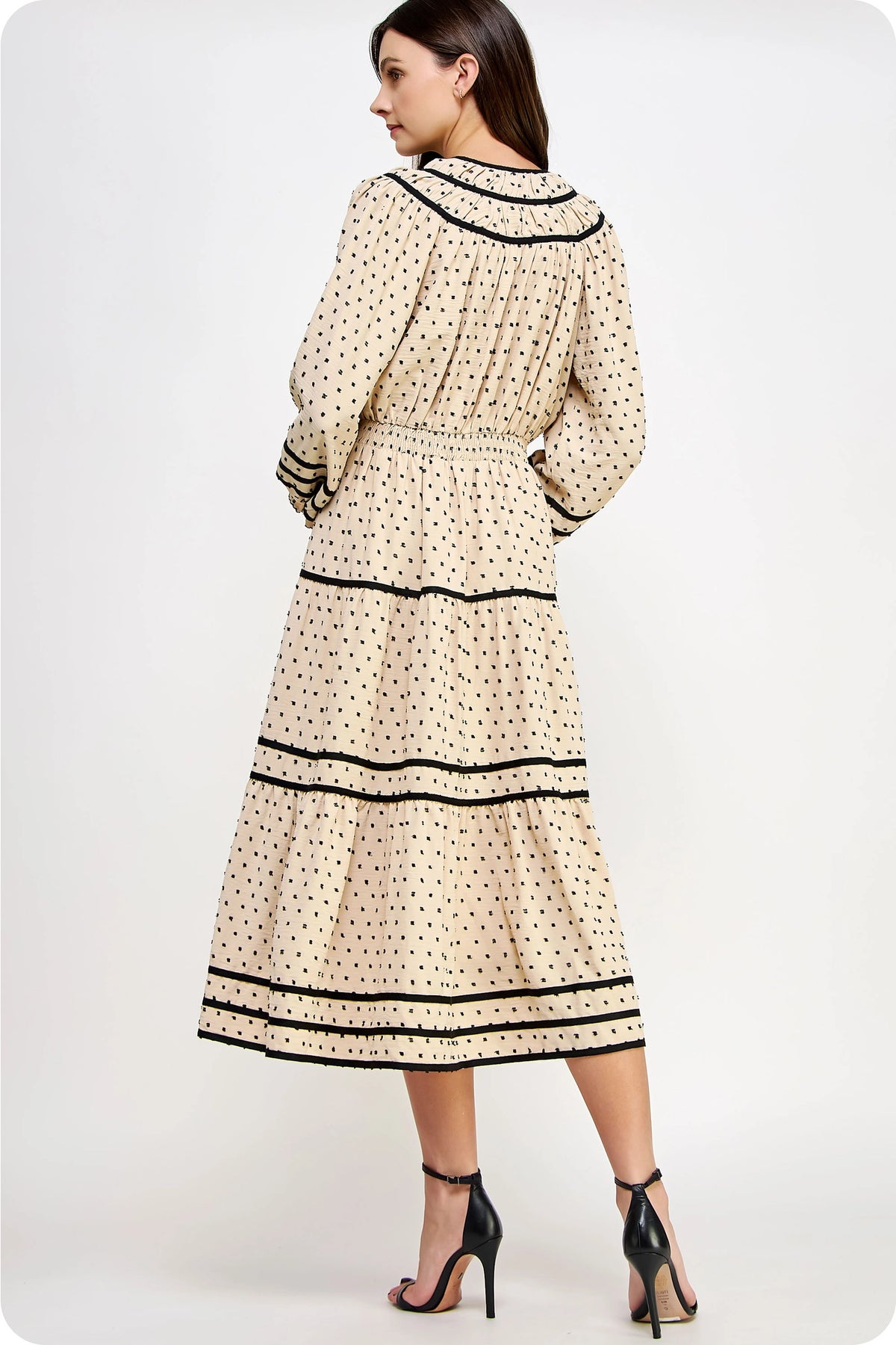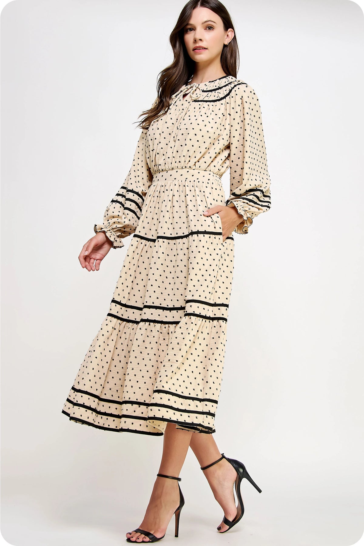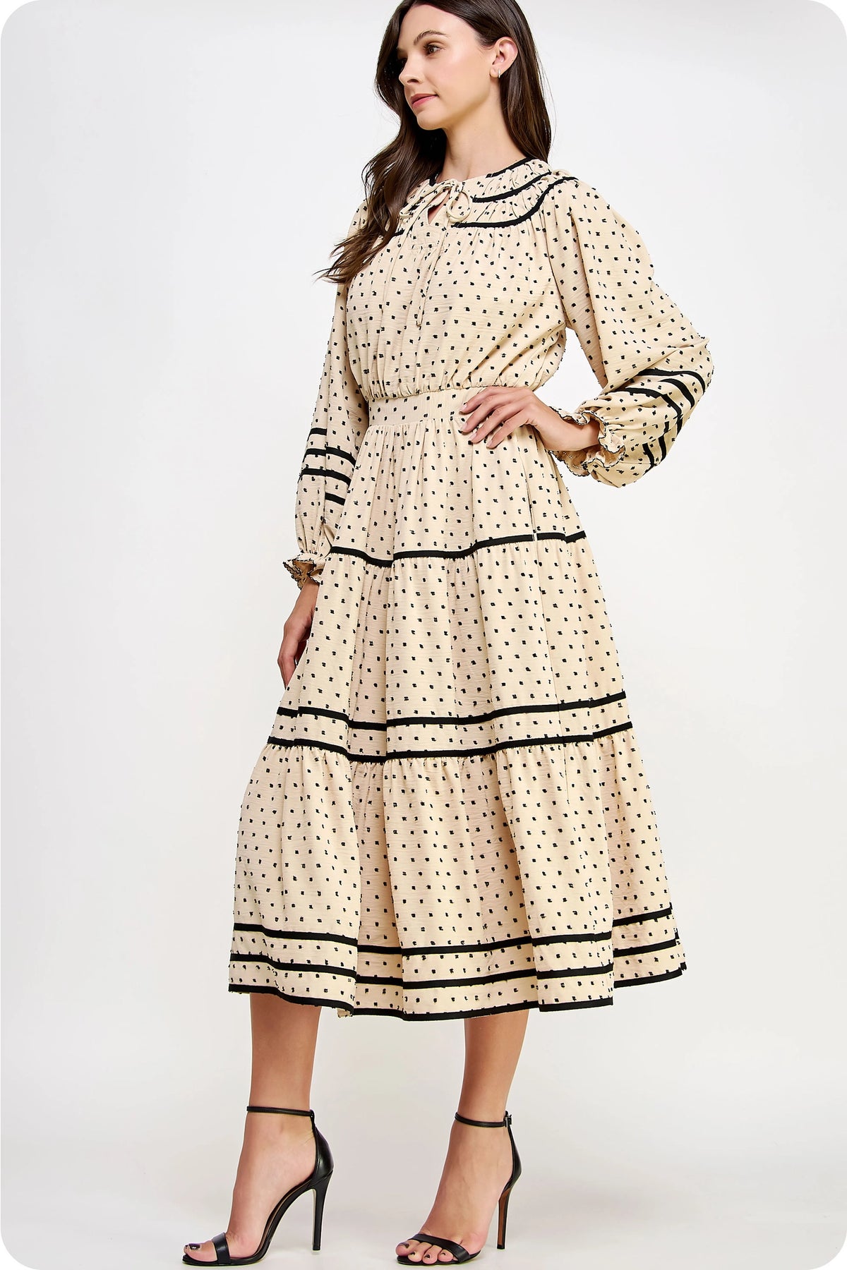 A graceful, vintage-inspired midi dress crafted in a soft fil coupé dot fabric and elevated with bold contrast piping. The split neckline with a feminine bow tie closure adds charm, while the raglan sleeves, ruffled cuffs, and tiered skirt create beautiful movement. A cinched elastic waist defines the silhouette effortlessly, and the full lining and pockets make it as practical as it is elegant. Perfect for church, events, or any day you want an elevated yet modest look.