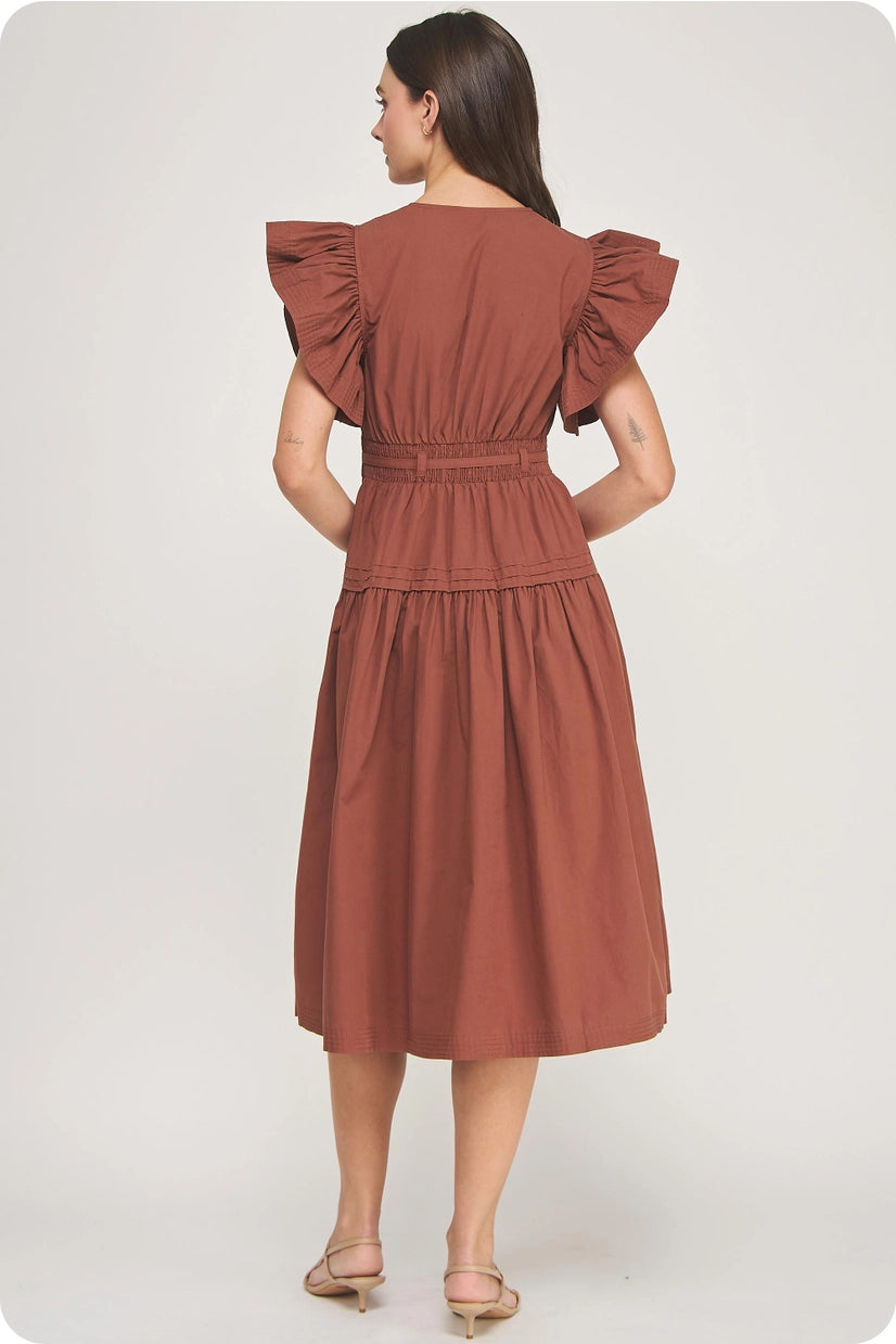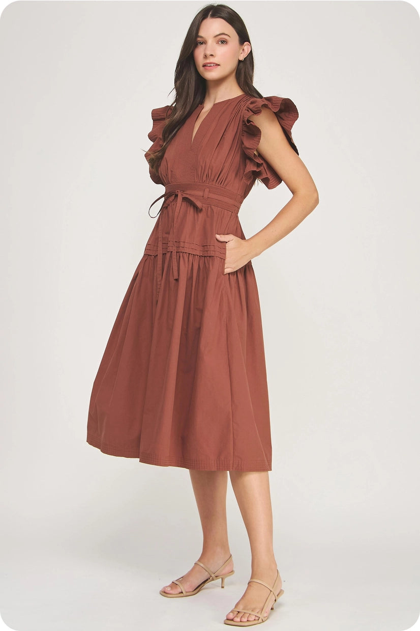 Crafted in breathable poplin, this midi dress combines feminine detail with timeless ease. From the flutter sleeves to the cinched waist and flowing skirt, it’s a beautifully balanced silhouette—effortless for daytime and polished enough for special moments. A classic cotton piece you’ll reach for again and again.