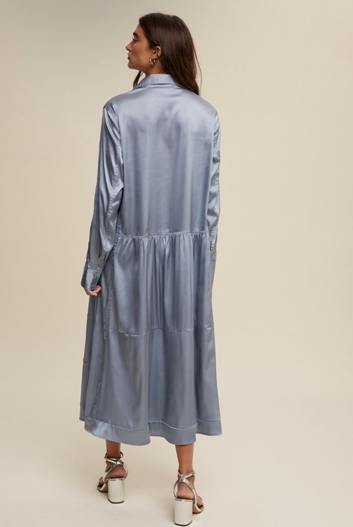 This elegant satin shirt dress blends timeless tailoring with an effortless silhouette. With its smooth sheen, soft movement, and elevated details, it's the perfect day-to-night piece — refined, comfortable, and endlessly wearable.