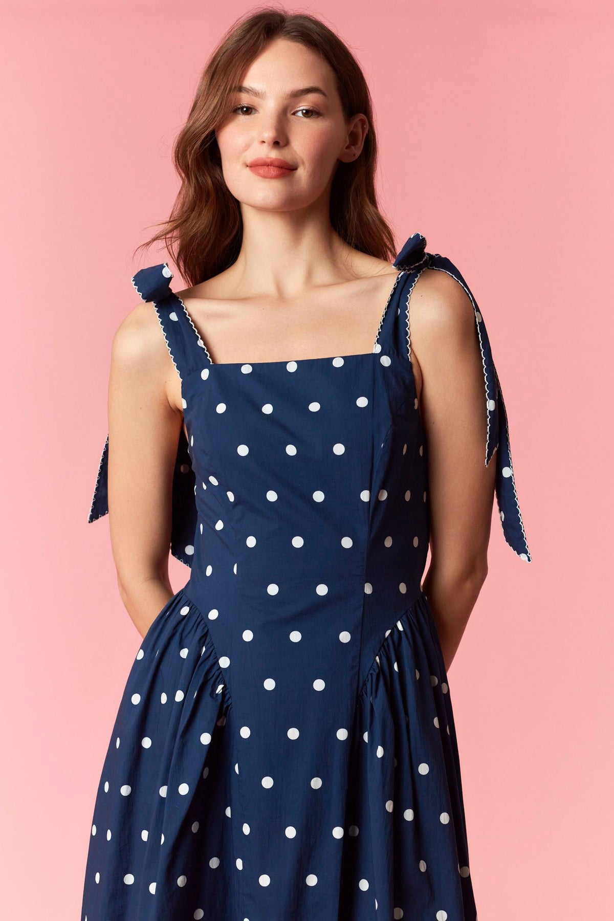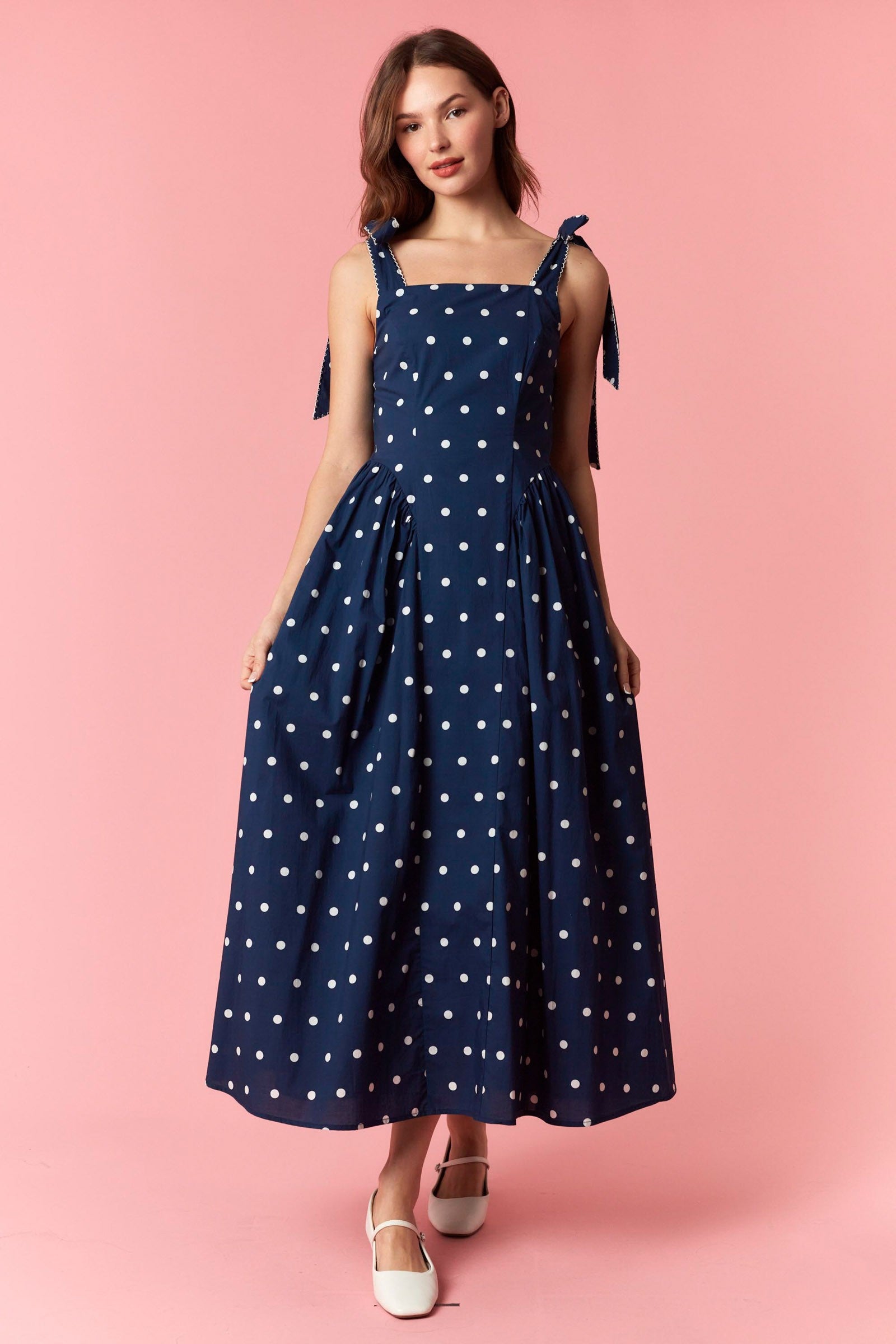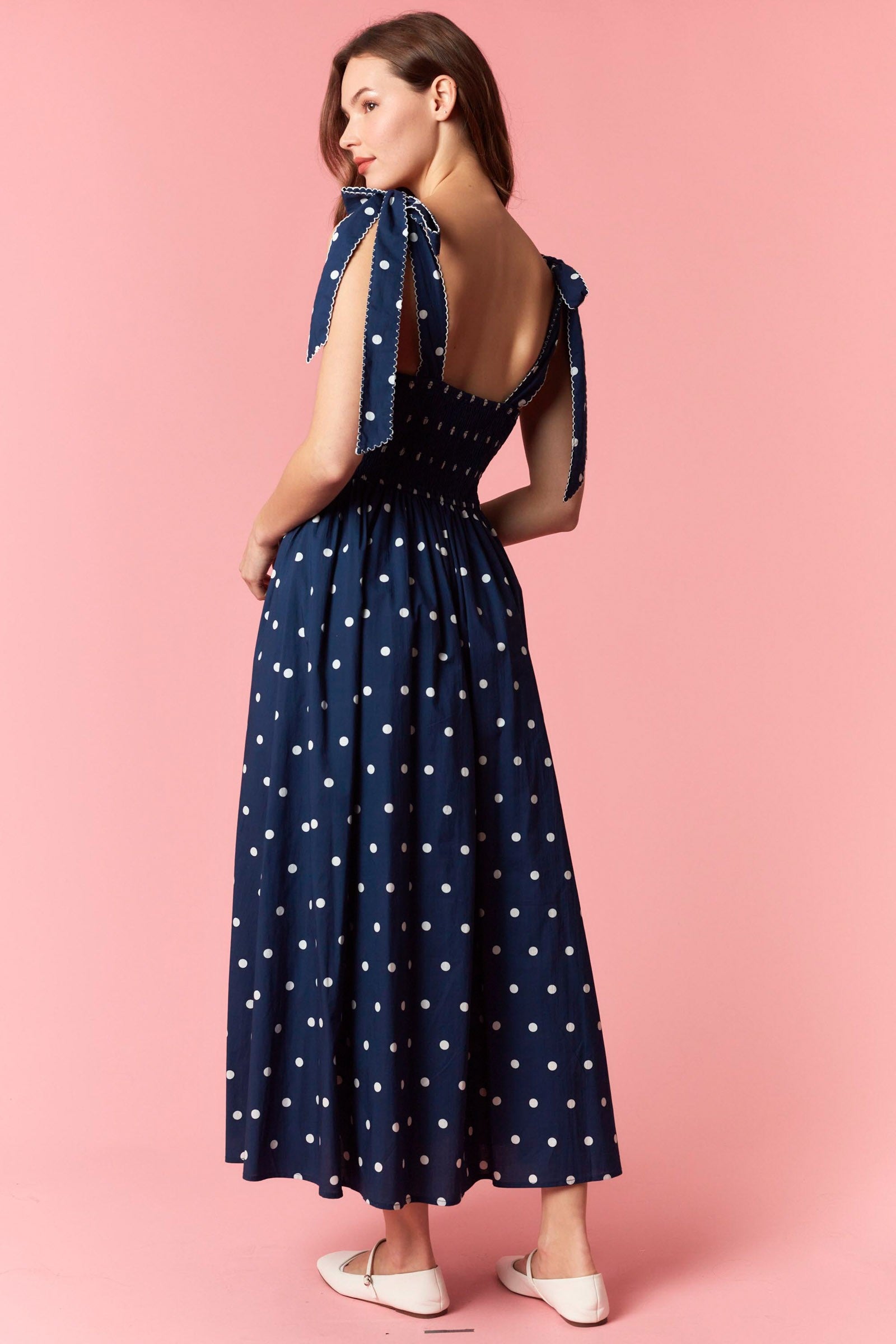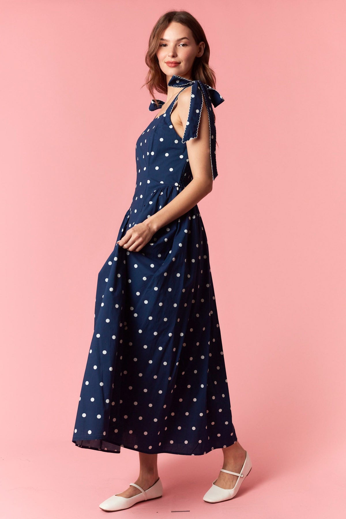 Graceful and effortlessly charming, this polka dot maxi dress captures a classic feminine feel with thoughtful boutique details. The scalloped embroidered straps and bow ties add a soft romantic touch, while the smocked back ensures a comfortable fit. Finished with a flowing skirt and timeless polka dot print, this cotton maxi is perfect for spring and summer occasions, from brunch outings to relaxed weekend gatherings.