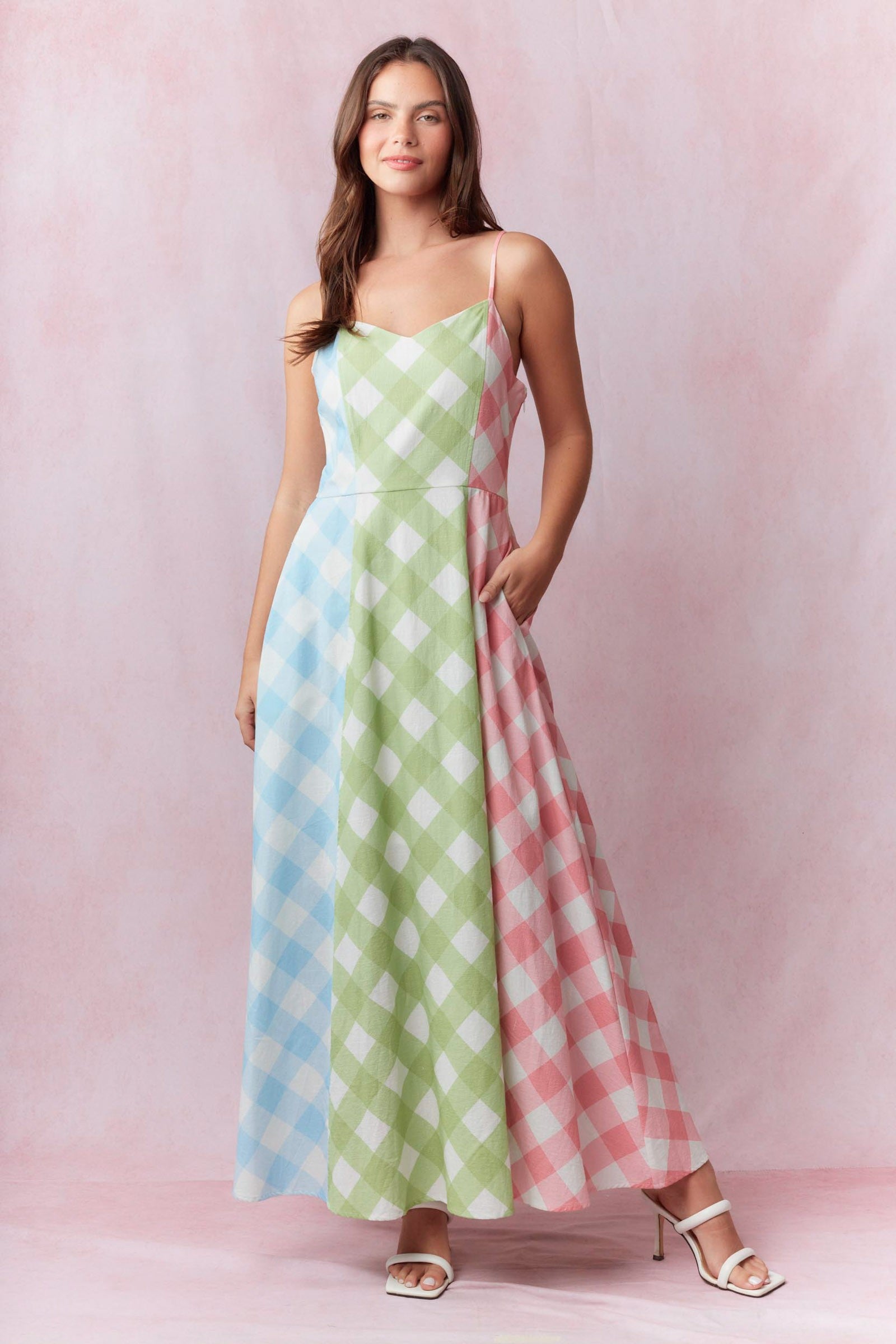 Bright, breezy, and full of charm — this color-mixed gingham dress captures the essence of spring and summer. Crafted from a soft cotton-linen blend, it features pastel panels of blue, green, and blush pink for a cheerful, elevated look. The sweetheart neckline and adjustable spaghetti straps create a flattering fit, while the full midi skirt moves effortlessly with every step. Designed with side pockets for everyday ease, it’s the perfect choice for picnics, brunch dates, or warm-weather celebrations.