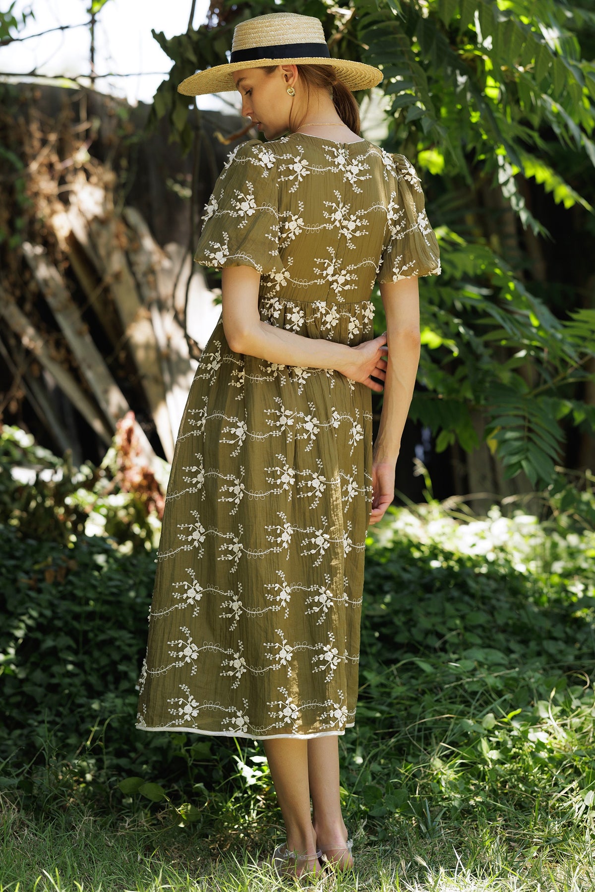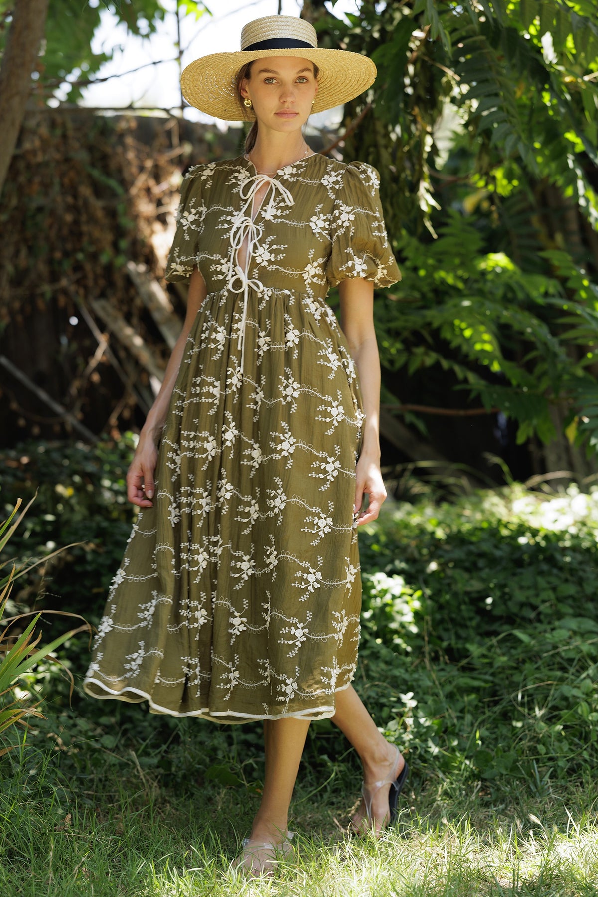 Step into an effortlessly romantic look with this olive midi dress, featuring intricate embroidery and a soft, flowing silhouette. The tie-front bodice and puff sleeves bring a touch of vintage countryside charm, making it a perfect piece for breezy days and elegant casual wear.