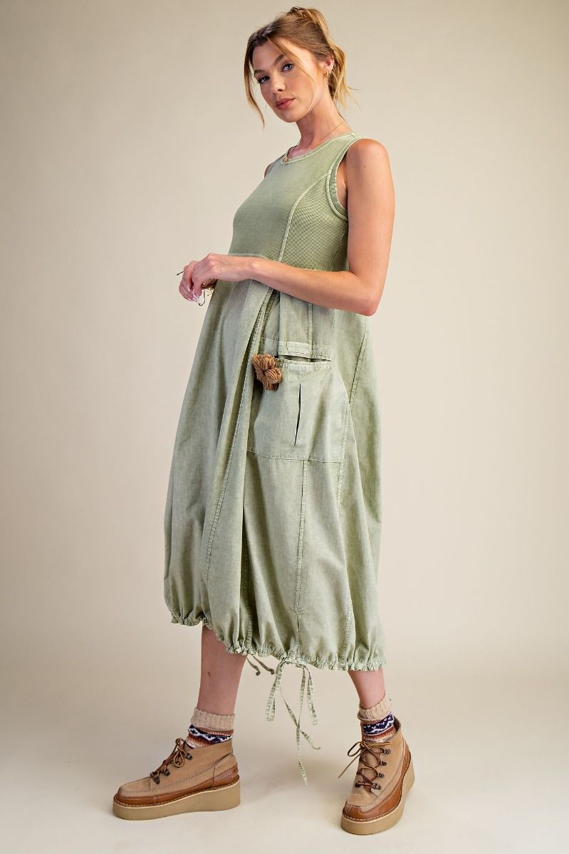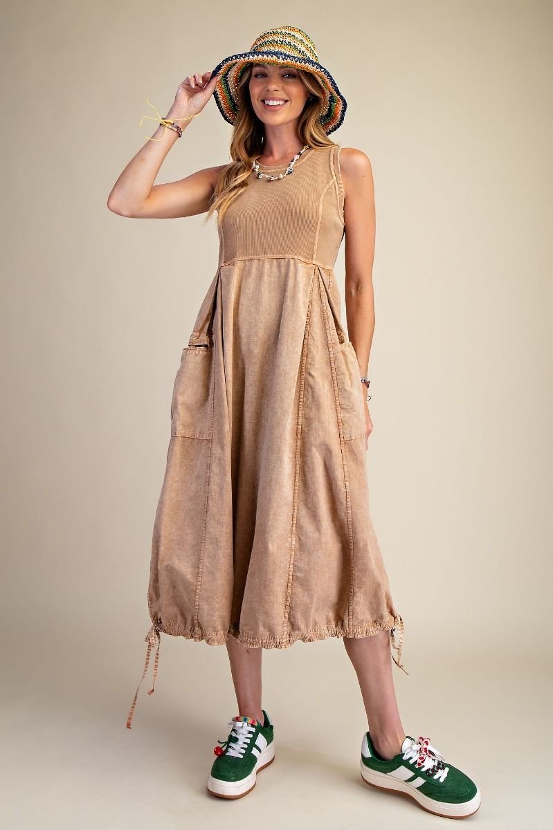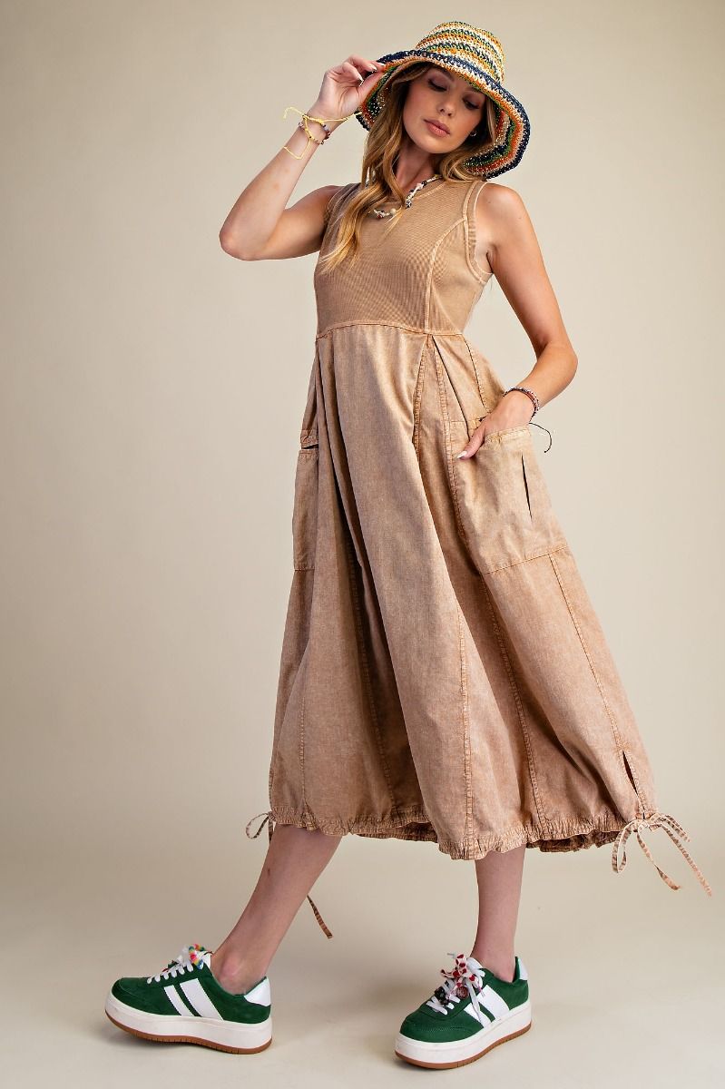 Designed for effortless wear, this mineral washed cargo maxi dress blends comfort with a modern utility-inspired silhouette. The rib knit bodice pairs seamlessly with a soft woven skirt, offering breathable movement and all-day ease. Thoughtful details like pleated sides, adjustable drawstring hems, and functional cargo pockets make this piece both practical and elevated—perfect for layering or wearing on its own through multiple seasons.