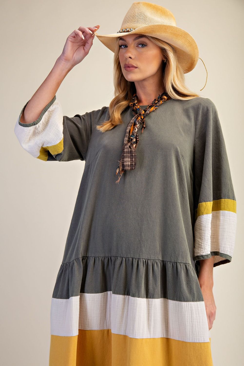 Effortless and distinctive, this color block maxi dress blends comfort with thoughtful design. The lightweight cotton fabric drapes beautifully, while the dropped waist seam creates a natural flow through the skirt. Designed for everyday wear, the relaxed silhouette and 3/4 length sleeves make this dress an easy choice for transitional seasons, offering a polished look without feeling restrictive.