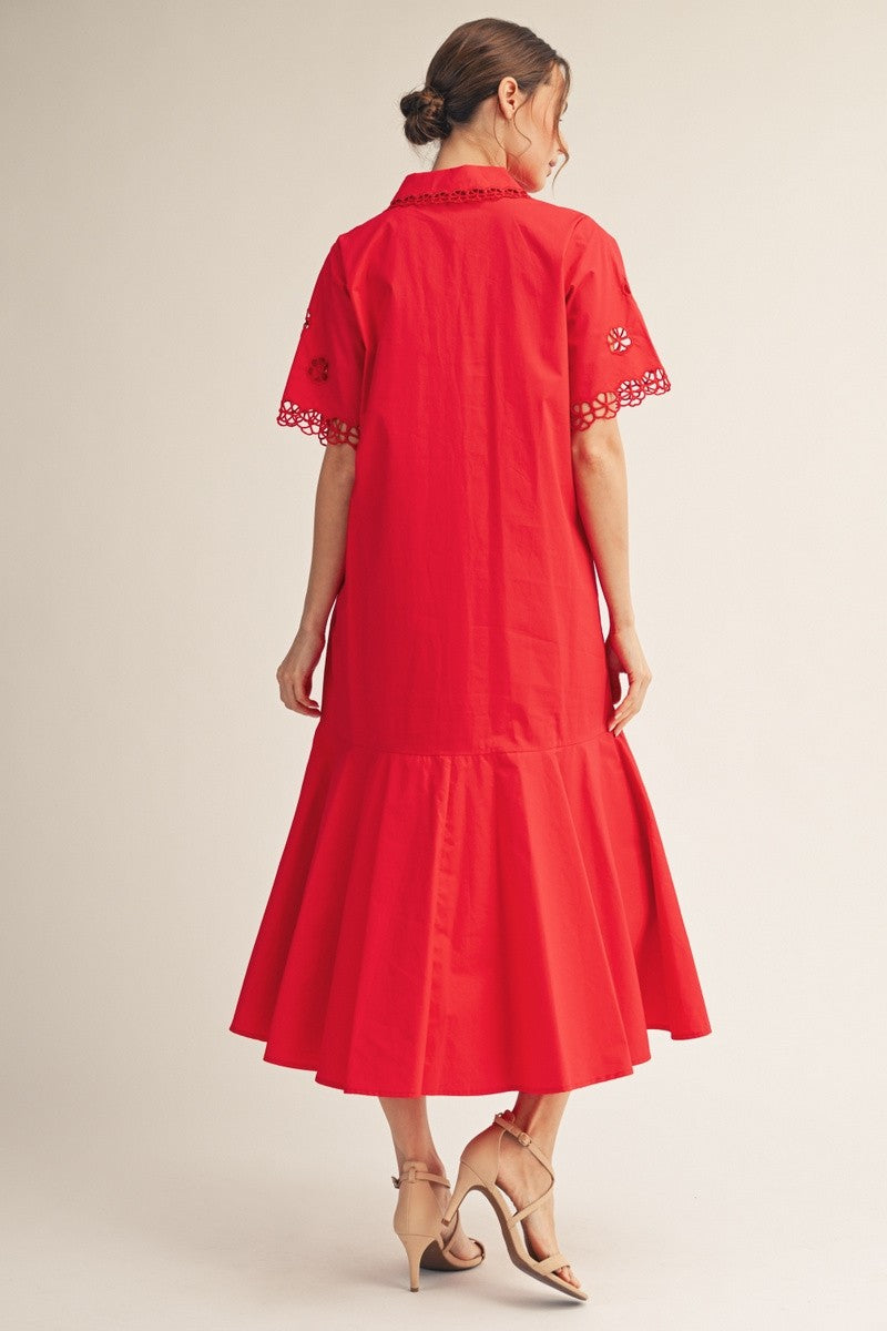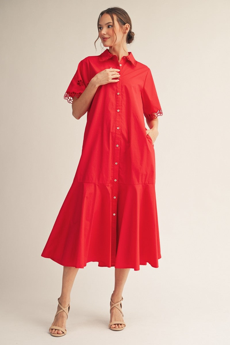 This button-down midi dress is a timeless staple designed with thoughtful details that elevate an everyday silhouette. The eyelet trim along the sleeves and collar adds a soft, feminine touch, while the flared hem creates beautiful movement with every step. Crafted from breathable cotton and finished with practical side pockets, this dress is perfect for warm days, effortless styling, and all-day comfort.