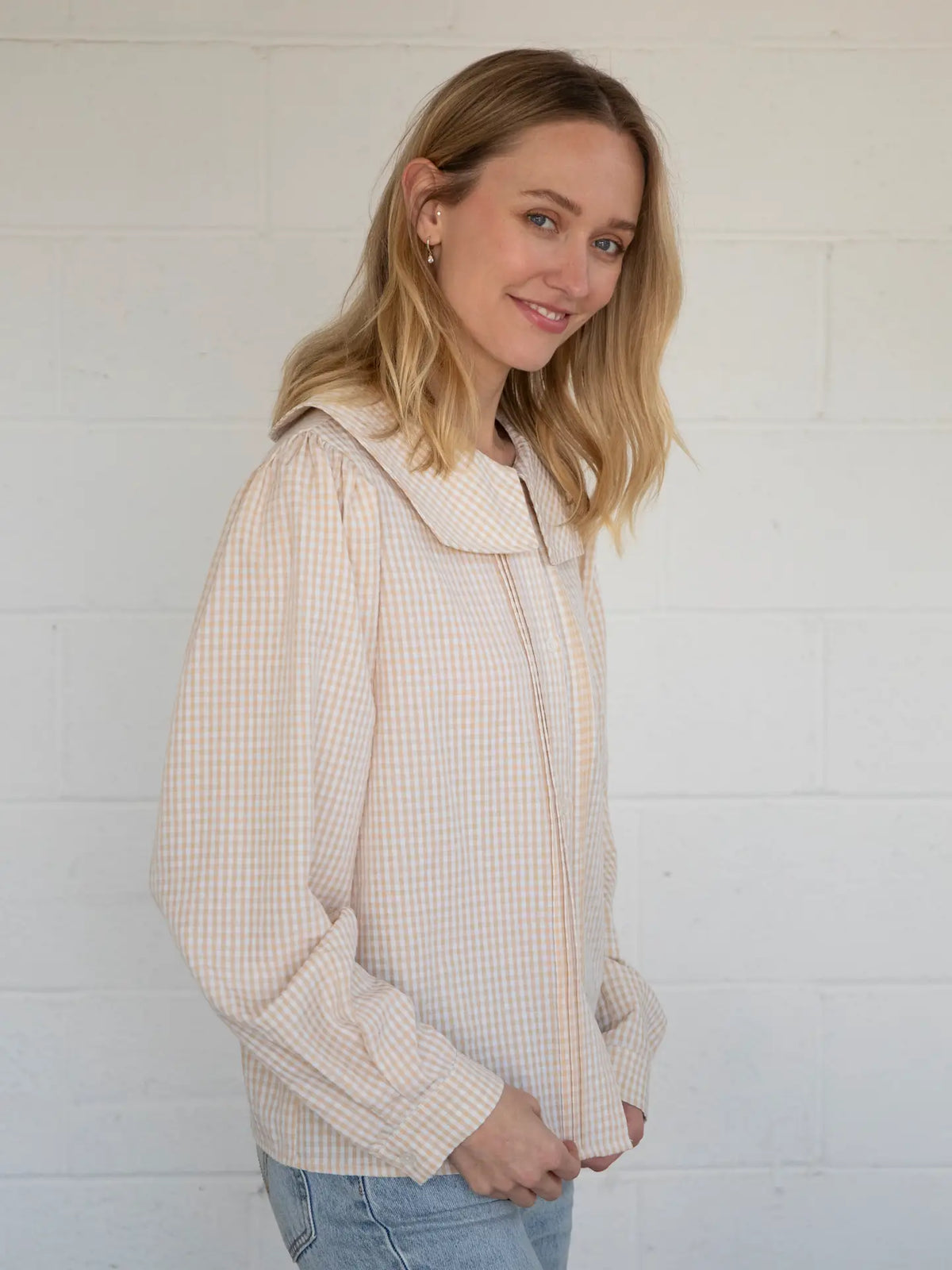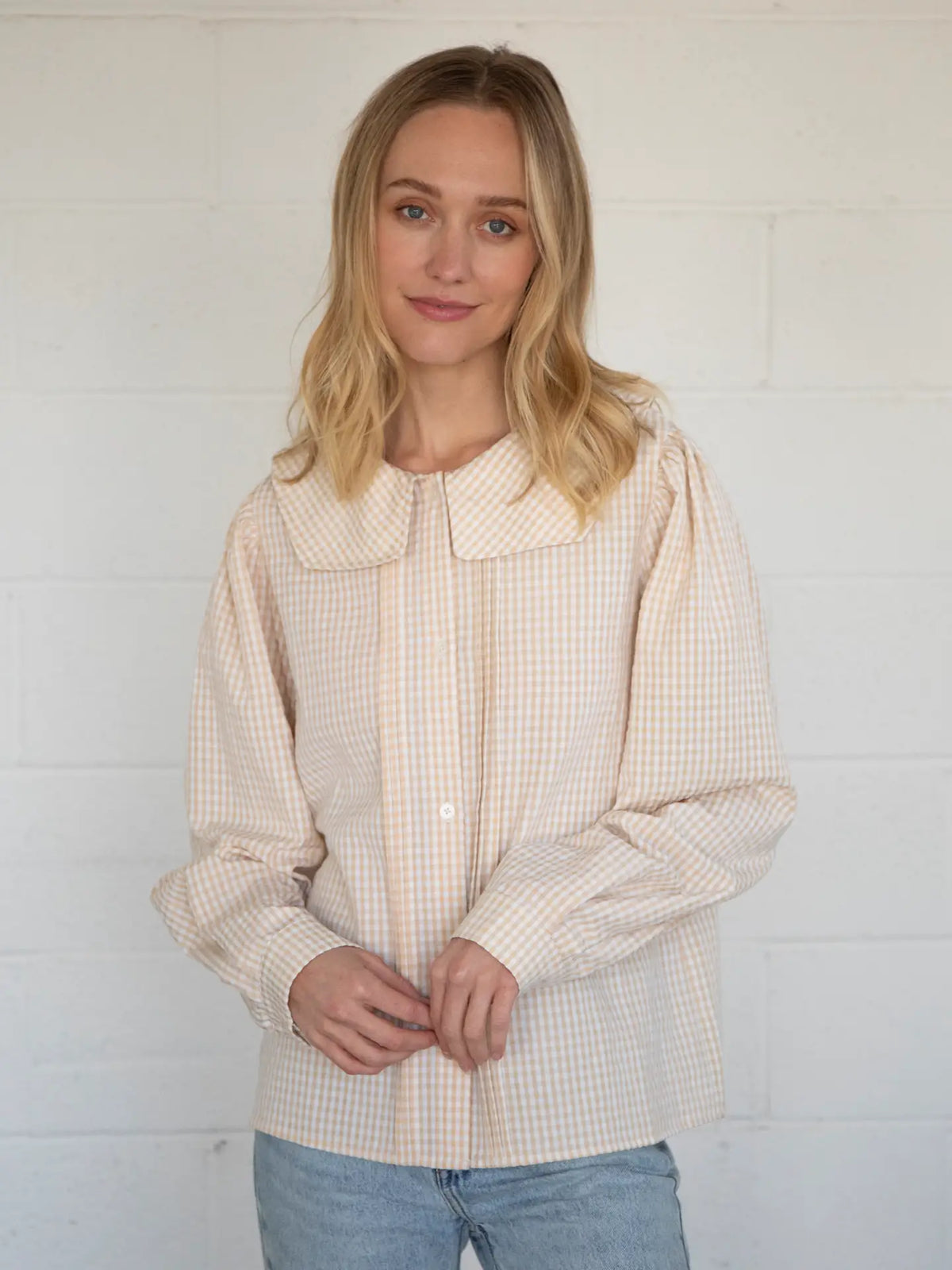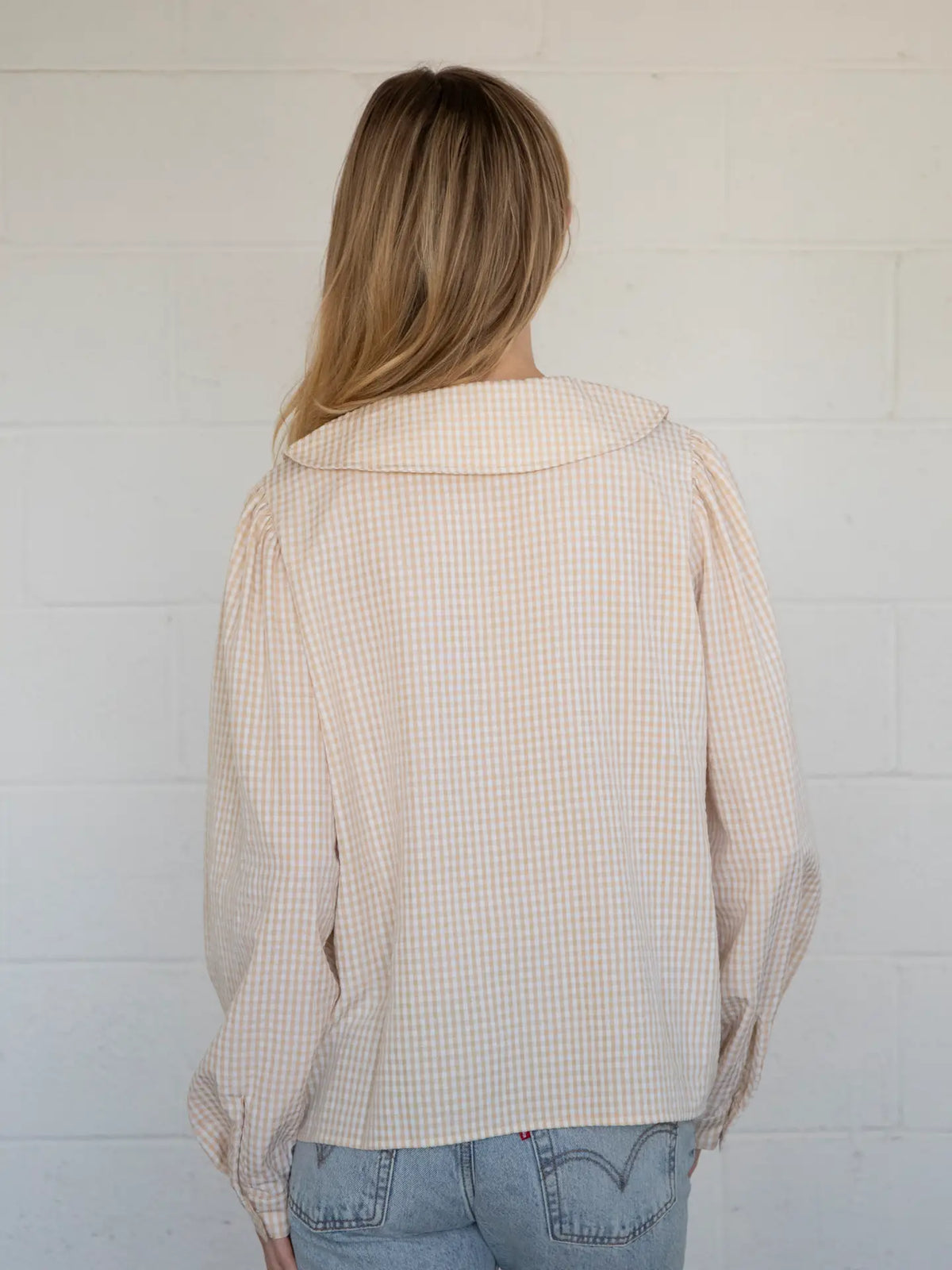 Timeless charm meets playful detail in this gingham button-down shirt, featuring a delicate peter pan collar. Crafted from a crisp, lightweight cotton blend, it offers a relaxed yet polished fit that’s perfect for layering or wearing solo. The classic gingham print brings a fresh, vintage-inspired vibe, while the collar adds a subtle touch of whimsy and femininity. Pair it with high-waisted jeans or a skirt for an effortlessly chic look with a nostalgic twist.