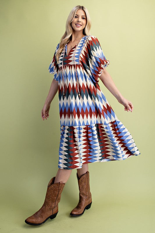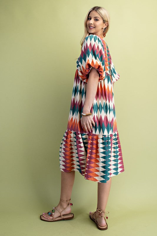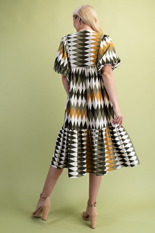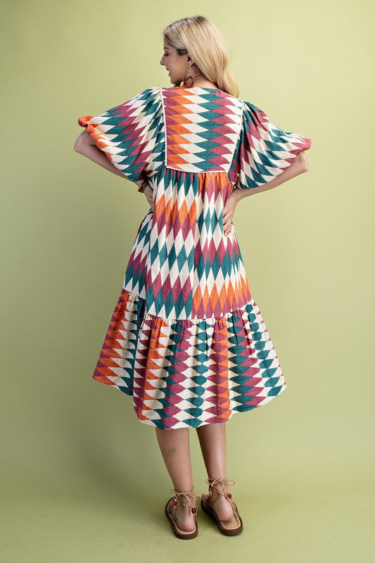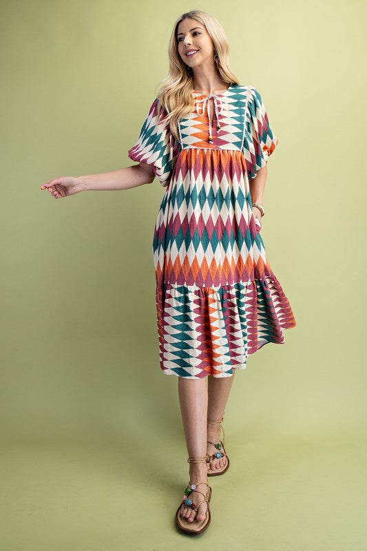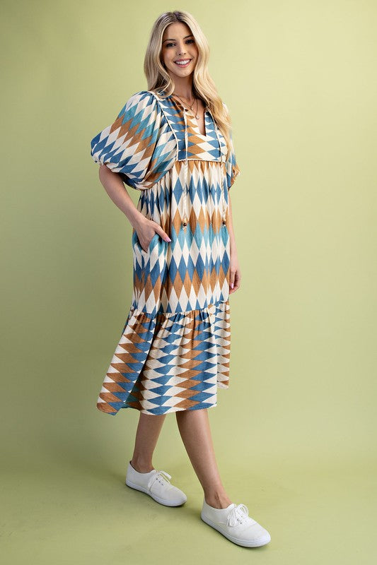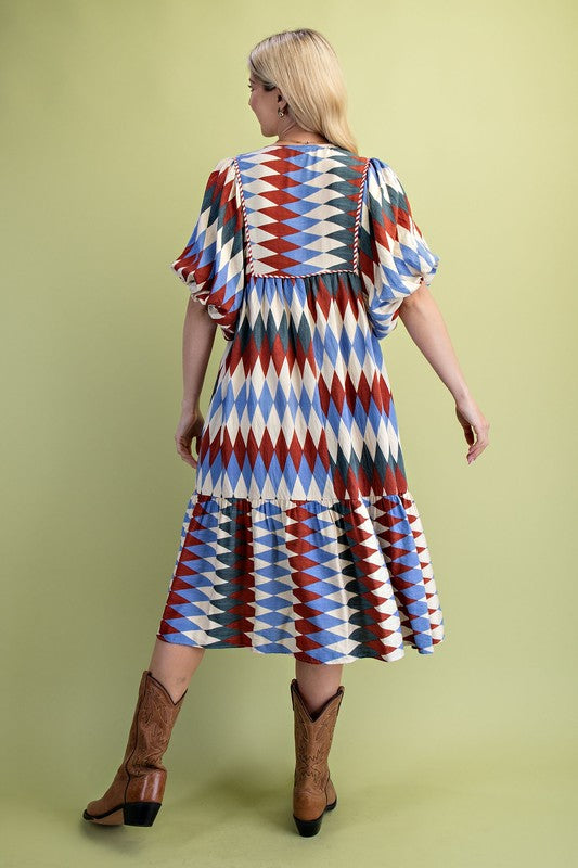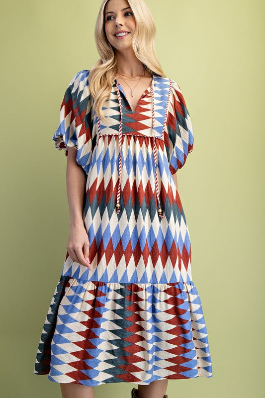 Make a bold yet effortless statement in this diamond print midi dress. Designed with striped binding accents and a beaded tassel tie neckline, this piece combines modern details with a timeless silhouette. The puff sleeves and tiered hem add movement and charm, while the relaxed fit keeps it easy and comfortable for all-day wear.