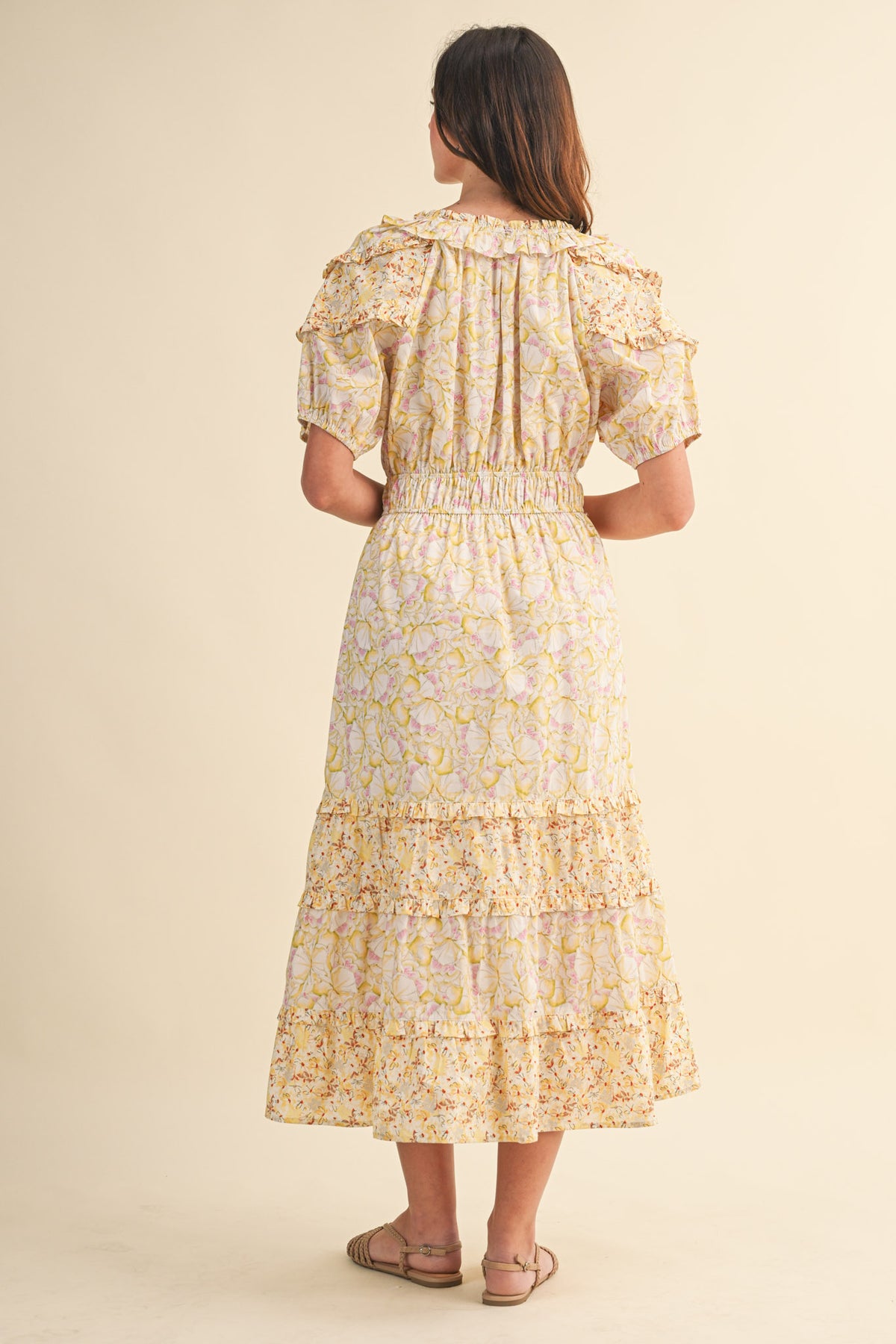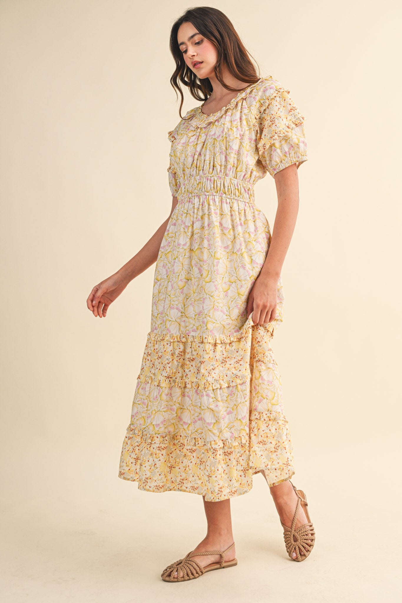 Soft and graceful, this mixed floral midi dress brings together delicate prints and ruffle accents for a beautifully layered look. The elastic waist creates a flattering shape while the tiered skirt adds gentle movement. Finished with puff sleeves, subtle ruffles, and convenient pockets, this dress is a lovely choice for warm days, gatherings, or moments when you want something feminine and effortlessly polished.