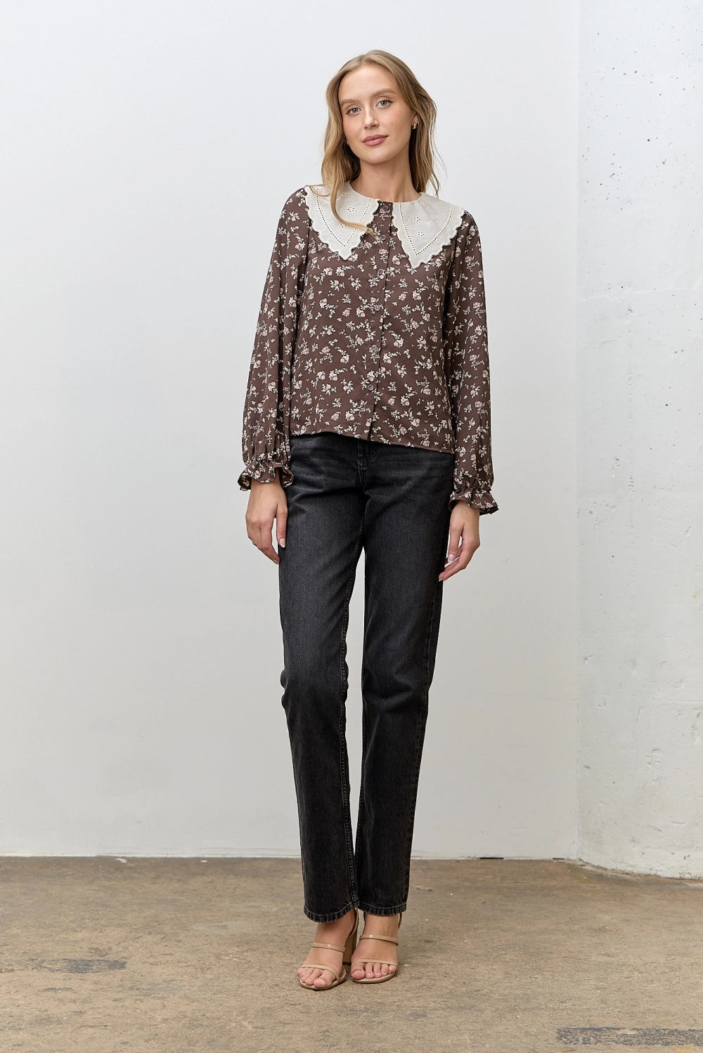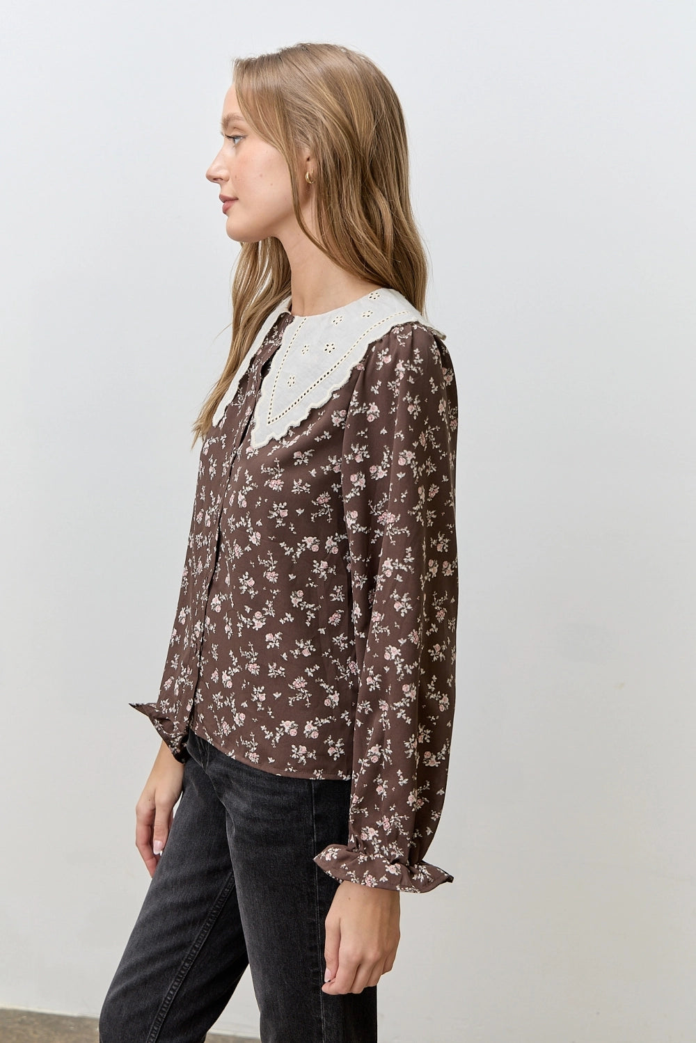Add timeless charm to your wardrobe with this feminine blouse, featuring a delicate floral print and an oversized embroidered Peter Pan collar. Designed with long sleeves and gathered cuffs, this blouse blends vintage-inspired elegance with everyday wearability.