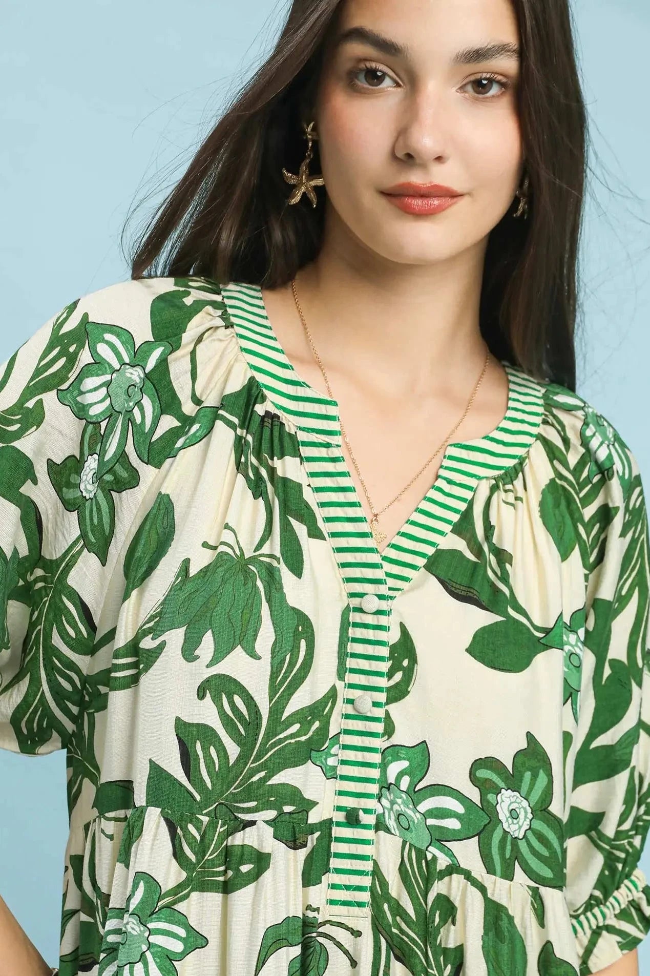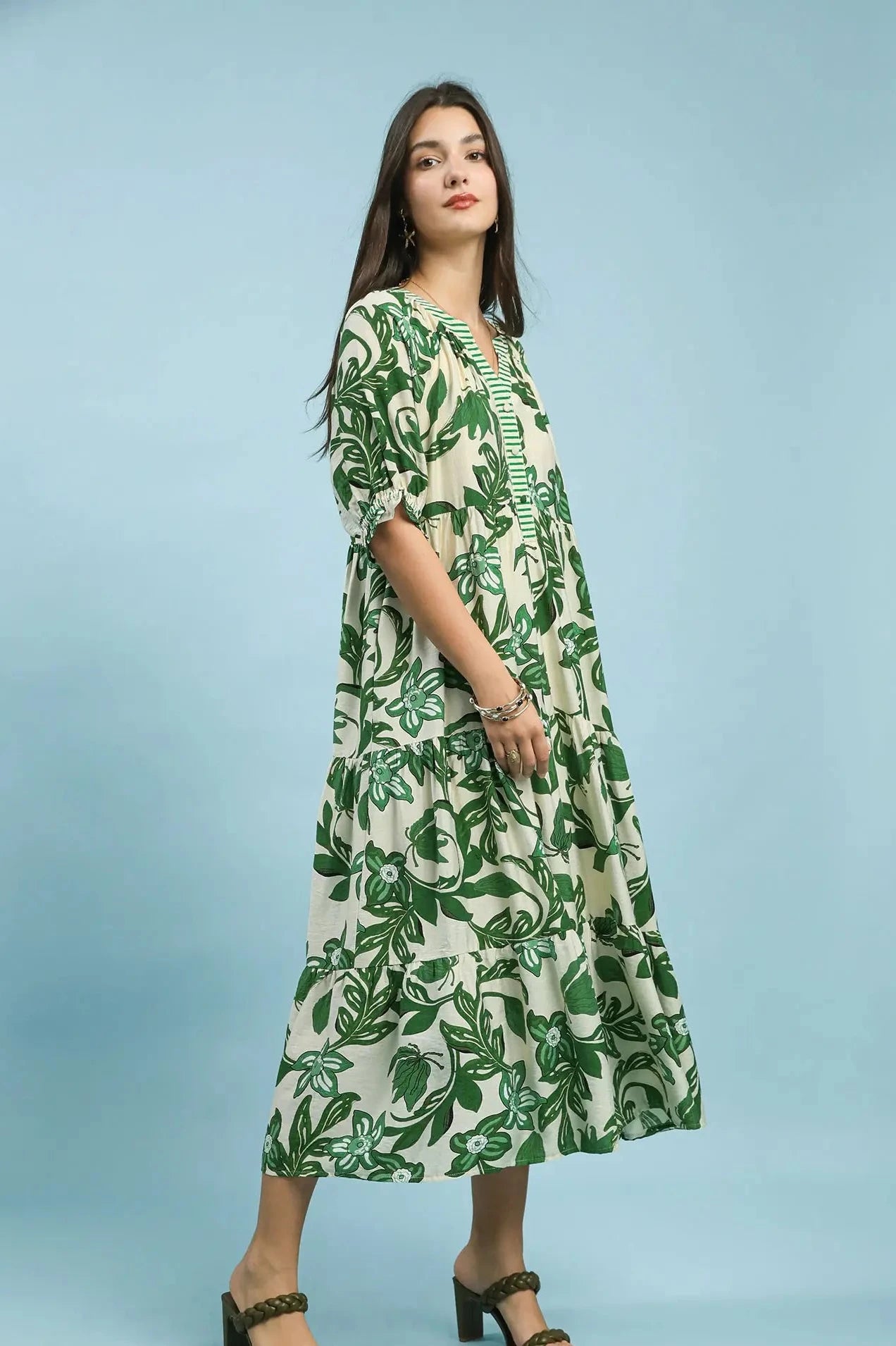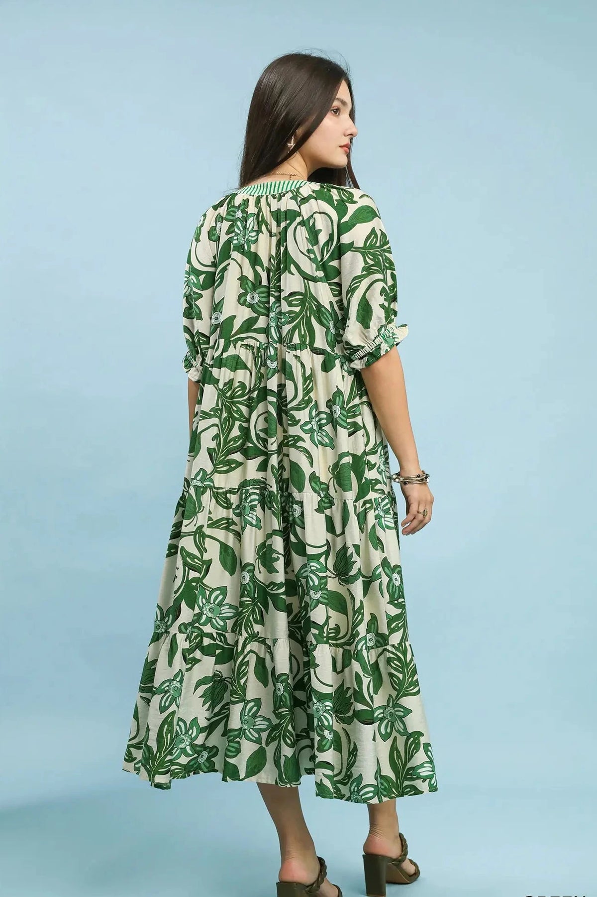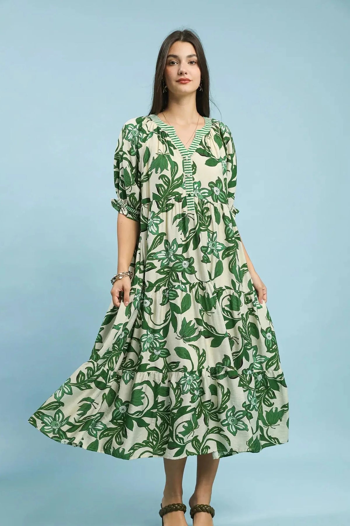 Fresh and breezy, this floral midi is perfect for warm-weather days, casual gatherings, or dressed up with wedges for an effortless, polished look.