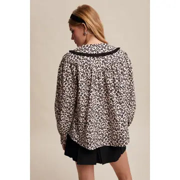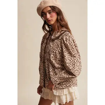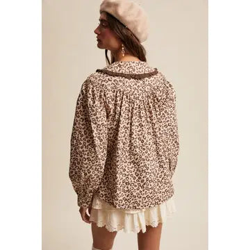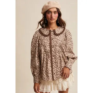 Playful yet chic, this leopard print blouse pairs doll-like details with bold, vintage-inspired style. The oversized Peter Pan collar with ruffle trim and lace-detailed button placket add sweet femininity, while the gathered yoke and puff sleeves create volume and movement. Designed in soft woven cotton, this top is versatile enough to style with denim skirts, tailored trousers, or layered under dresses and blazers for a statement-making look.
