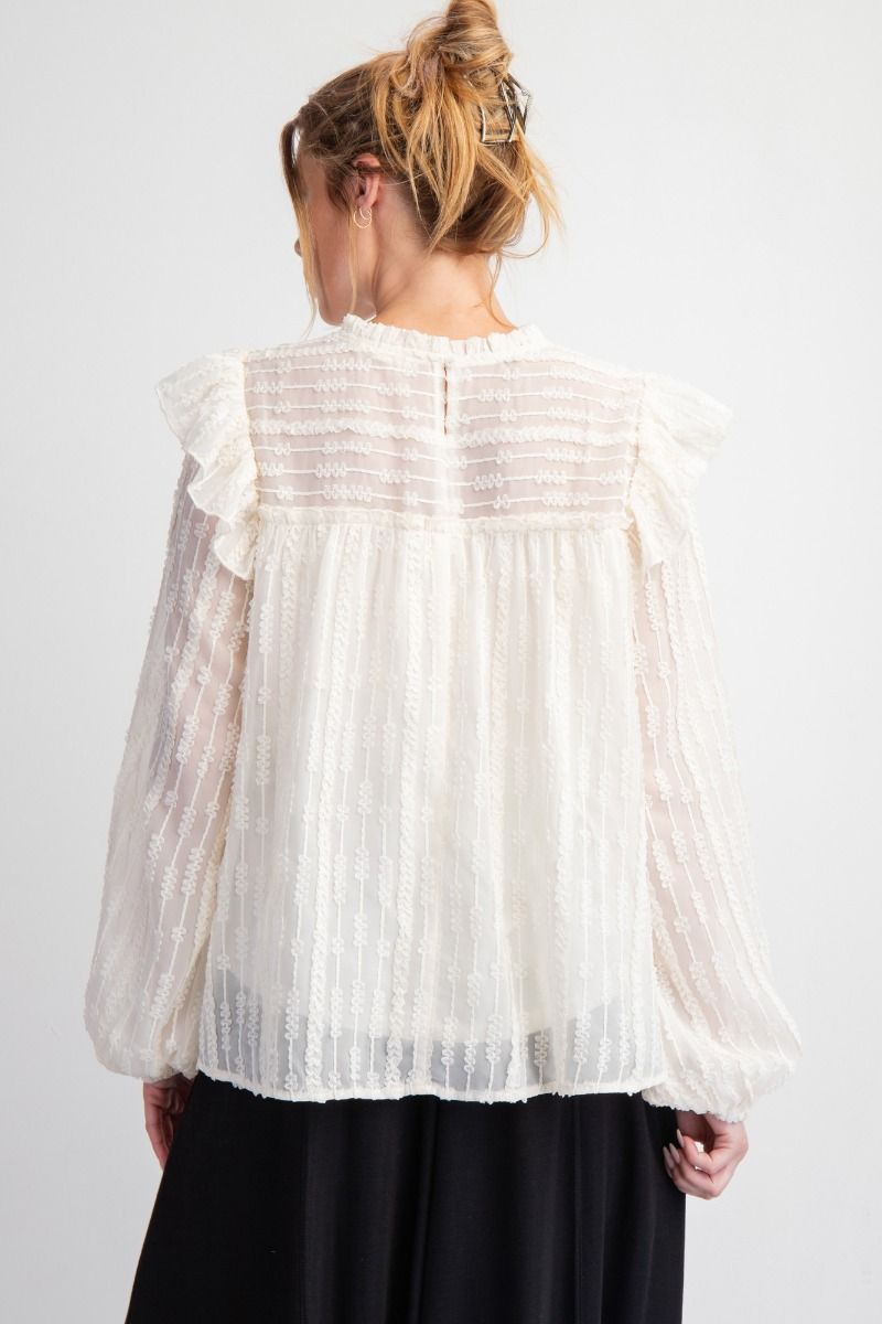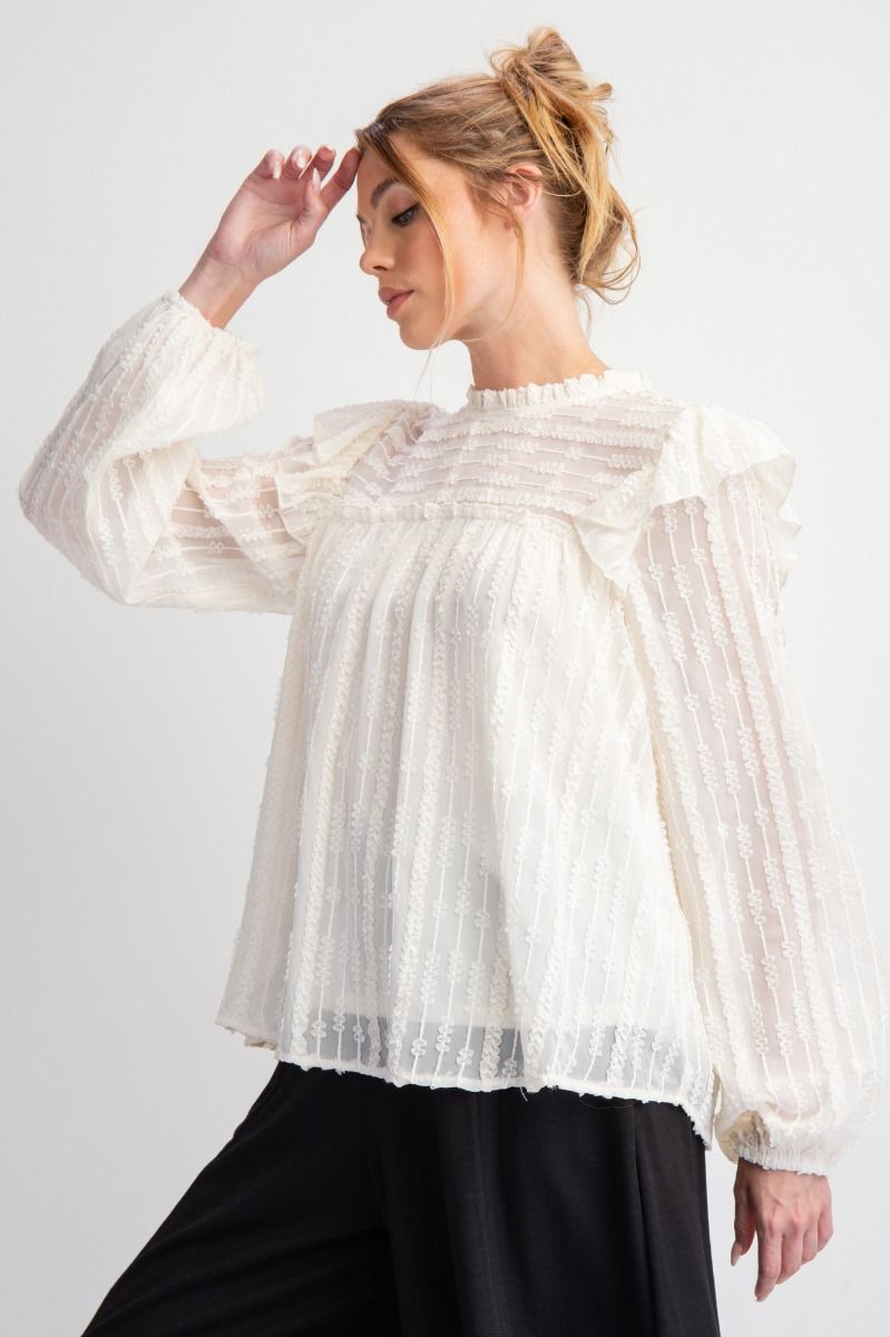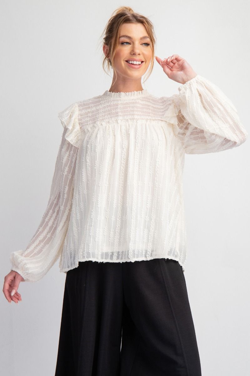 Soft, feminine, and effortlessly refined, the Laced Chiffon Blouse is designed to elevate everyday styling with delicate detail and graceful movement. Crafted from lightweight chiffon with an intricate lace pattern throughout, this blouse features a ruffled mock neckline and long bubble sleeves that add dimension without feeling overdone. The relaxed, flowy silhouette drapes beautifully, making it easy to wear tucked in or left loose for a polished yet comfortable look that transitions seamlessly from day to evening.