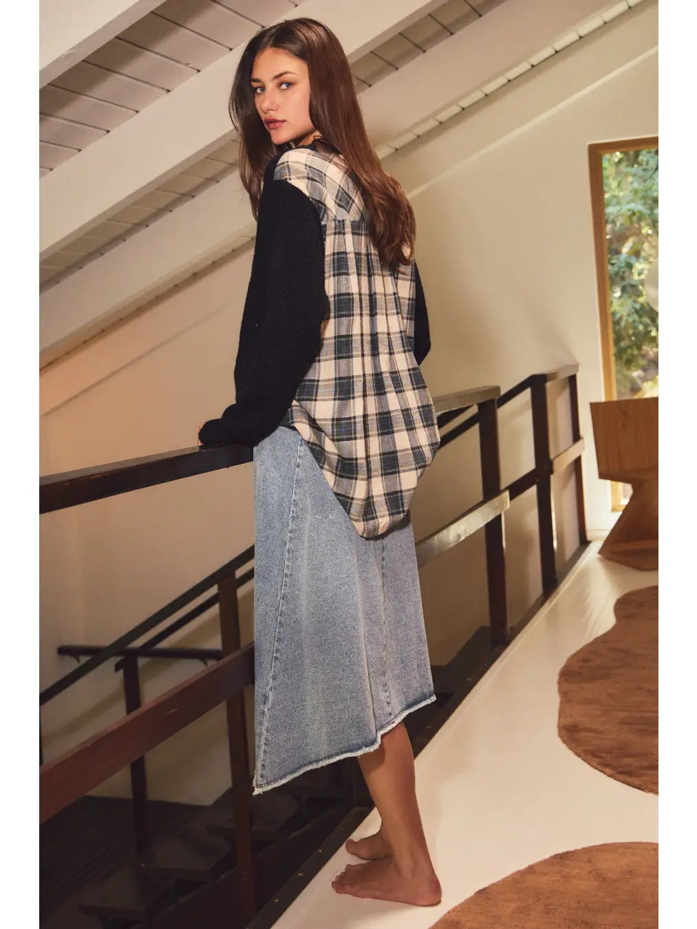 This patchwork midi skirt blends effortless comfort with bold, artistic style. The mix of plaid and denim gives it a playful yet elevated feel—perfect for creating standout everyday looks with minimal effort.