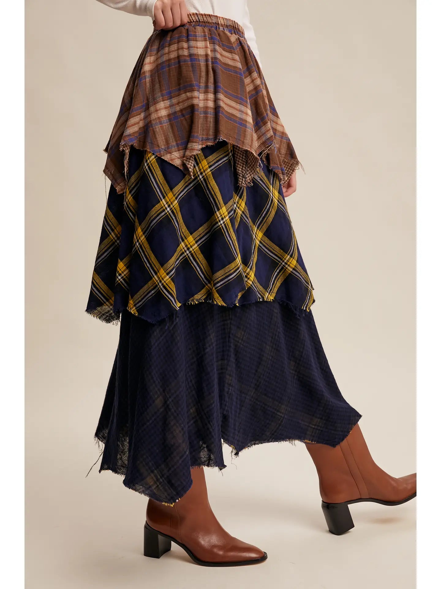A striking fusion of rustic charm and modern edge, this layered mixed plaid skirt adds texture and movement to any outfit. Crafted from soft woven cotton, it features three asymmetrical plaid tiers in contrasting colors, each finished with raw-edge hems for an effortlessly undone look. The elastic waistband ensures a comfortable fit, while the full-length silhouette pairs perfectly with boots or sneakers for year-round wear.