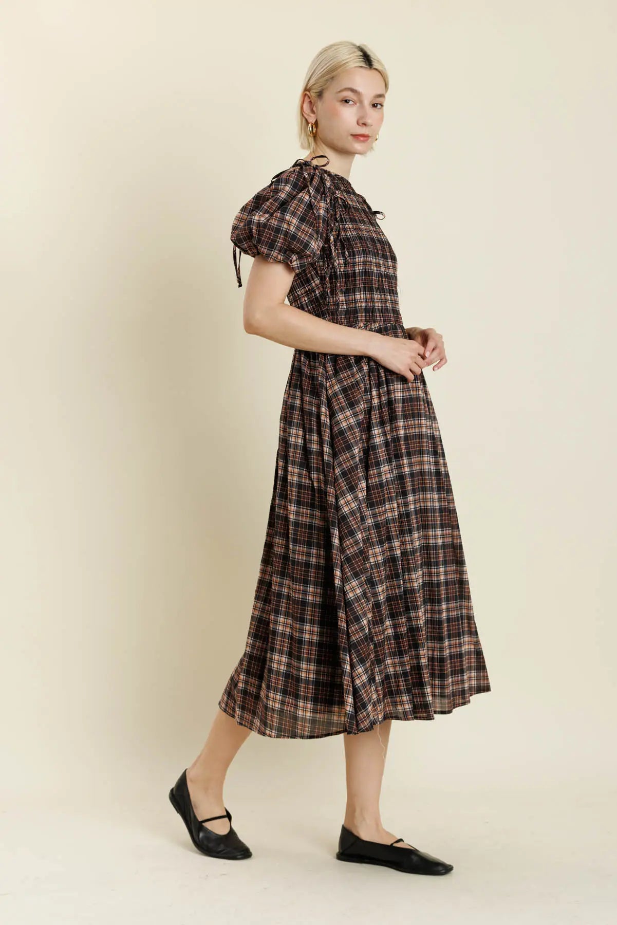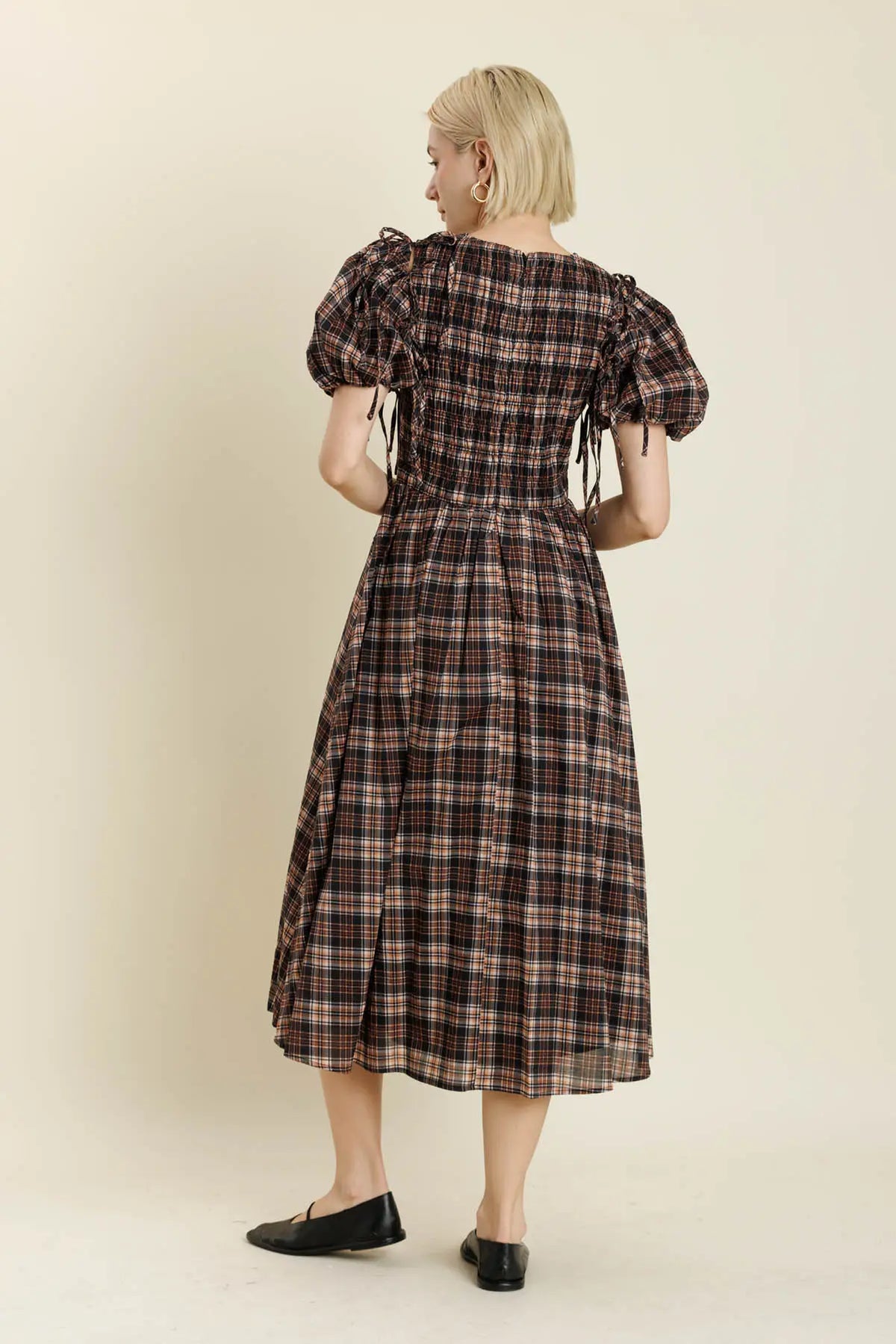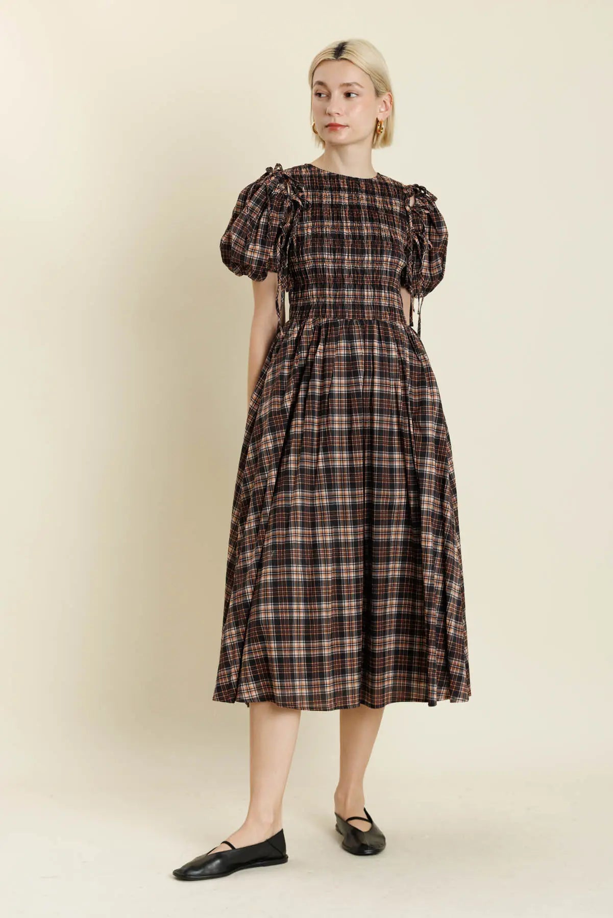 Perfectly blending timeless plaid with modern versatility, this midi dress features a smocked bodice that provides an effortlessly flattering fit. The detachable puff sleeves let you style it two ways, while the structured cotton fabric ensures comfort and elegance. Finished with side pockets and a classic silhouette, it’s a piece designed for both casual days and seasonal gatherings.