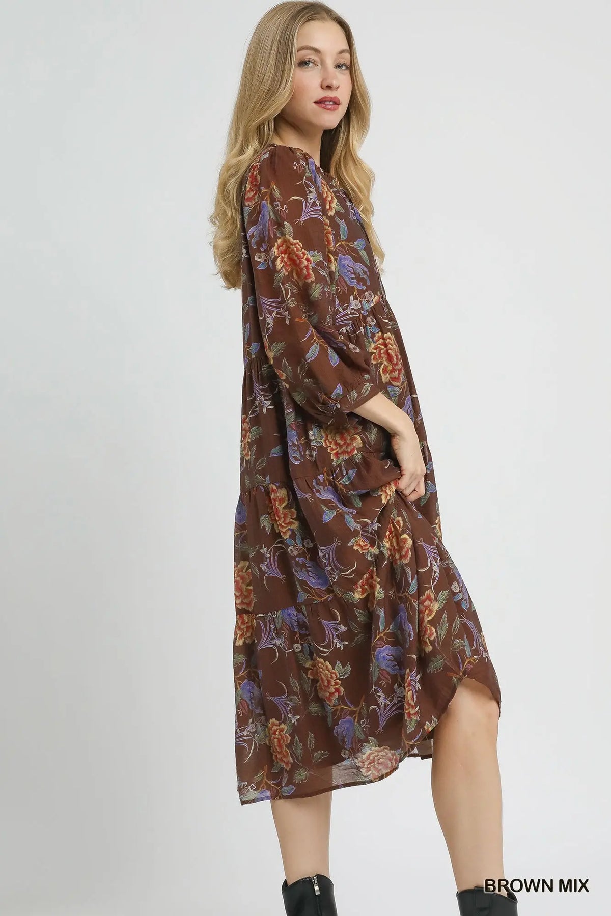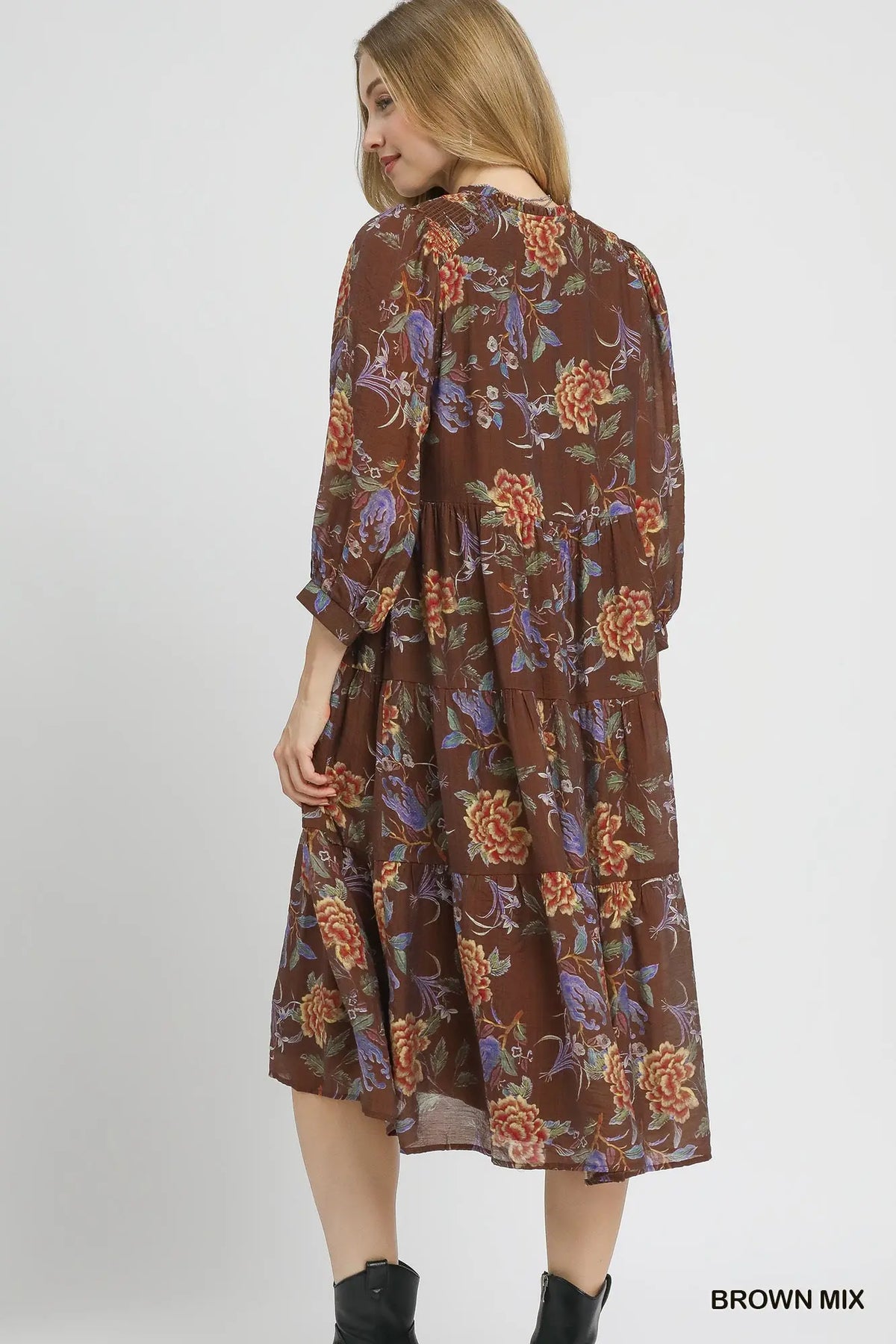 This Tiered Floral Boho Dress brings elegance with a free-spirited vibe. Featuring a v-neckline, 3/4 sleeves, and a flowy tiered skirt, it creates a flattering silhouette that moves beautifully. The abstract floral design adds a chic bohemian flair, while the lining ensures both comfort and modesty. Perfect for boutiques seeking versatile dresses that can be styled for everyday wear or dressed up for special occasions.