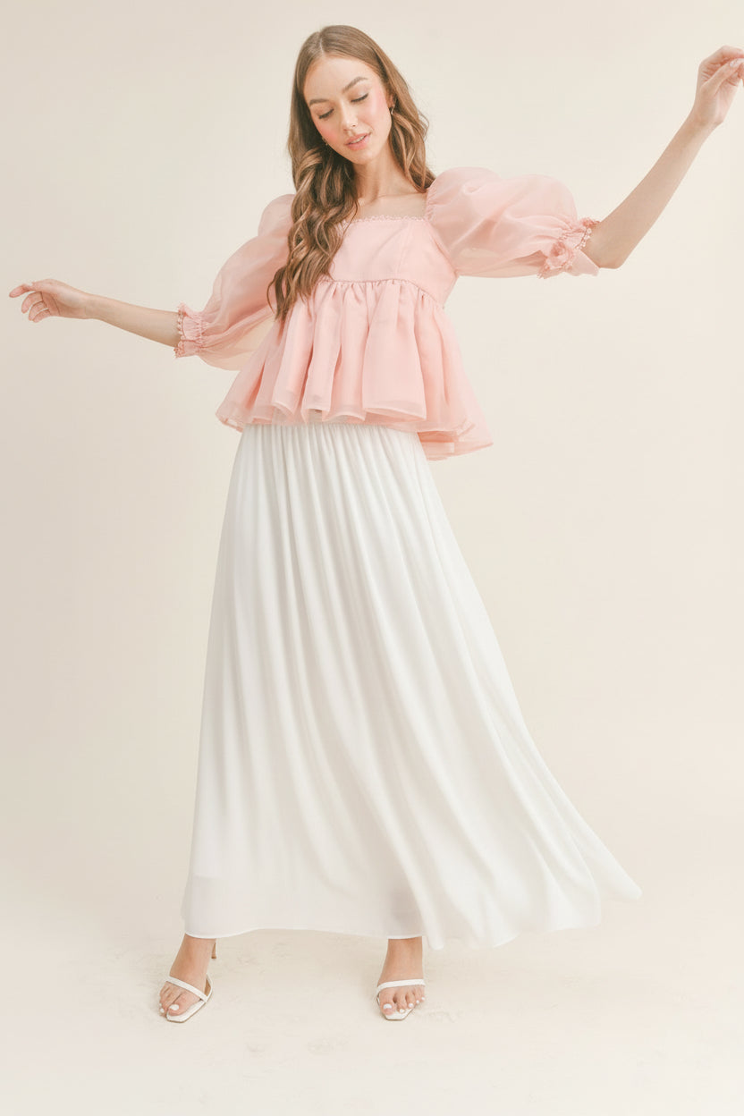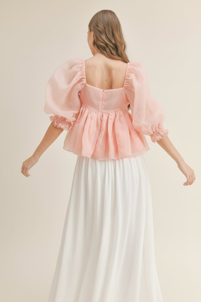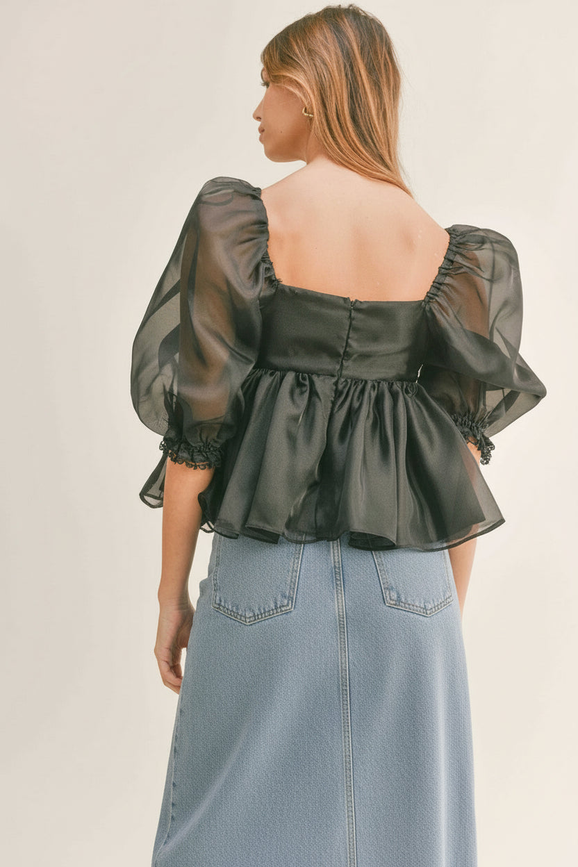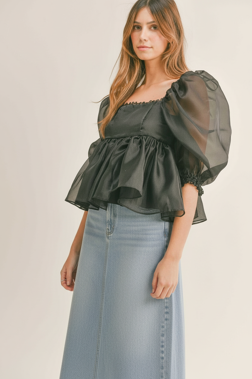 A beautifully dramatic statement piece, this organza babydoll top brings elegant volume and soft structure to any outfit. Designed with sheer puff 3/4 sleeves and a flowy, tiered silhouette, it gives a romantic yet modern feel. The square neckline adds a refined touch, while the back invisible zipper ensures a smooth, easy fit. Fully lined through the bodice, it’s perfect for pairing with denim, skirts, or dressy trousers for a standout look.