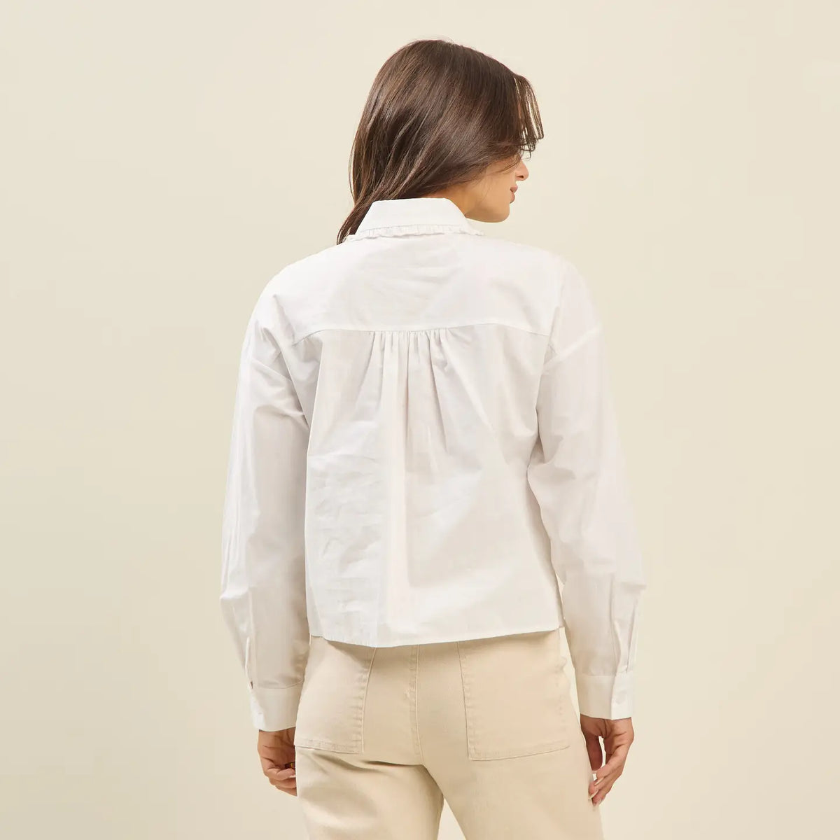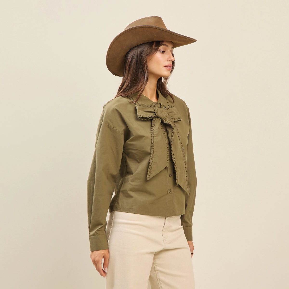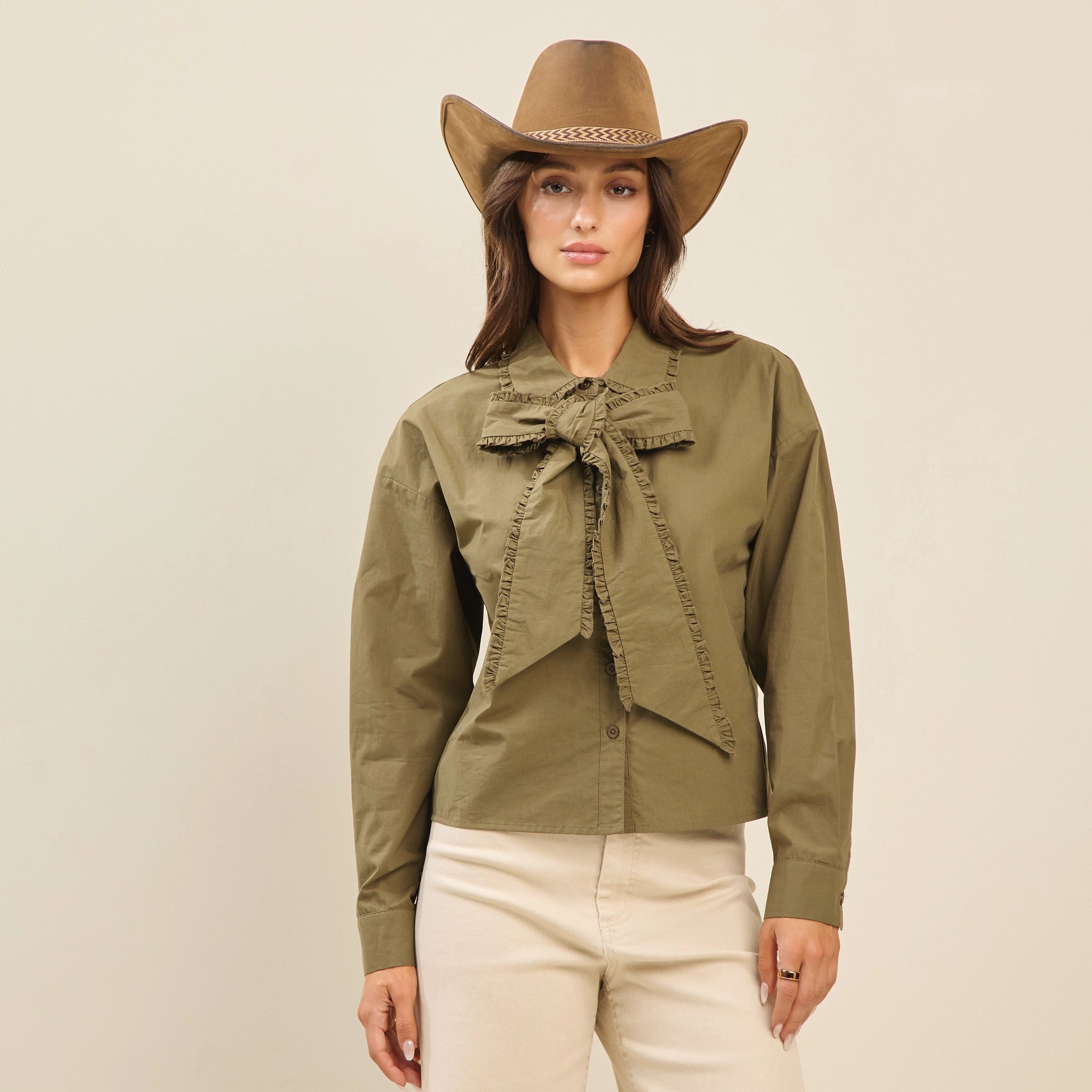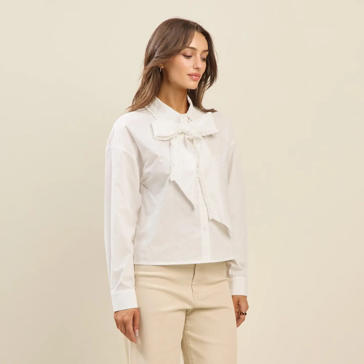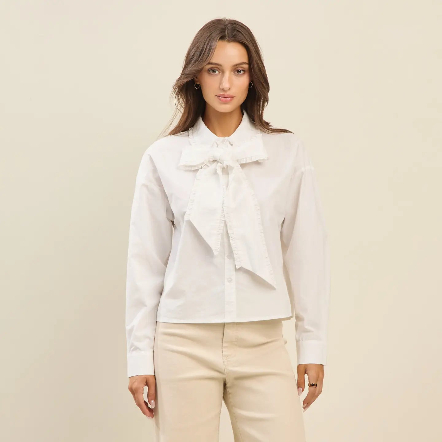Chic and versatile, this ruffled bow blouse adds a feminine twist to a timeless button-down silhouette. Designed in a soft cotton blend, it features long sleeves with button cuffs and a dramatic ruffled bow tie at the neckline for elevated style. Perfect for pairing with trousers, skirts, or denim, this blouse transitions seamlessly from office-ready to evening-out looks.