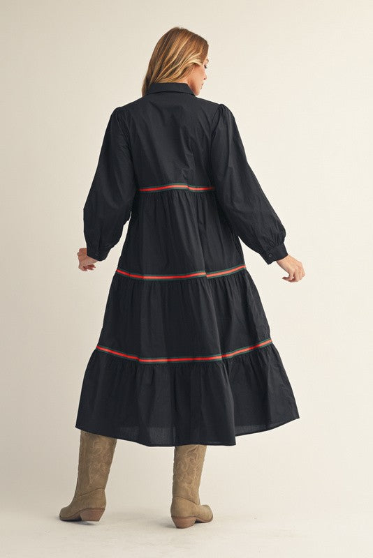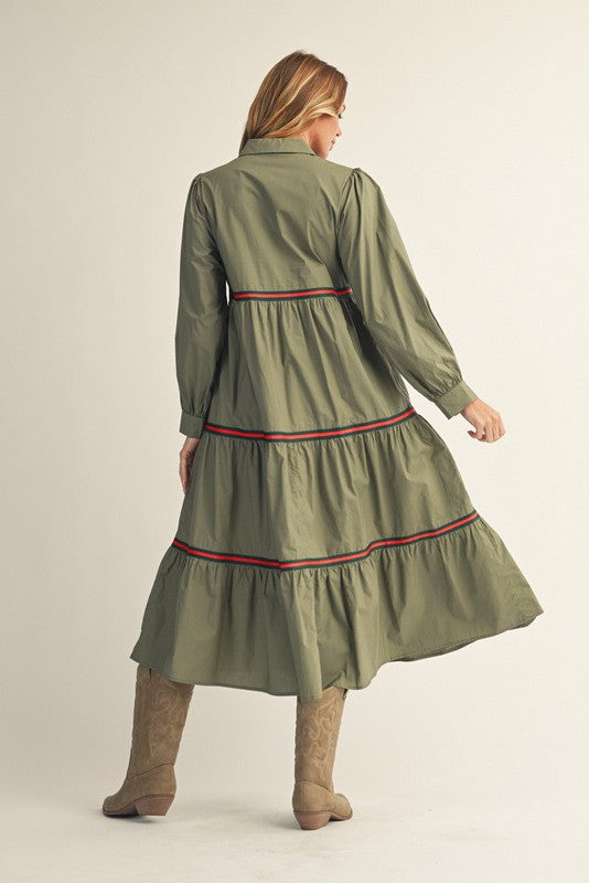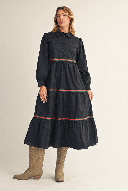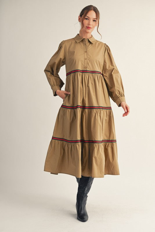Effortlessly combining structure and ease, this Striped Trim Tiered Midi Dress features a collared neckline and front button-up closure for a polished touch. The tiered silhouette is elevated with stripe tape trim accents, while side pockets add functionality. Crafted in breathable cotton, this dress is a versatile choice for casual days, boutique styling, or transitional wear across seasons.