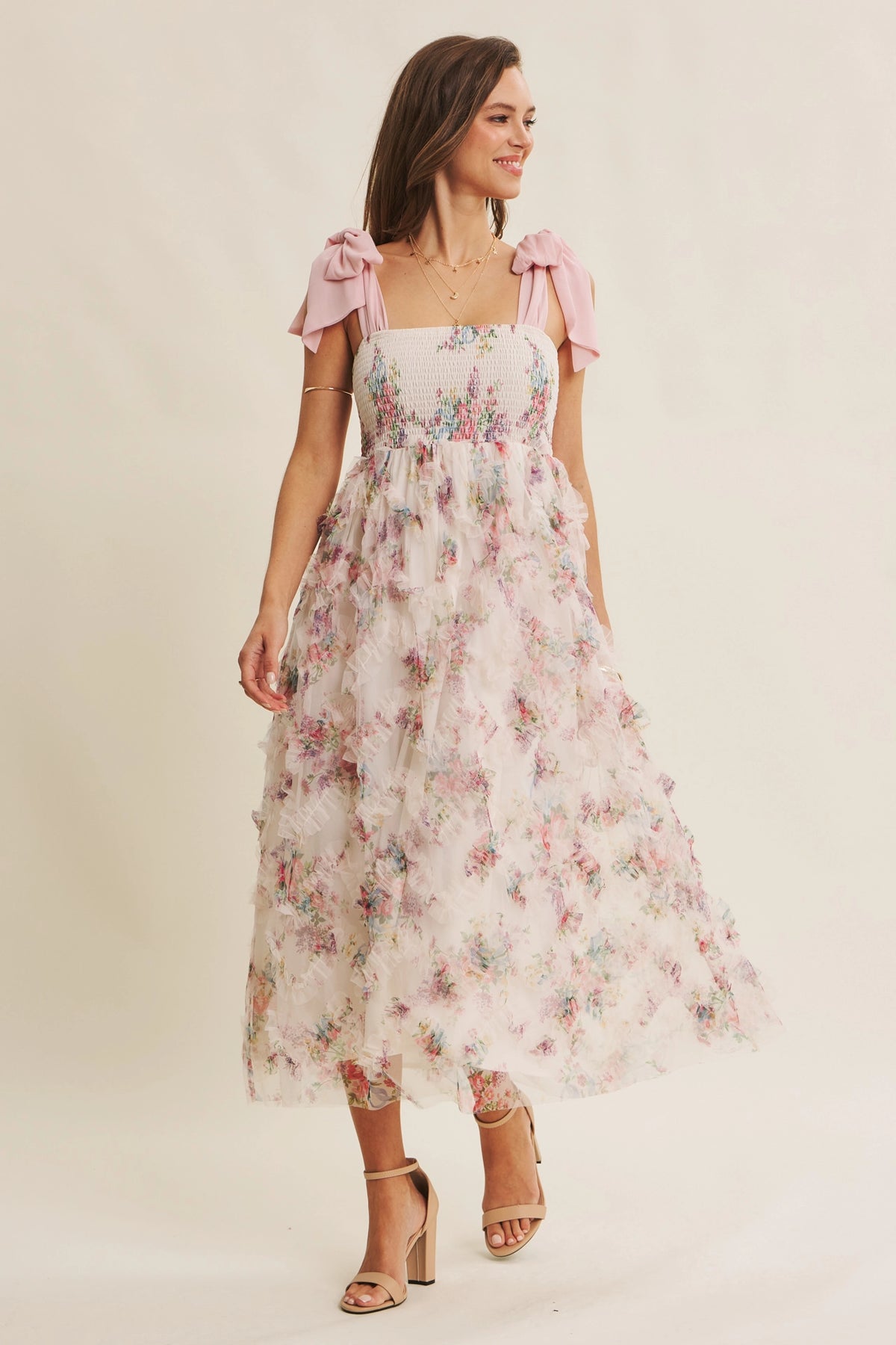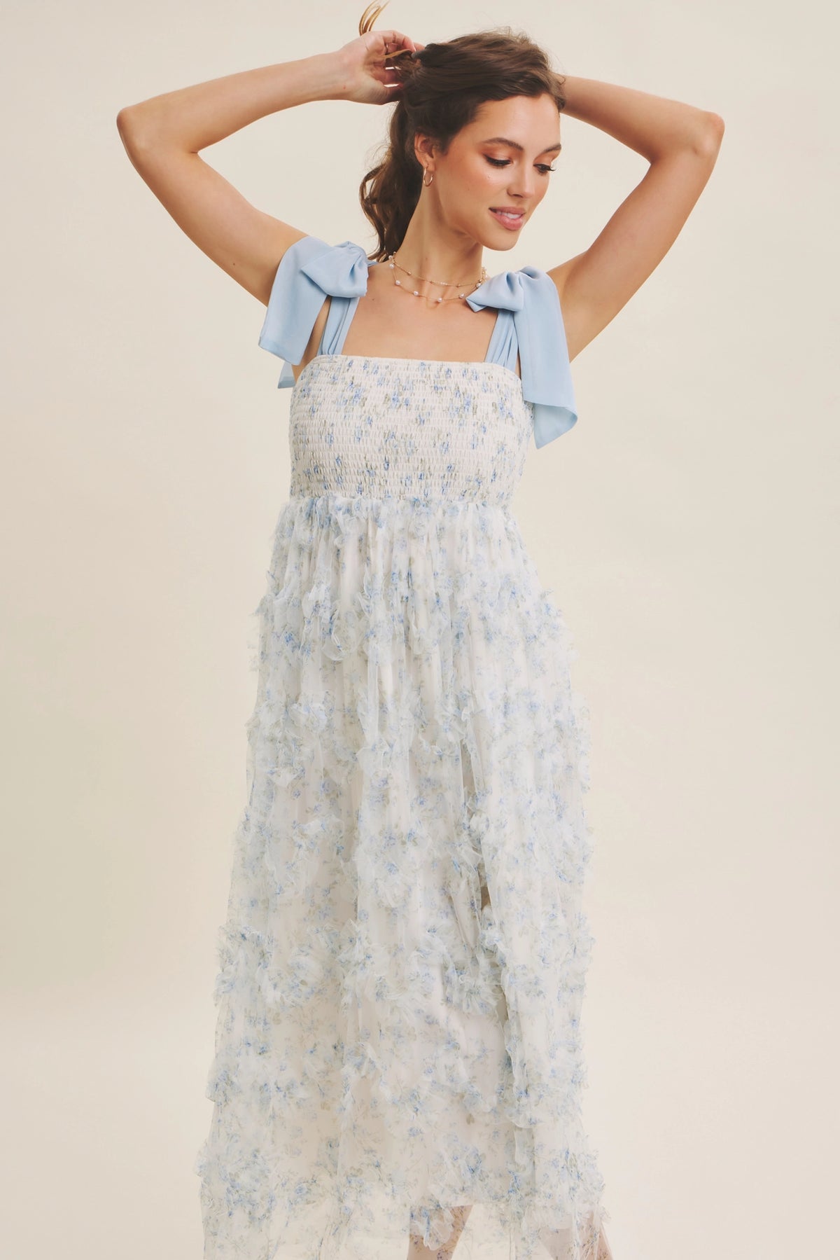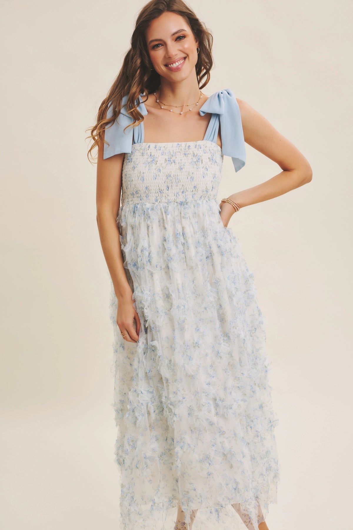 Designed for unforgettable moments, this floral mesh midi dress blends romance and whimsy with boutique-level detailing. The dimensional ruffle mesh overlay creates a soft, ethereal texture, while the smocked bust and long flowing skirt offer comfort and elegance in equal measure. Perfect for spring celebrations, family photos, or any occasion where you want to feel beautifully timeless.