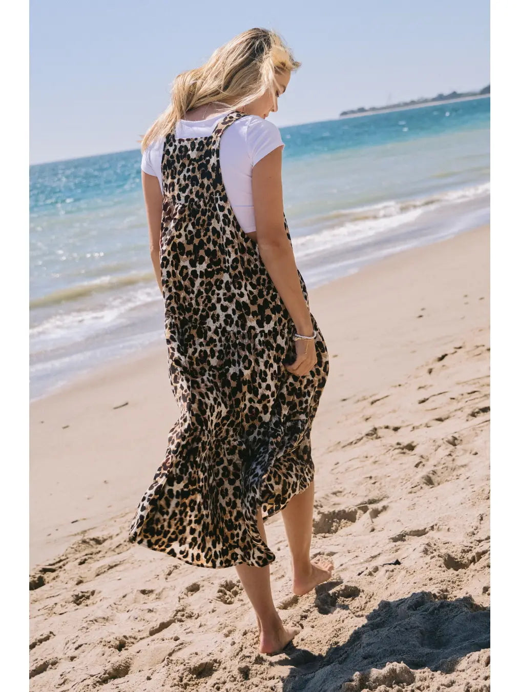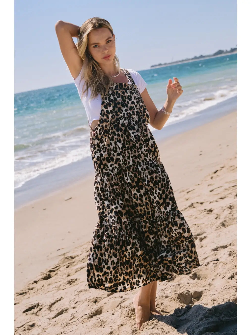 This leopard-print overall midi dress is designed for carefree days with effortless style. Featuring adjustable button straps, roomy side pockets, and a flowy tiered skirt, it layers beautifully over your favorite tees or blouses for endless outfit combinations. Its relaxed fit makes it perfect for a stroll on the beach, a casual day out, or an easy travel look.
