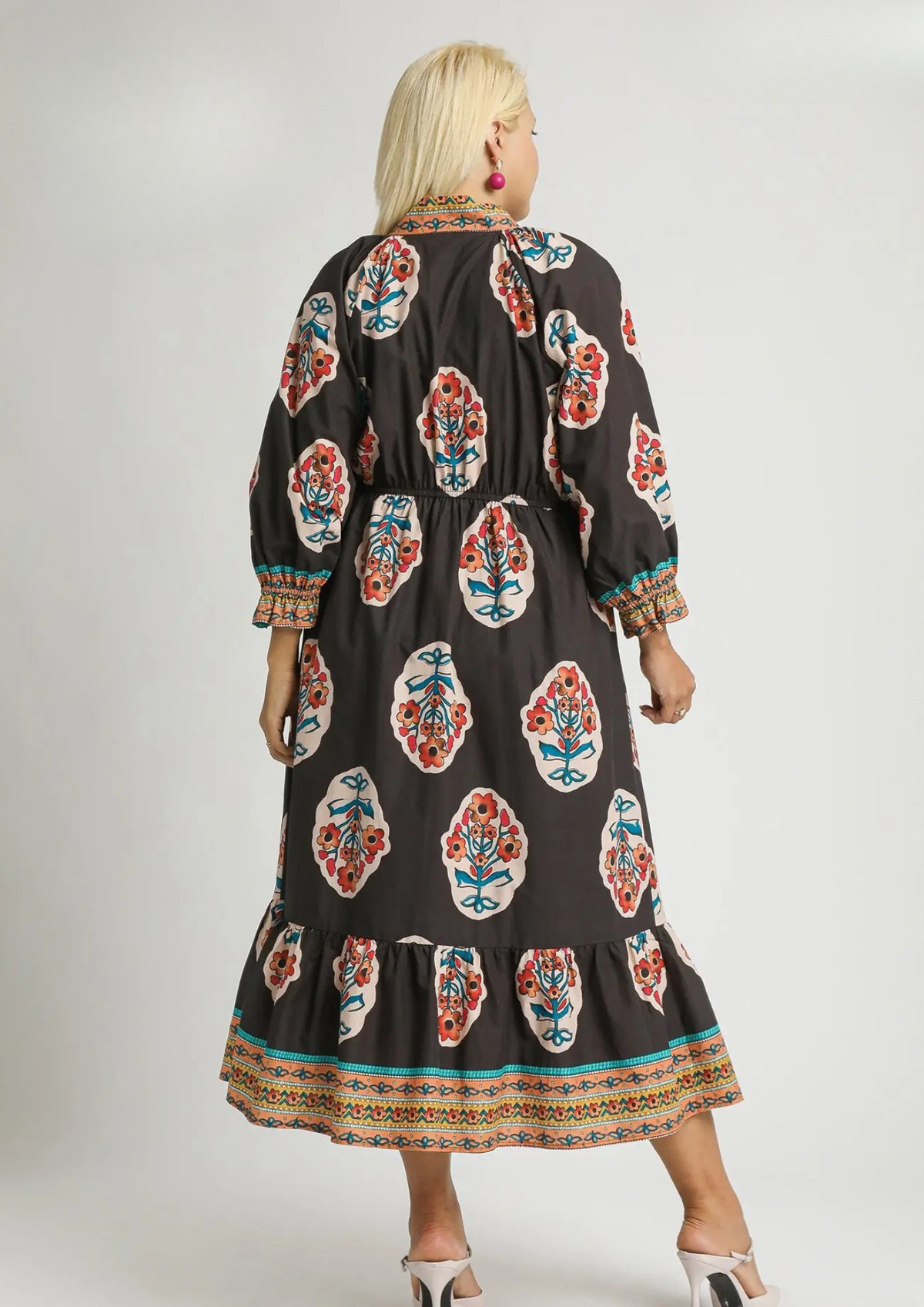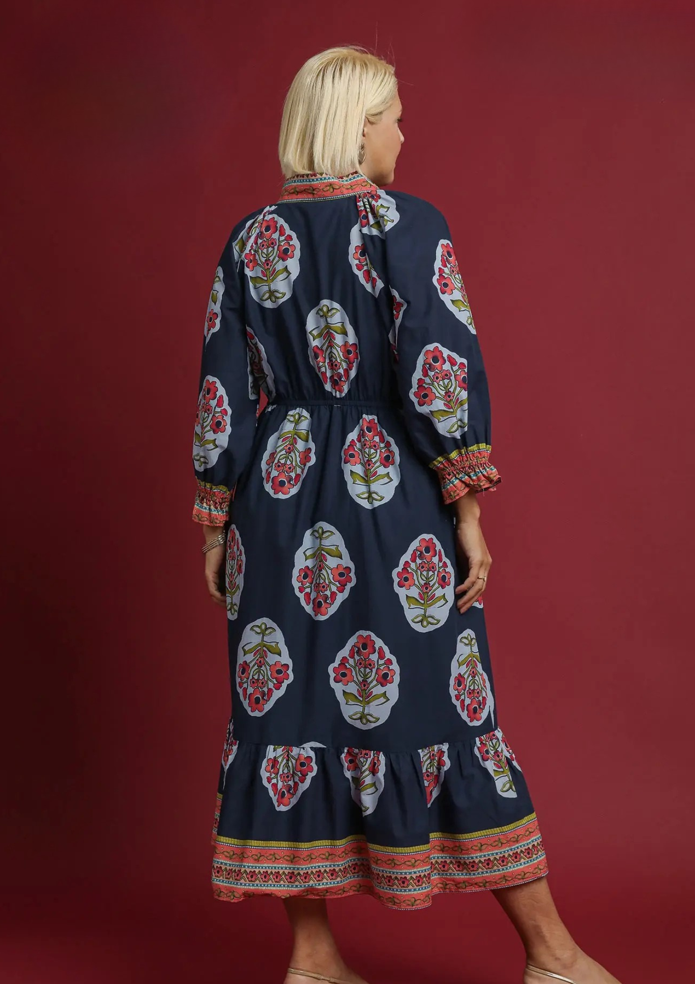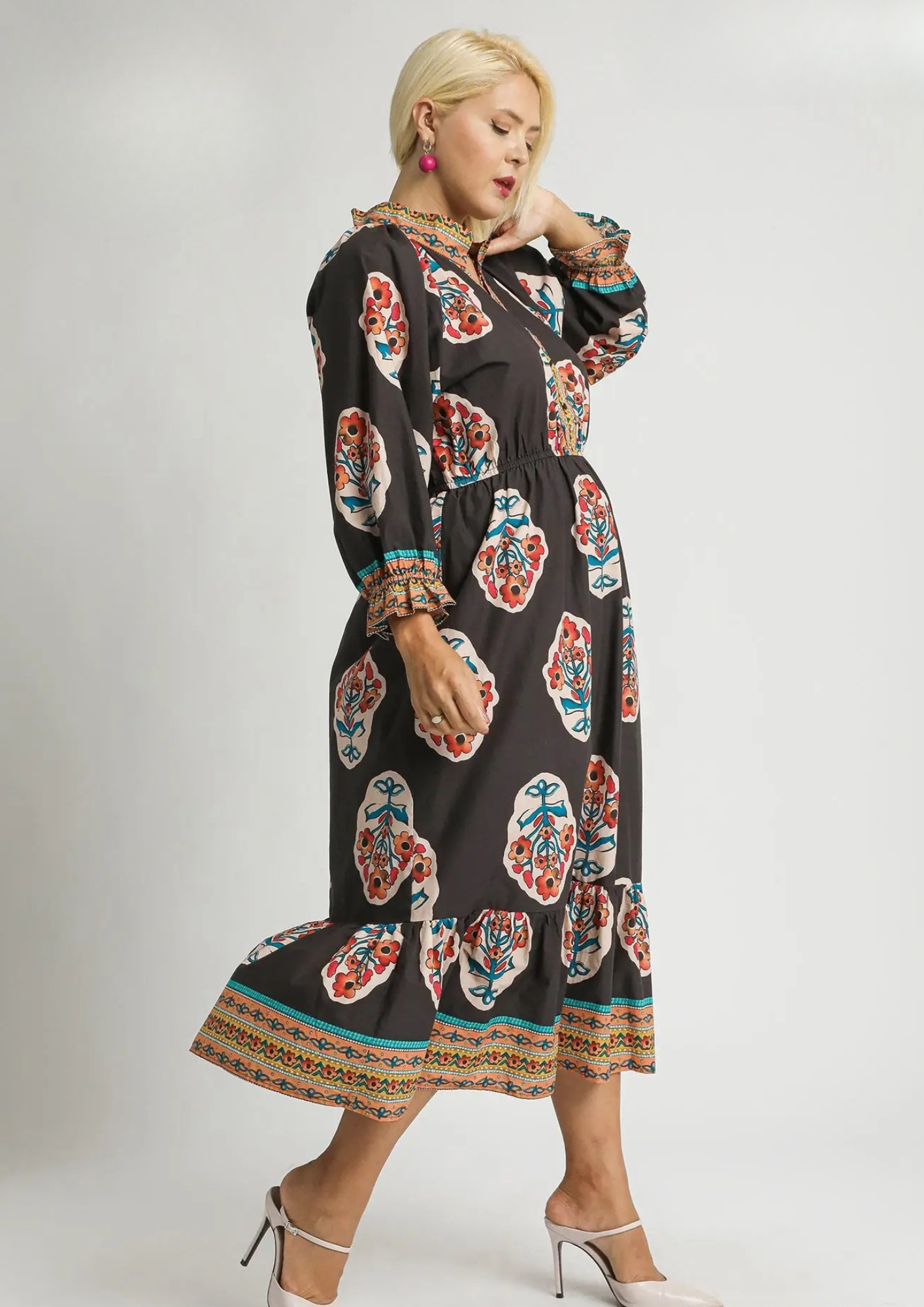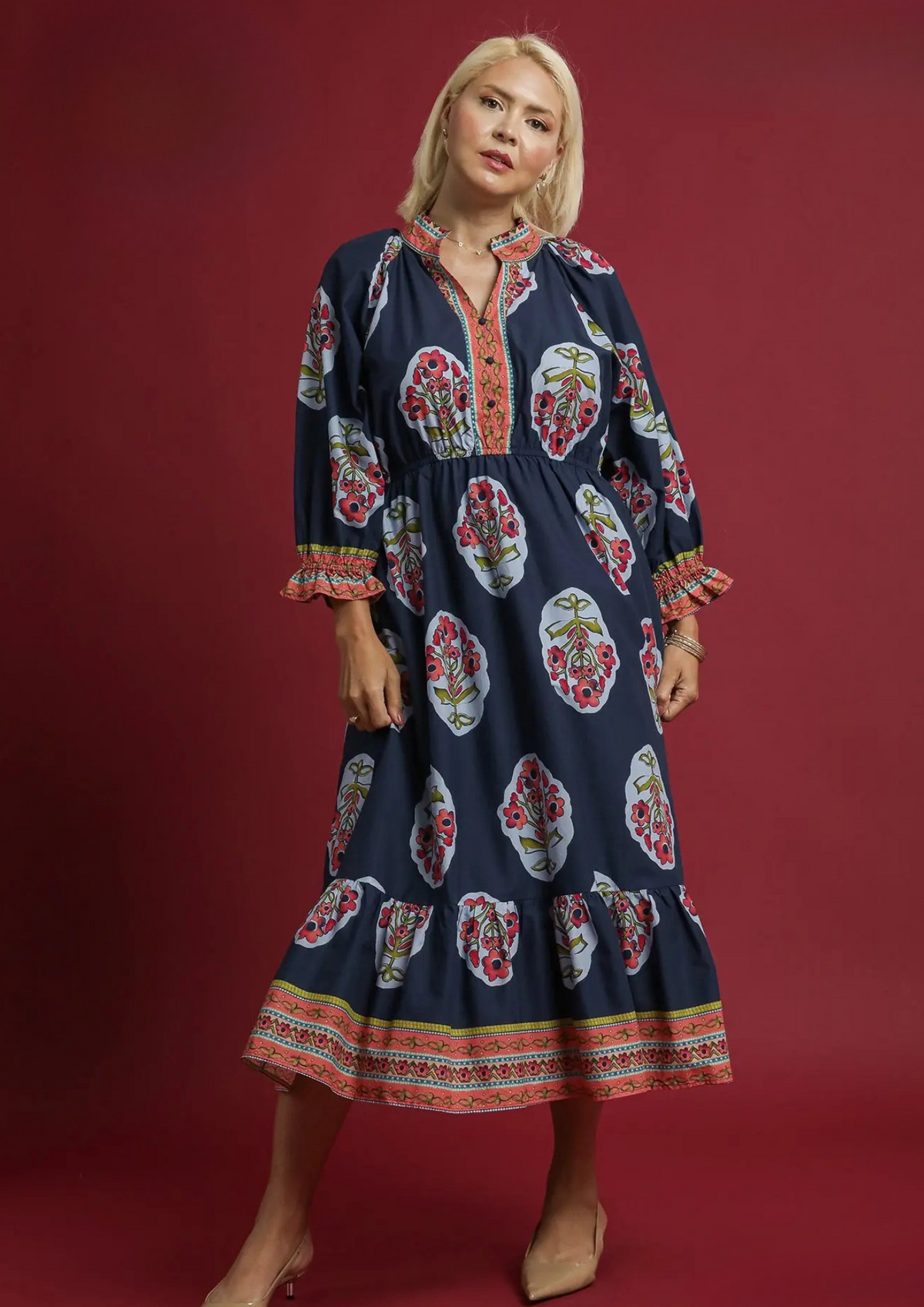 Effortlessly elegant, this airy linen maxi dress is adorned with delicate white floral embroidery that cascades gracefully across the entire silhouette. Designed with voluminous balloon sleeves, a structured collar, and a classic button-down front, it offers a refined yet relaxed trapeze fit on top. The skirt flows from a high waist into a breezy, loose shape, ensuring both comfort and freedom of movement. Thoughtful details like practical side pockets make it a perfect balance of beauty and functionality. Ideal for warm-weather days when you want timeless sophistication with everyday ease.