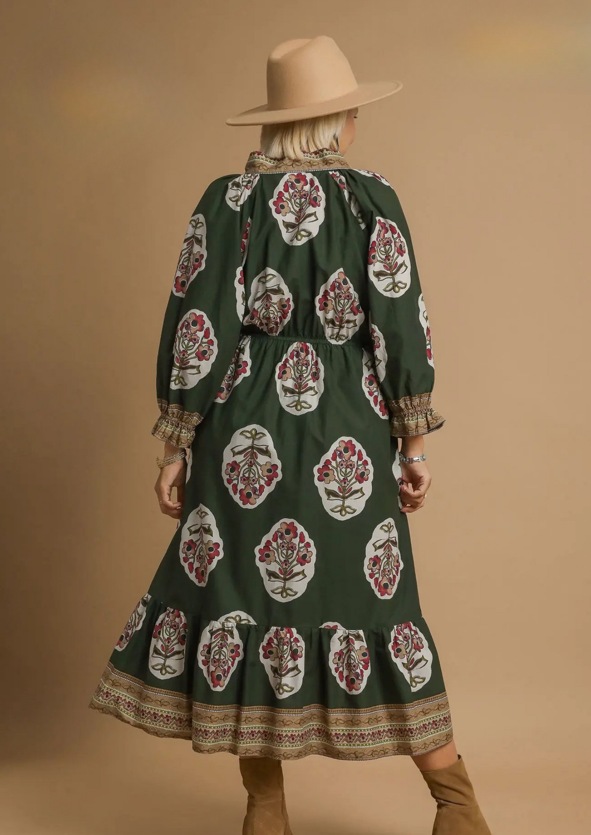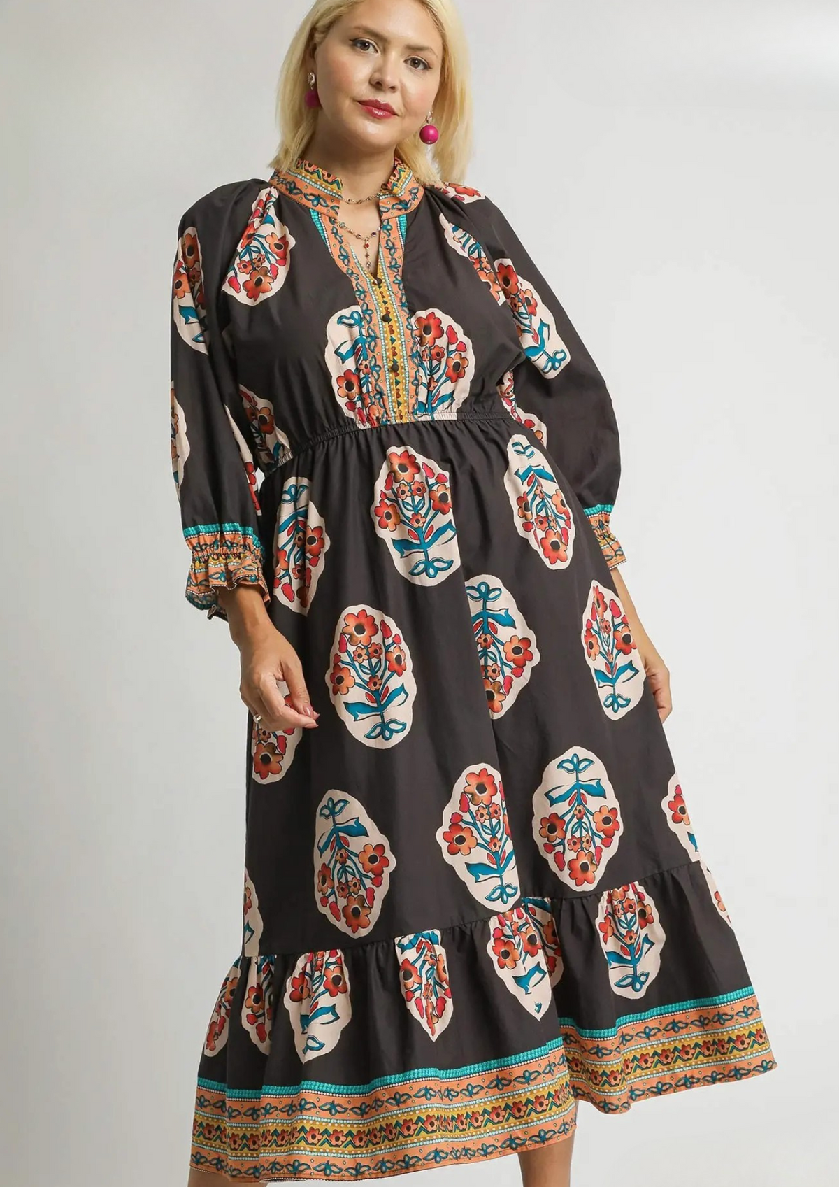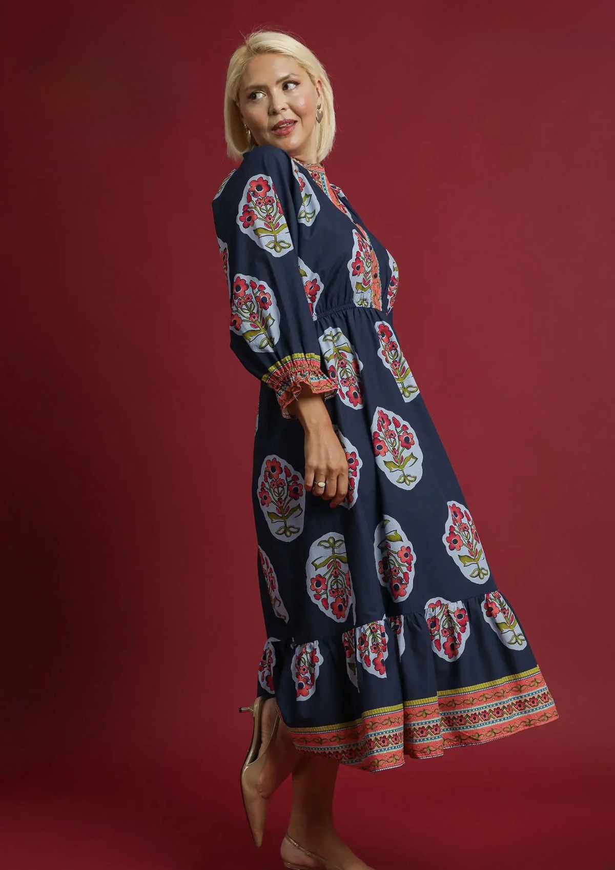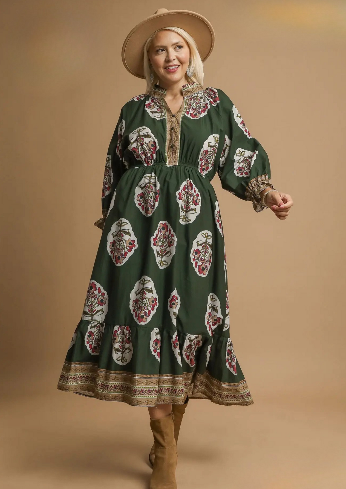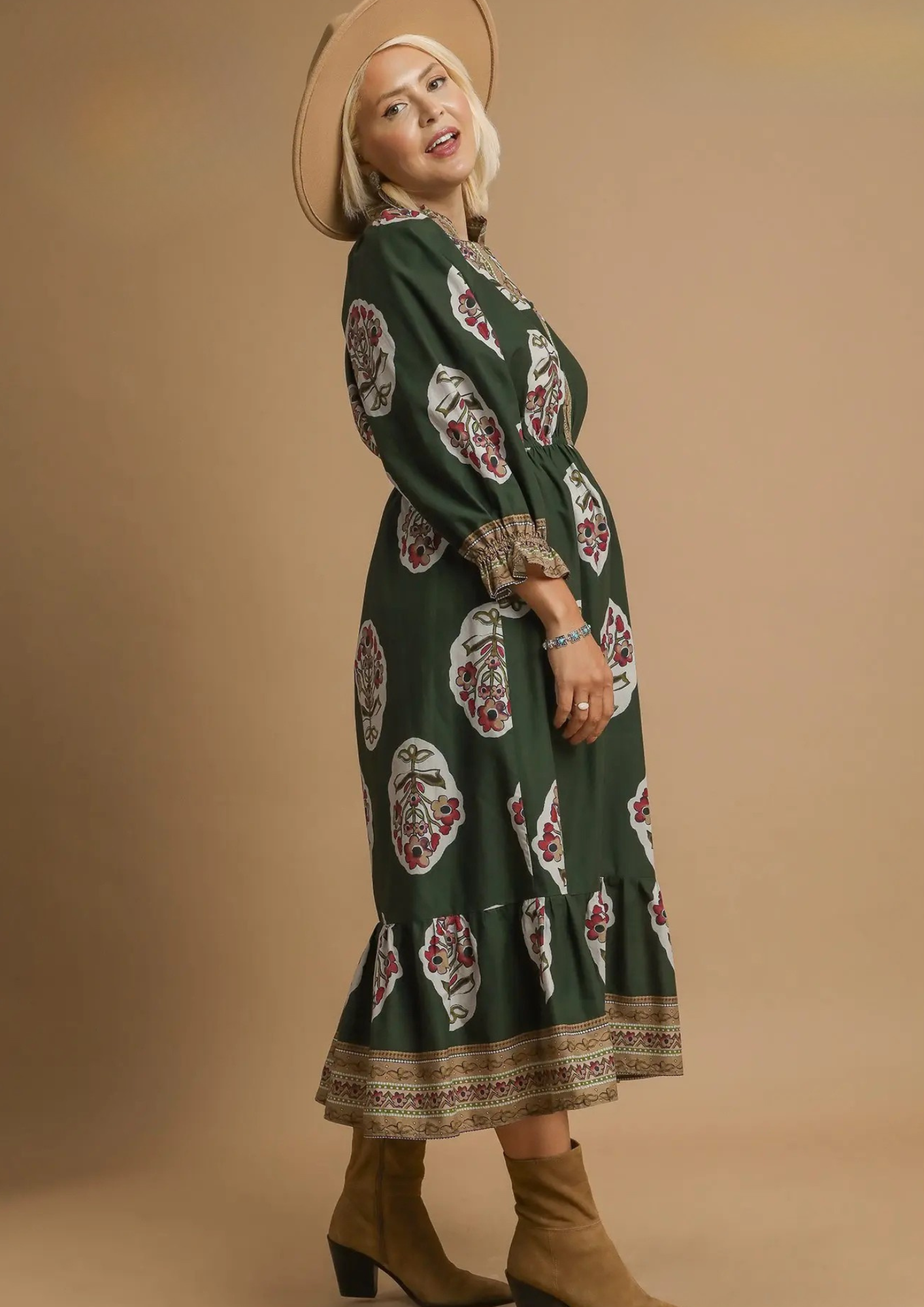 Effortlessly elegant, this airy linen maxi dress is adorned with delicate white floral embroidery that cascades gracefully across the entire silhouette. Designed with voluminous balloon sleeves, a structured collar, and a classic button-down front, it offers a refined yet relaxed trapeze fit on top. The skirt flows from a high waist into a breezy, loose shape, ensuring both comfort and freedom of movement. Thoughtful details like practical side pockets make it a perfect balance of beauty and functionality. Ideal for warm-weather days when you want timeless sophistication with everyday ease.