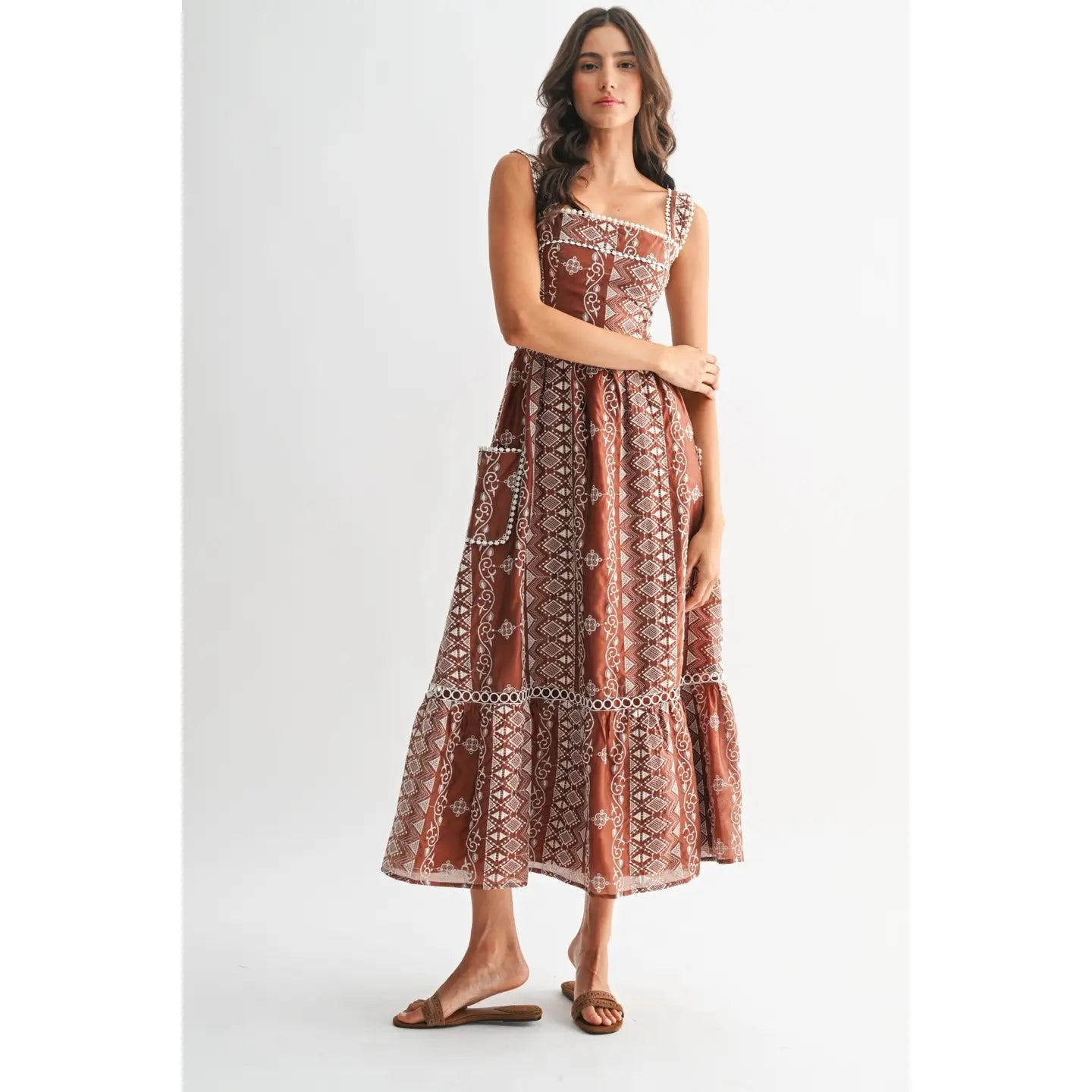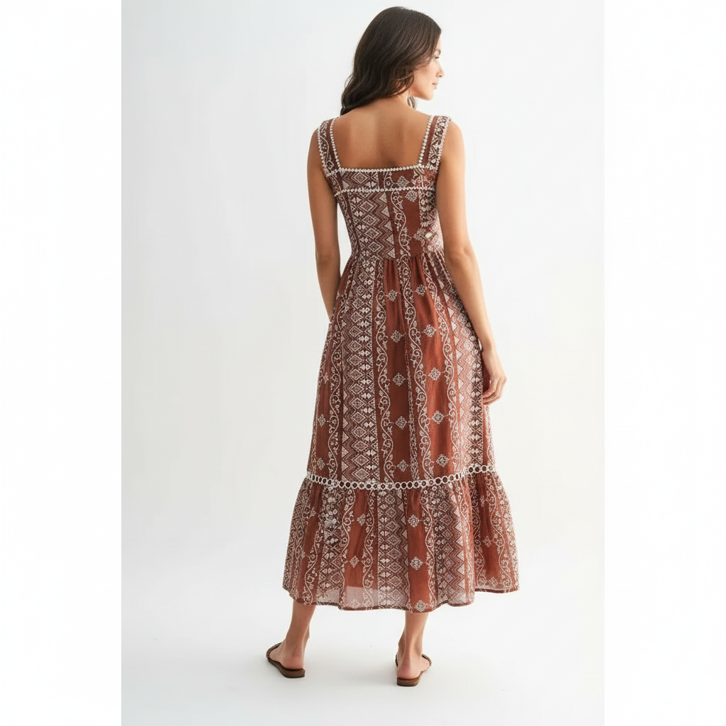 Bring effortless elegance to your wardrobe with this bohemian-inspired embroidered maxi dress. Crafted with intricate embroidered details, it features a flattering square neckline, sleeveless design, and a flowing tiered skirt for a timeless silhouette. A side pocket adds a touch of functionality, while the lightweight fabric ensures comfort for all-day wear. Perfect for sunny outings, casual gatherings, or vacation days, this dress blends artistry with ease.
