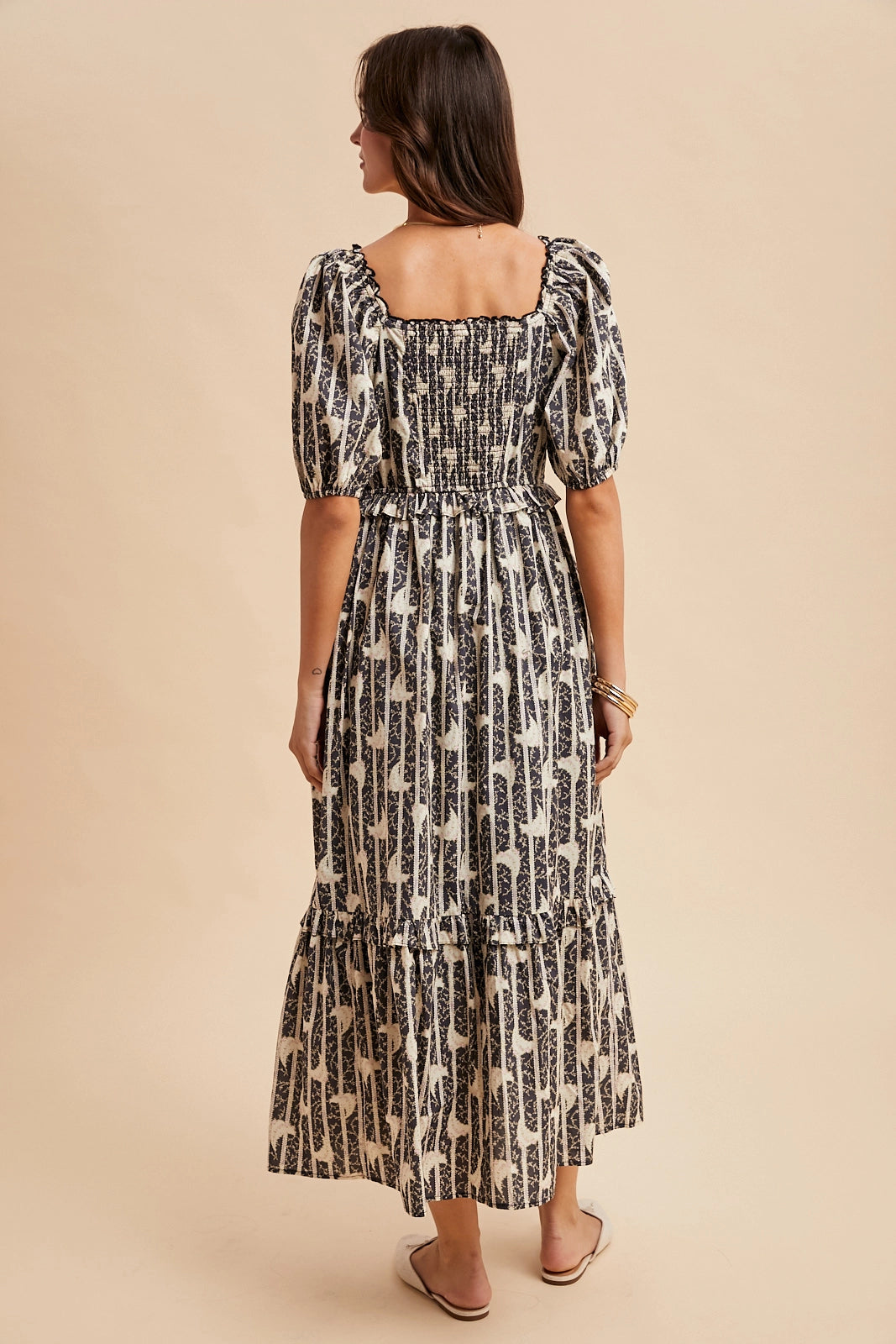 Crafted in soft cotton with a timeless square neckline, this puff sleeve dress blends everyday wearability with graceful detail. The smocked back offers a comfortable fit while the gathered waist with delicate ruffle trim adds femininity. A tiered skirt enhances movement and charm, while side pockets bring in a touch of functionality. Perfect for both casual days and dressed-up evenings, this piece is a versatile addition to any wardrobe.