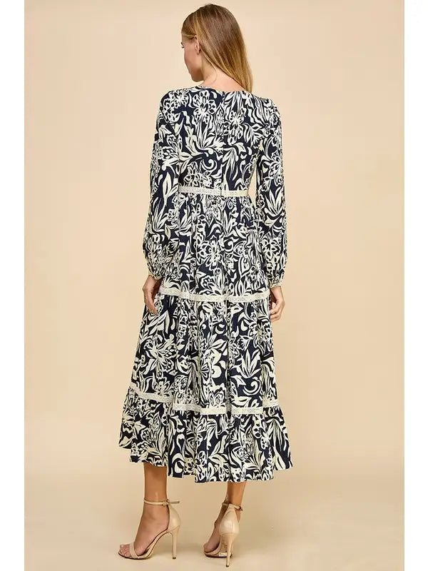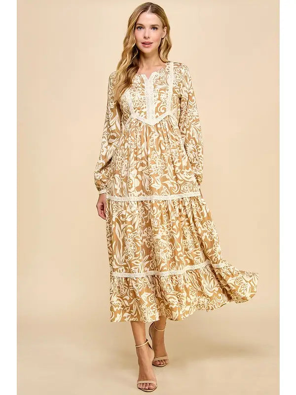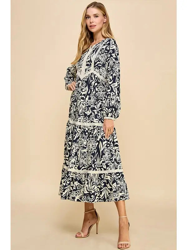 Elevate your wardrobe with the Lace Trim Floral Maxi Dress, a perfect blend of elegance and ease. The tropical-inspired print is complemented by delicate lace trim, adding dimension and charm. With its tiered maxi silhouette and long sleeves, this dress offers timeless sophistication for both daywear and special occasions.