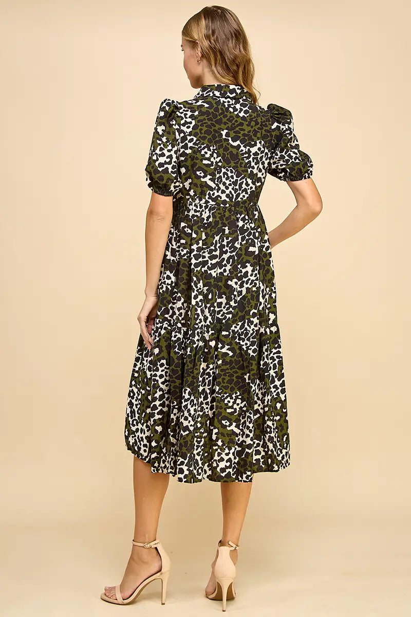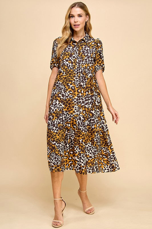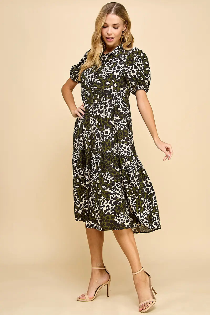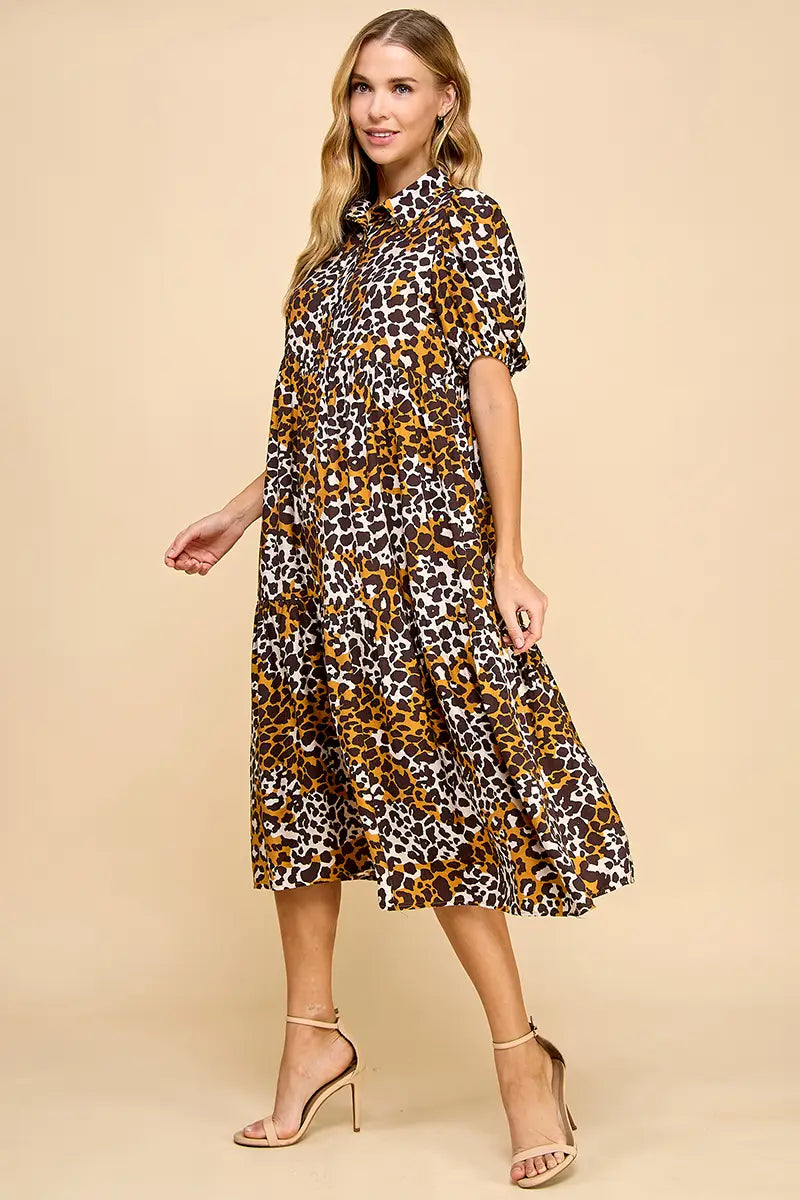 Make a statement in this Animal Print Collared Midi Dress, designed for both edge and elegance. Featuring a collared neckline, puff sleeves, and a tiered skirt, it strikes the perfect balance of chic and playful. Pair it with heels for a polished look or style it with flats for everyday wear.