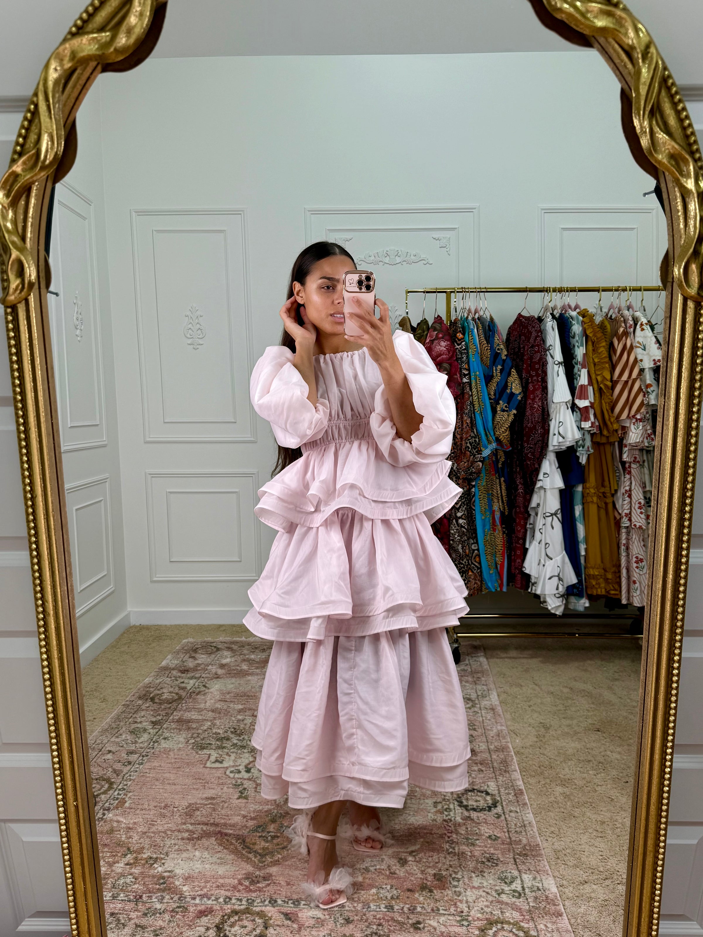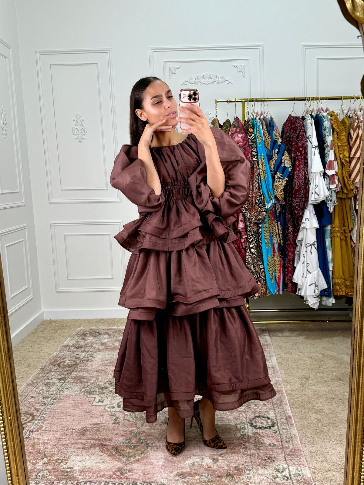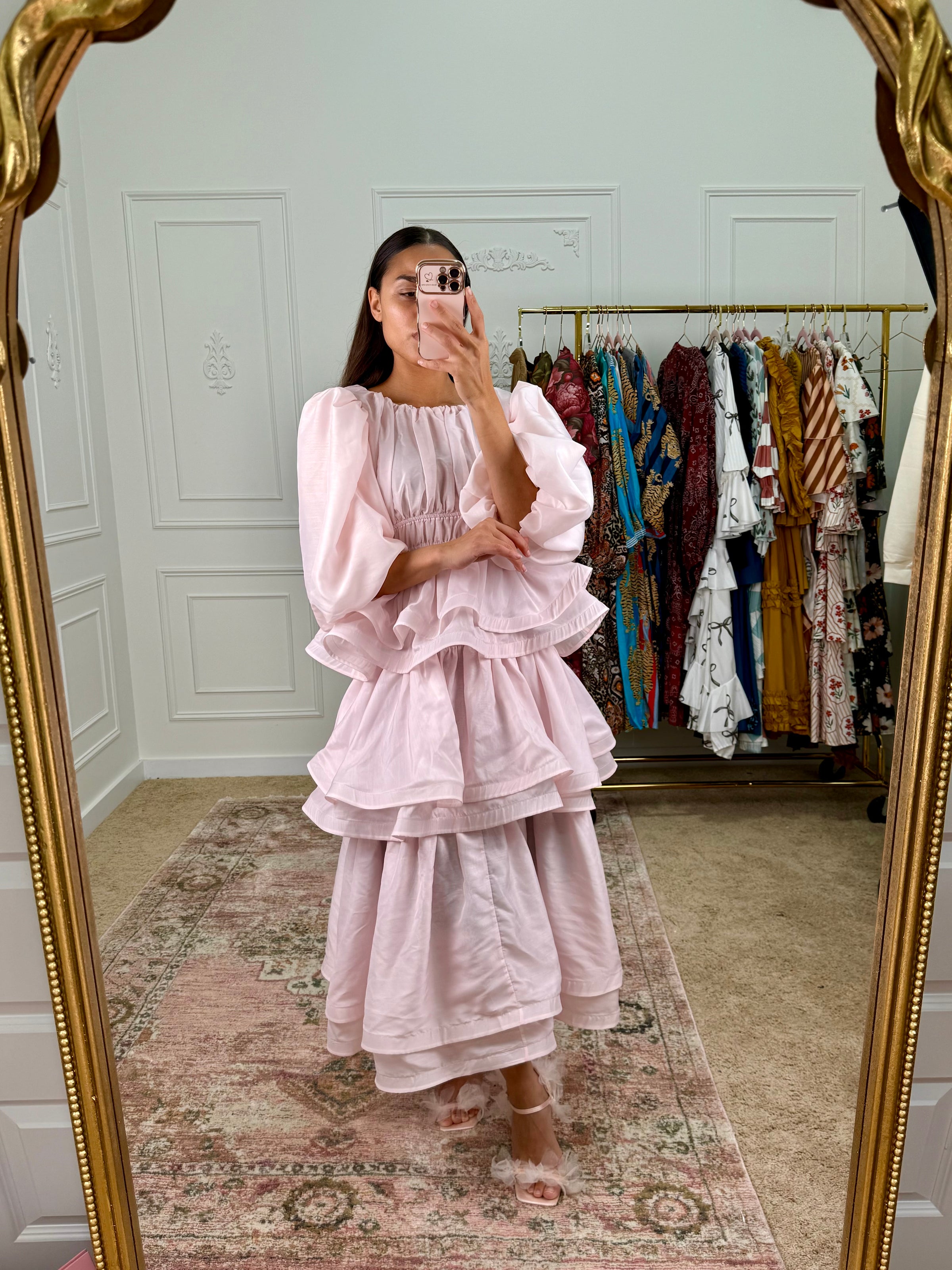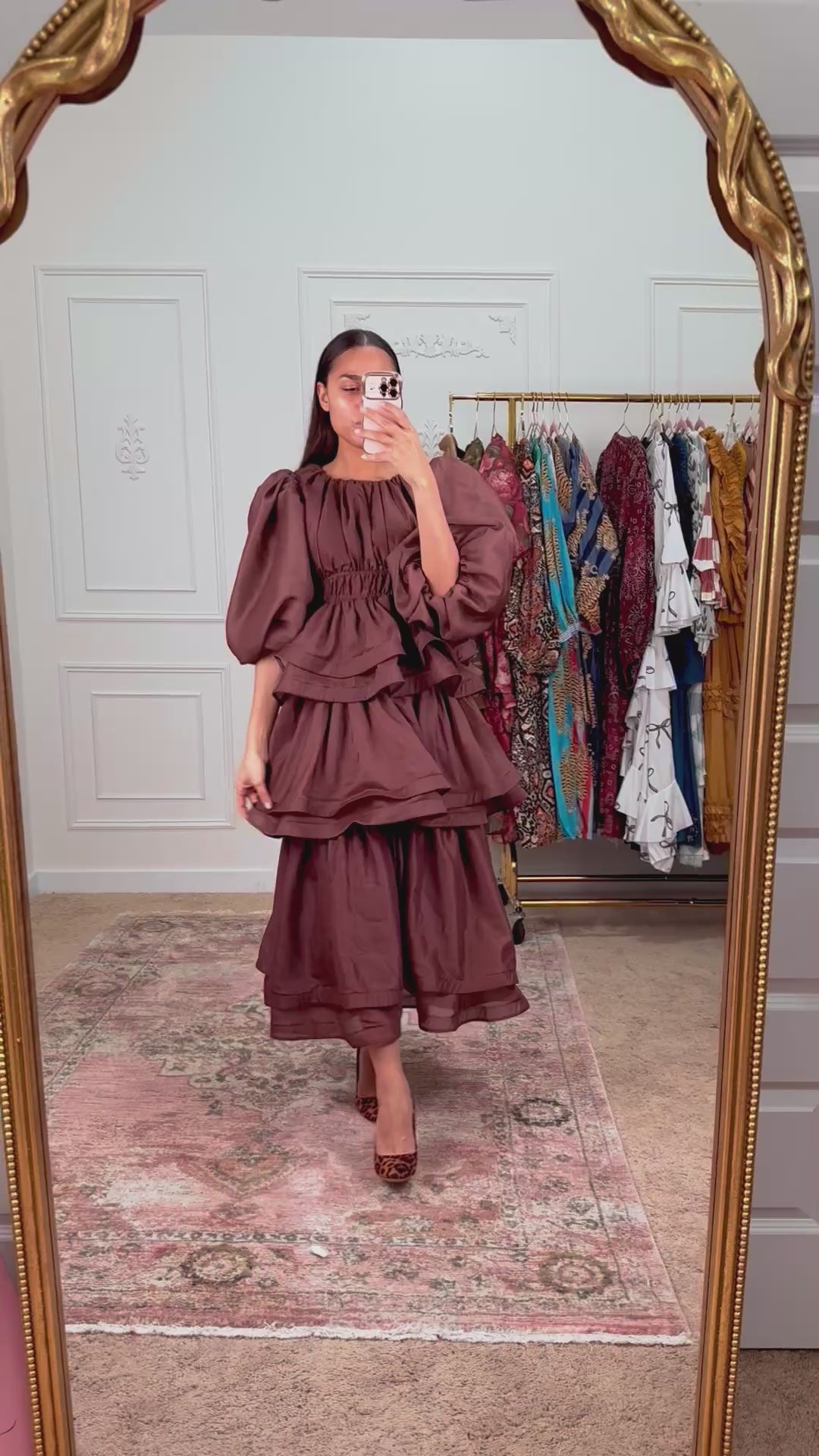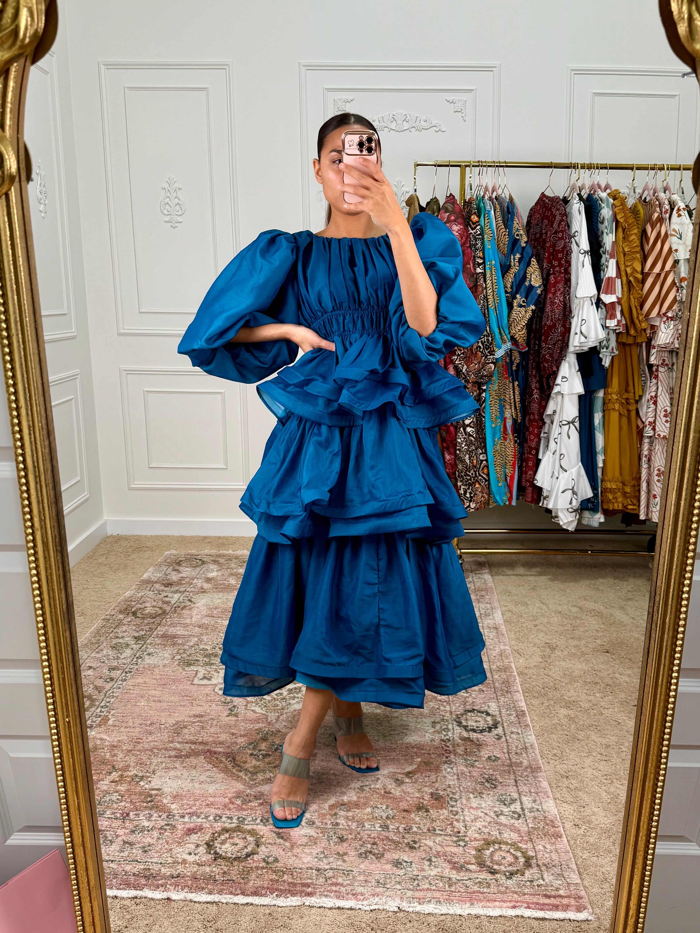 The Rio Dress is a tiered, ruffle maxi dress that blends whimsical charm with elegant structure. Designed with voluminous puff sleeves, a cinched waist, and cascading layered ruffles, this dress offers a flattering silhouette. The modest neckline and longer length make it a beautiful option for those seeking modest yet fashion-forward occasion wear. Perfect for church, garden parties, celebrations, weddings, and other formal events, the Rio Dress can easily be styled with layering pieces for added coverage. A standout piece for any wardrobe.
