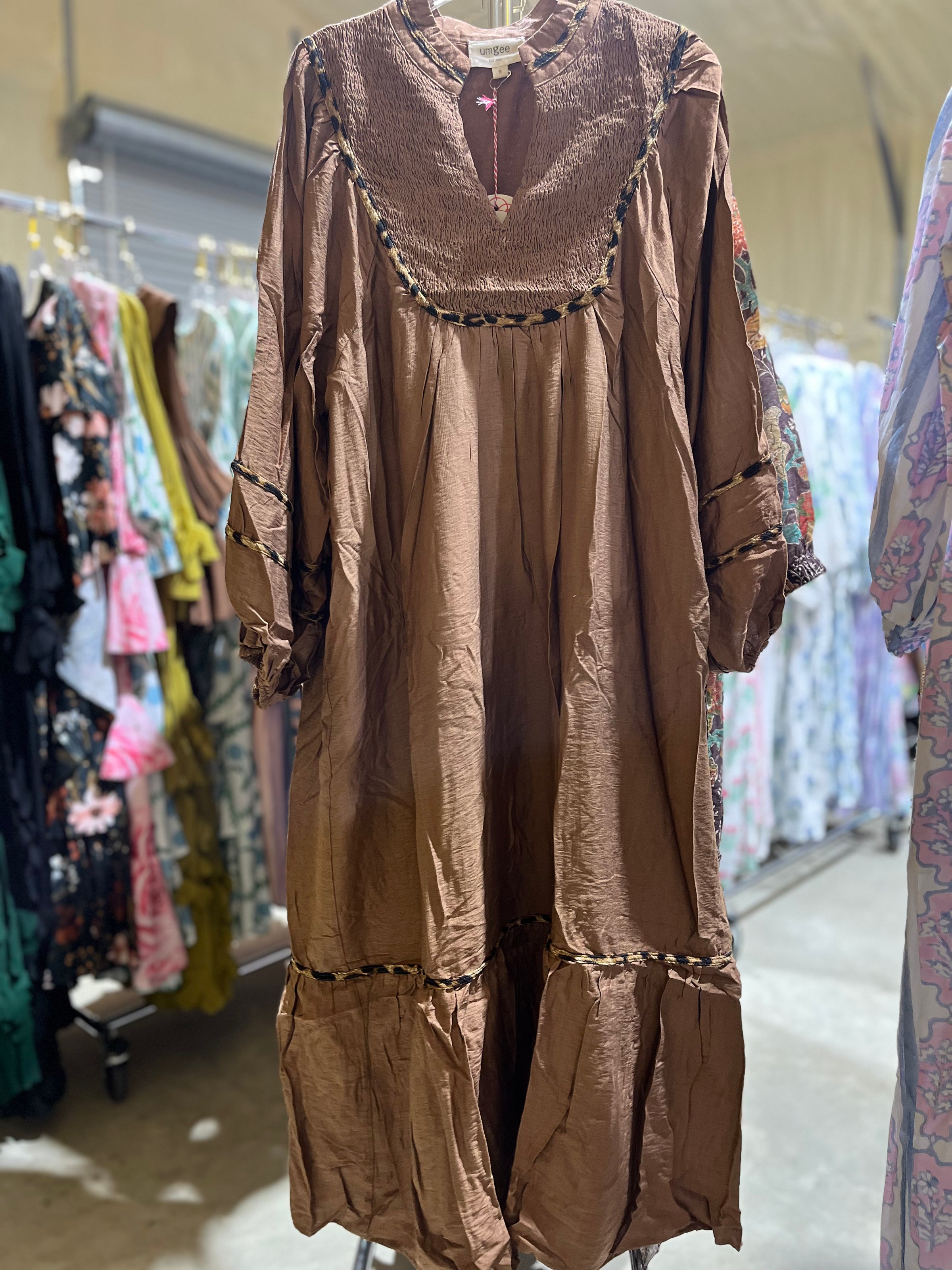 This relaxed fit maxi dress combines comfort and style in equal measure. Designed with a smocked yoke and split neckline, it flatters the figure while offering ease of wear. Long balloon sleeves and a tiered ruffle hemline give it a flowy, feminine feel, while contrast piping detail adds a touch of sophistication. Perfect for special gatherings, church, or seasonal outings, this versatile piece is available in classic Black, soft Sage, and warm Brown tones.