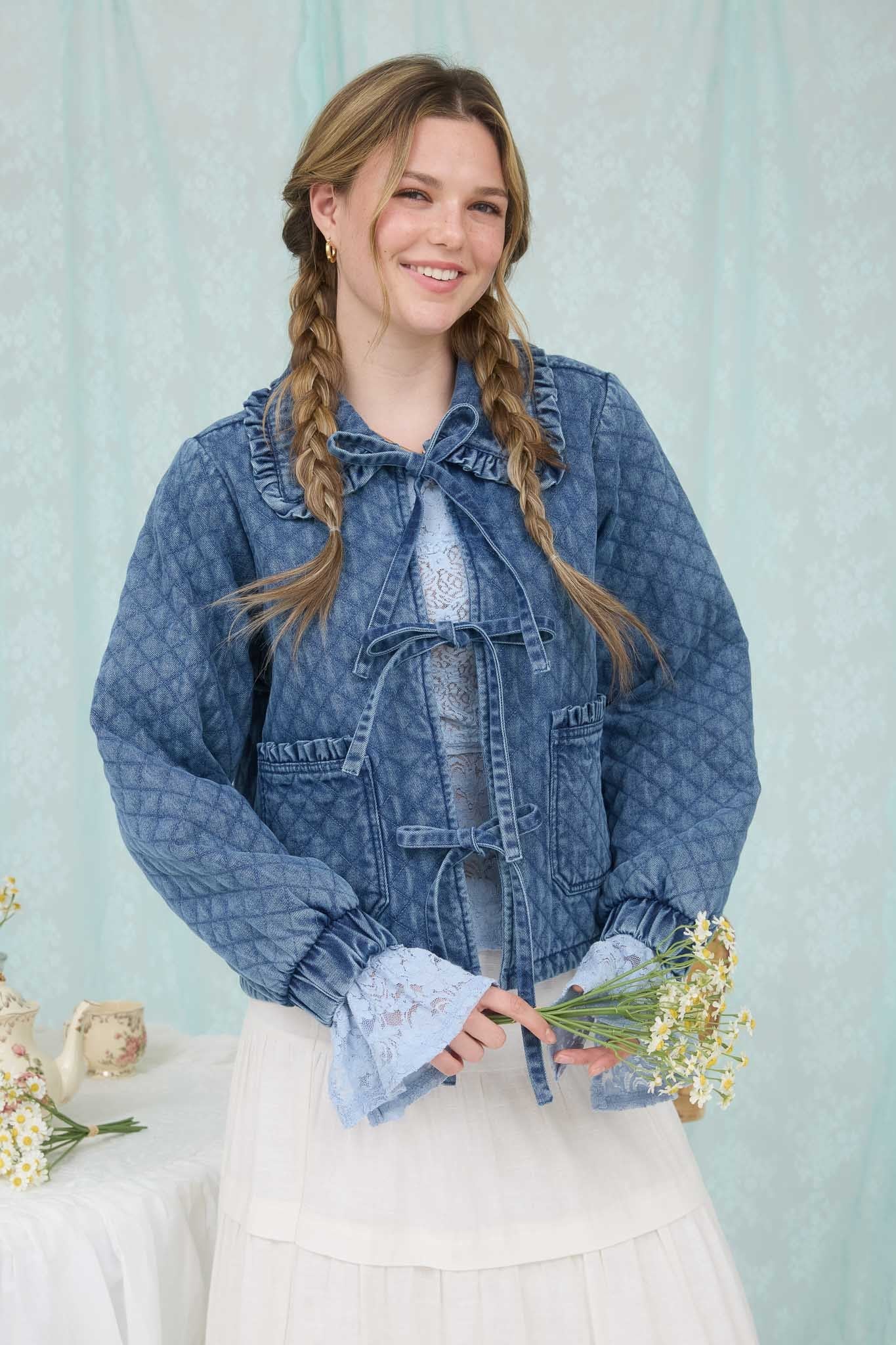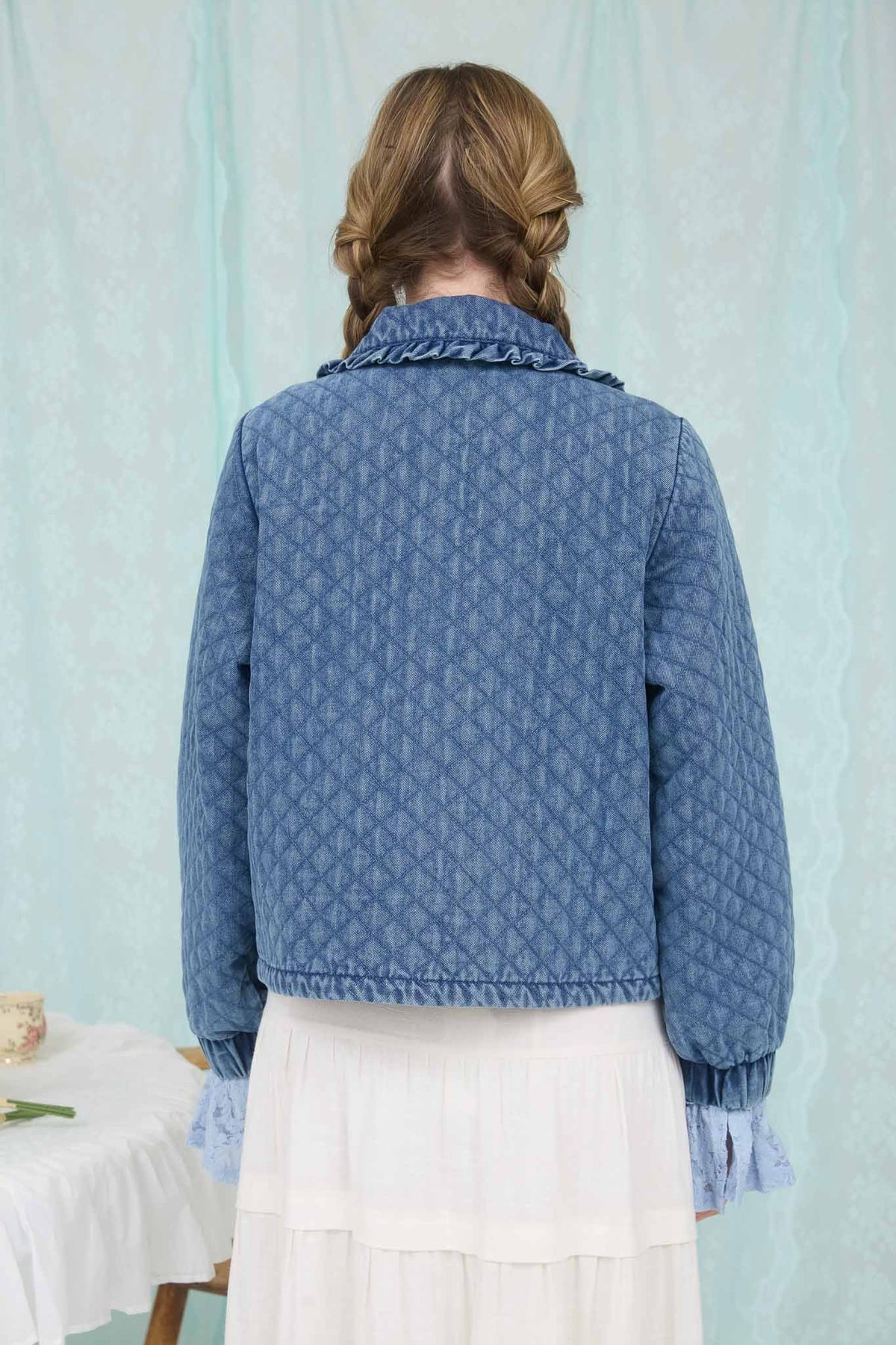 A charming blend of vintage-inspired details and modern denim, this quilted jacket brings softness, structure, and personality to any look. Designed with a ruffled collar and tie-front closures, it layers beautifully over dresses, blouses, or basics while adding a touch of feminine texture. The mixed denim pattern, quilt stitching, and subtle wash variation give it a unique, lived-in character. Finished with elastic cuffs, lace trim, and practical front pockets, it’s a standout piece that feels sweet, stylish, and effortlessly wearable.