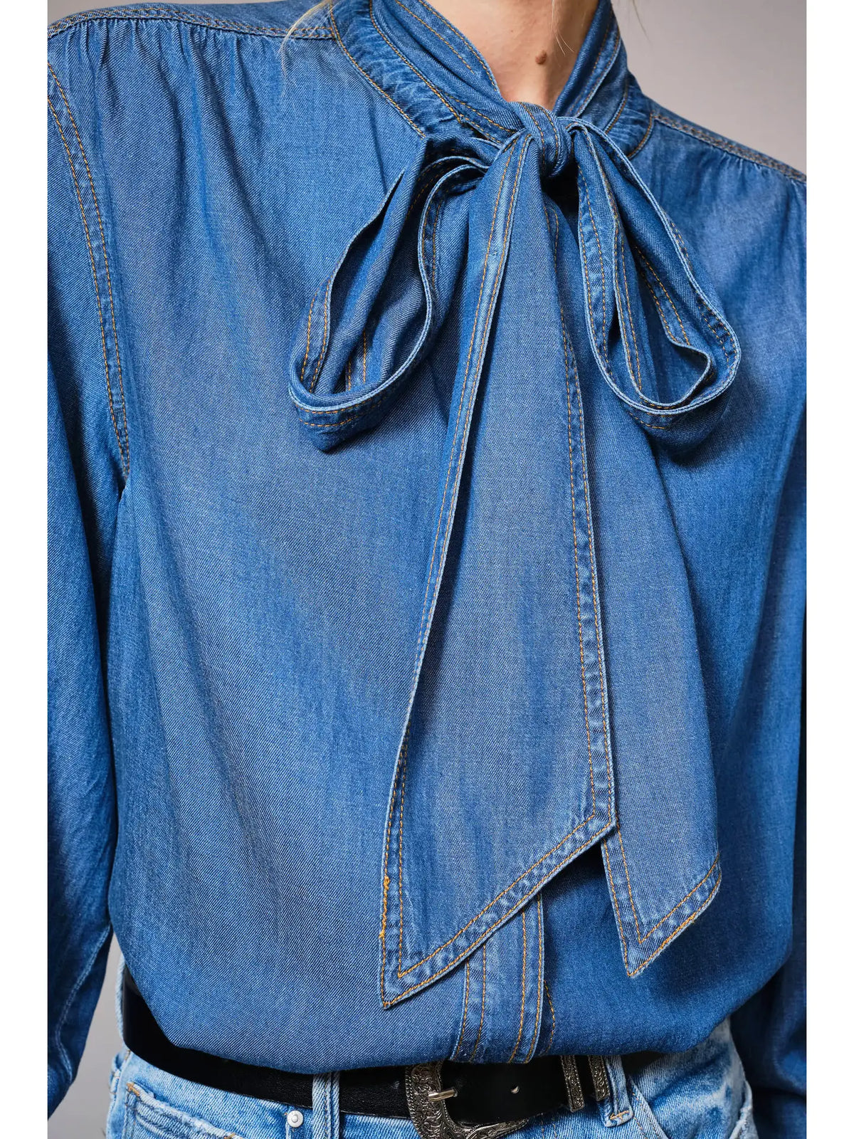This soft cotton-Tencel chambray blouse brings an elevated twist to everyday denim styling, featuring a dramatic tie-neck detail that adds effortless sophistication. Designed with a relaxed silhouette, hidden button placket, and tailored button-cuff sleeves, it blends comfort with a refined touch—perfect for dressing up or down through any season.