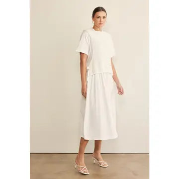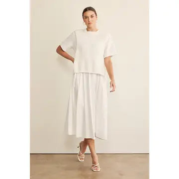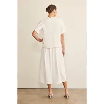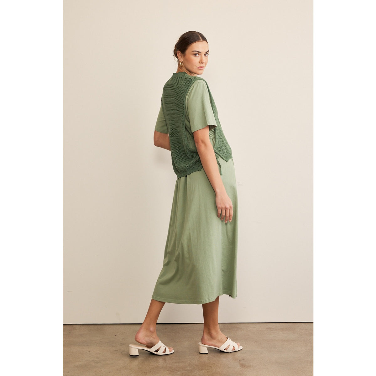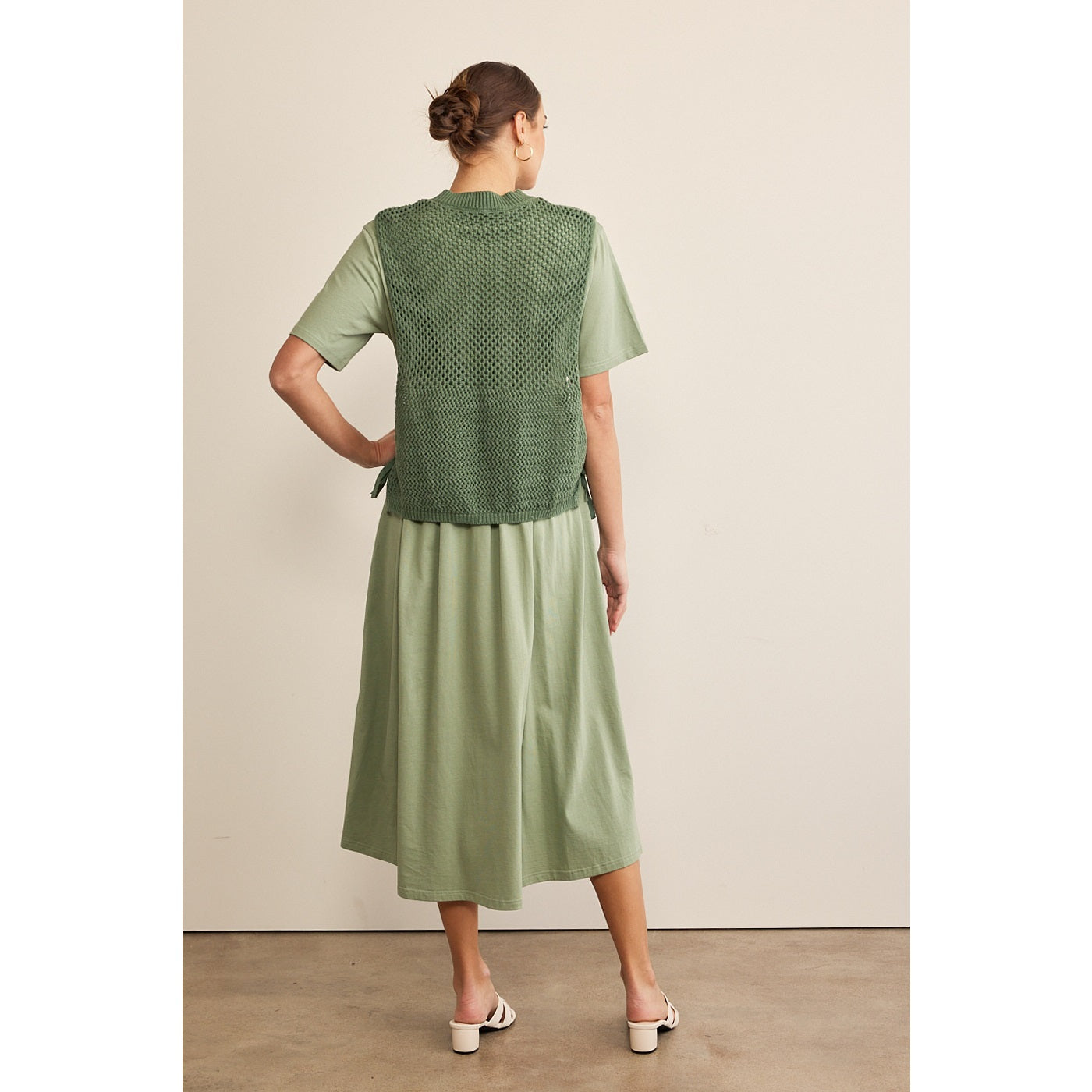 Effortlessly stylish, this sage midi dress features an attached knit vest for a modern layered effect without the bulk. The round neck and short sleeves keep it comfortable and versatile, while the flowy cotton skirt ensures easy movement. Perfect for casual days out, travel, or everyday wear.