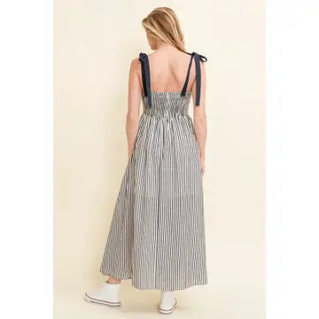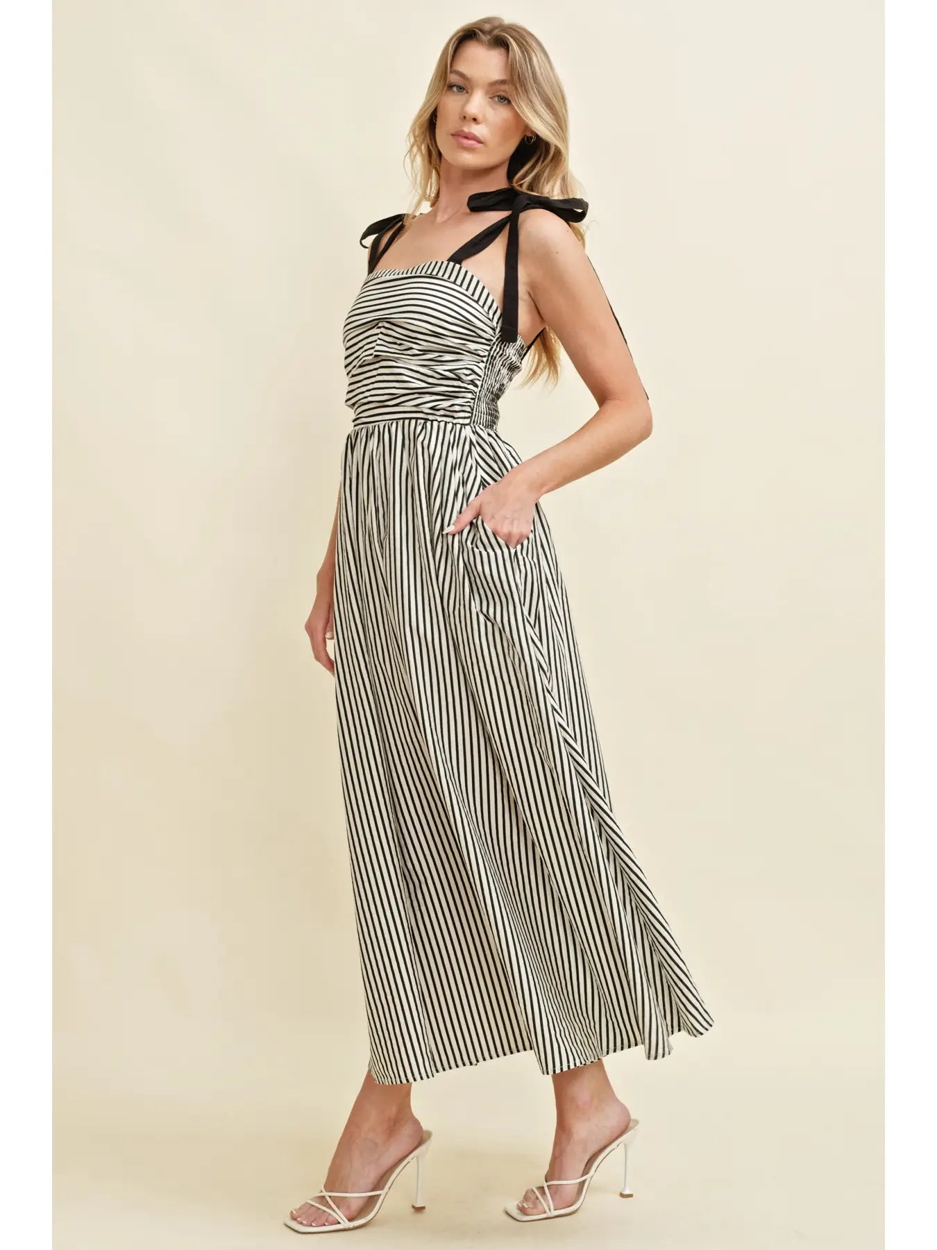 Effortlessly chic and modern, this striped maxi dress combines classic design with contemporary ease. The bow-tie straps and flowing skirt create a balanced silhouette that moves beautifully, making it a perfect choice for vacations, brunches, or warm-weather gatherings. Style it with sandals for a relaxed daytime look or dress it up with heels for an elevated touch.