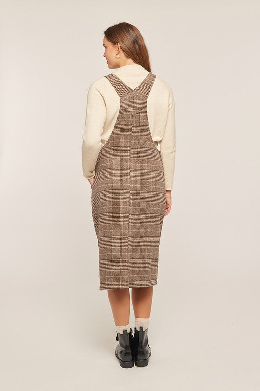 Chic meets casual in this plaid overall midi dress, designed to layer effortlessly with your favorite tops and sweaters. The adjustable buckle straps and side button closure bring a touch of vintage charm, while the square neckline and bib pocket keep it playful and practical. Its classic plaid pattern makes it versatile enough for both everyday errands and styled-up outings, offering endless ways to wear it year-round. Pair it with boots for a cozy autumn look or sneakers for a laid-back weekend vibe.