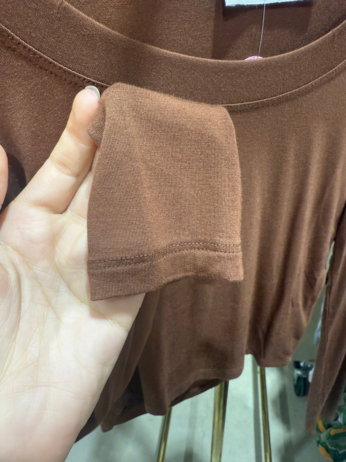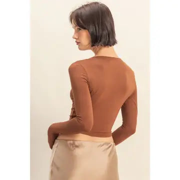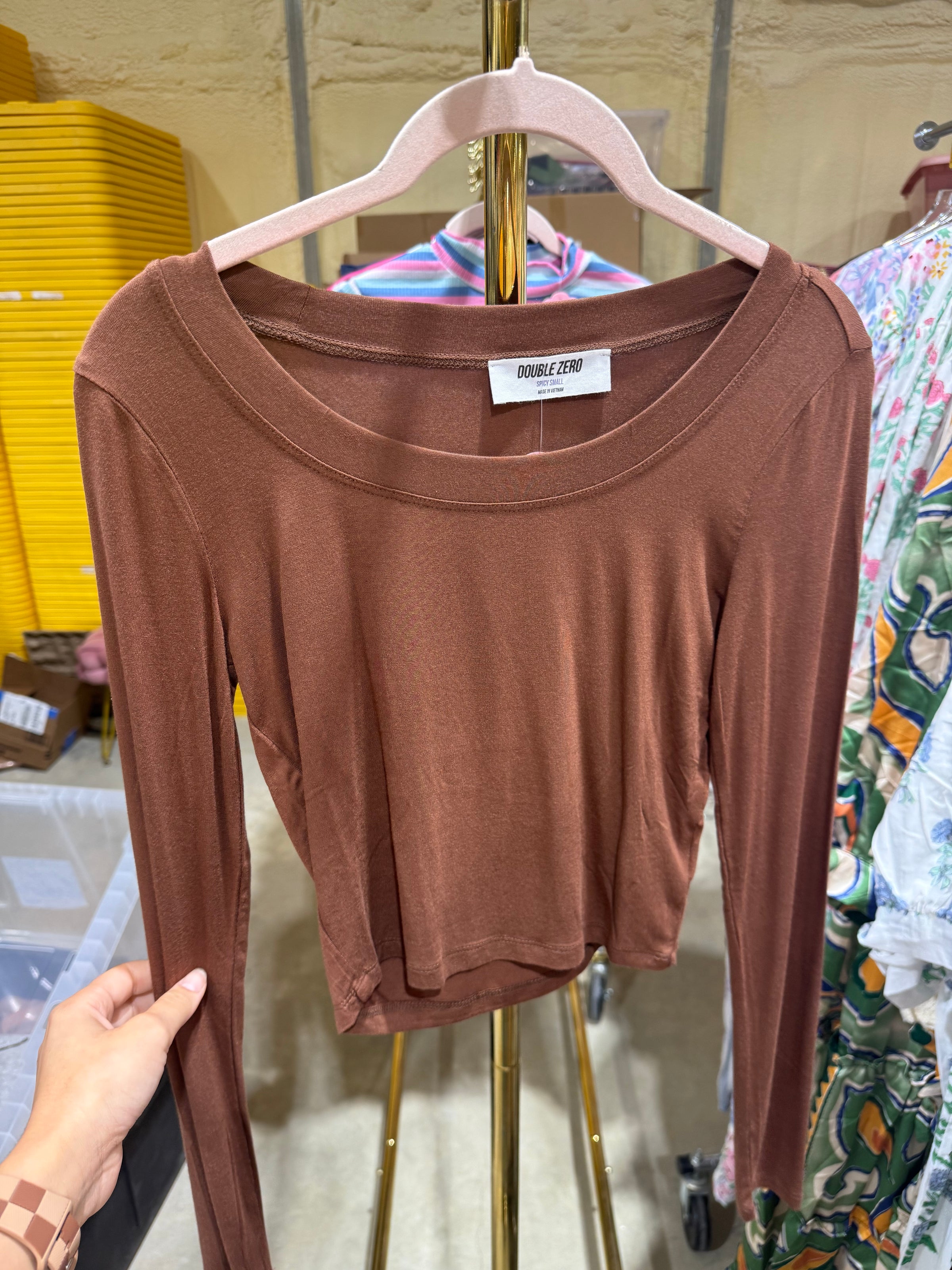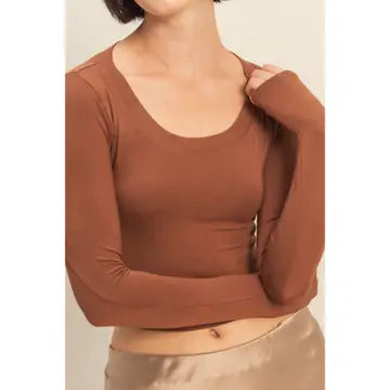 Elevate your casual style with this versatile cropped long sleeve top. Designed with a scoop neckline and a curve-enhancing fit, it’s ideal for pairing with high-waisted jeans, skirts, or shorts. The lightweight stretch fabric ensures all-day comfort, making it your new go-to for layering or chic stand-alone looks.