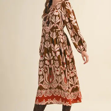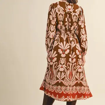 Elegant and timeless, this dress is perfect for fall gatherings, Sunday services, or seasonal celebrations. The earthy tones and statement floral motif pair beautifully with boots for a polished, effortless look.