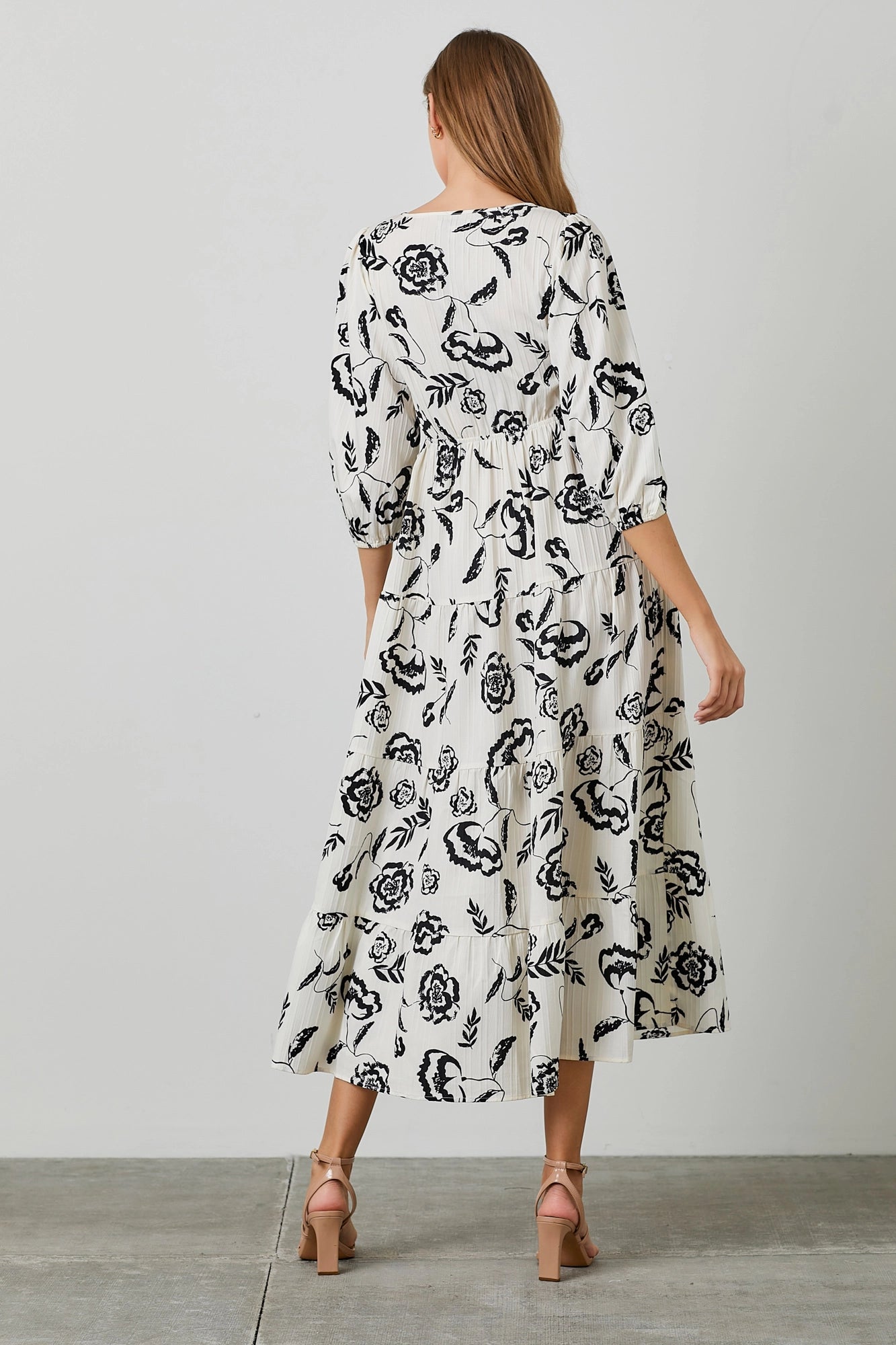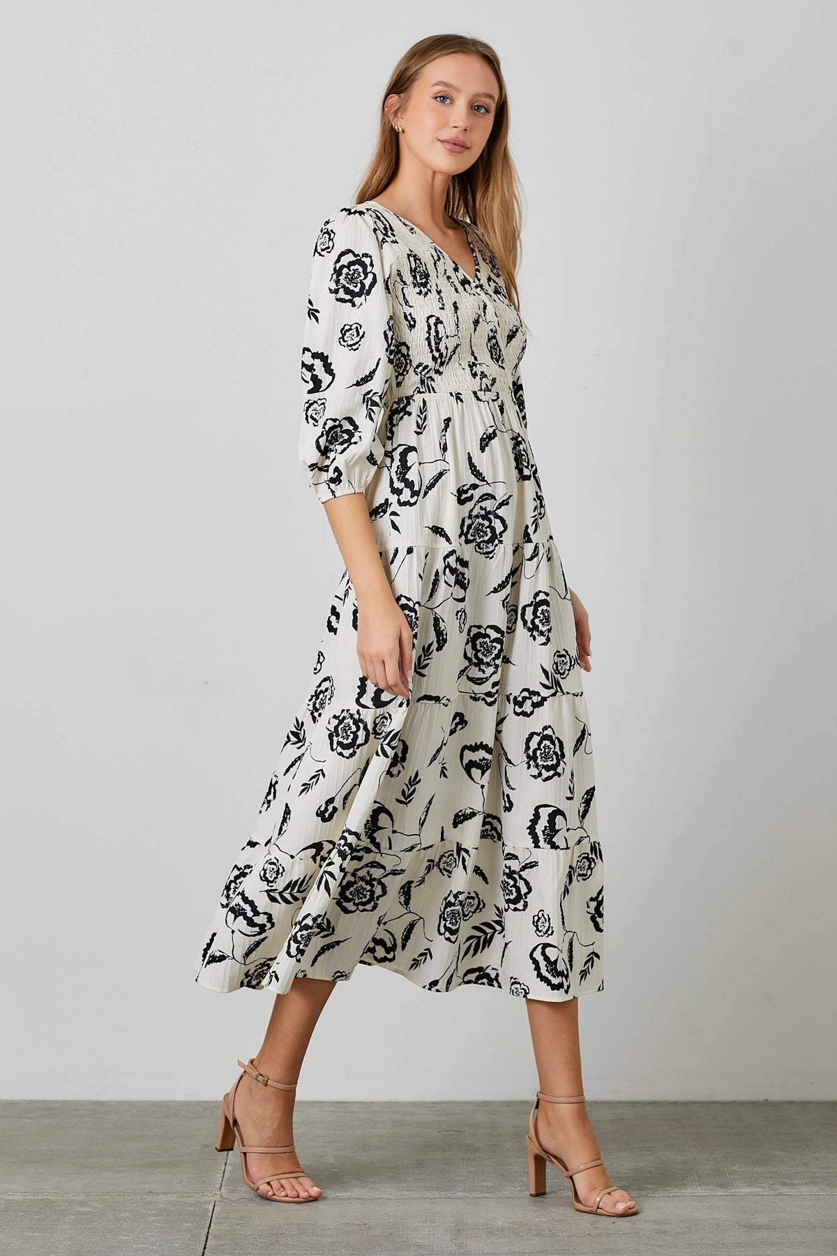 Feminine and versatile, this black-and-white floral midi dress blends everyday comfort with boutique charm. Designed with a flattering smocked bodice, a flowy tiered skirt, and long sleeves with elastic cuffs, it offers both elegance and ease. The lightweight pleated fabric adds subtle texture, making it perfect for casual outings, church, or seasonal events. A timeless monochrome floral print ensures this dress transitions effortlessly from fall through winter.