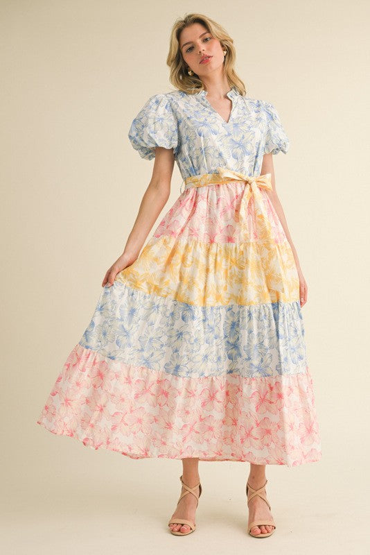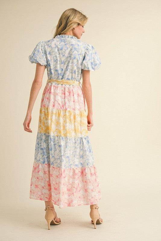 This tiered floral maxi dress is a summer essential that blends playful colors with an effortlessly elegant silhouette. Perfect for garden parties, Sunday brunch, or vacation days.