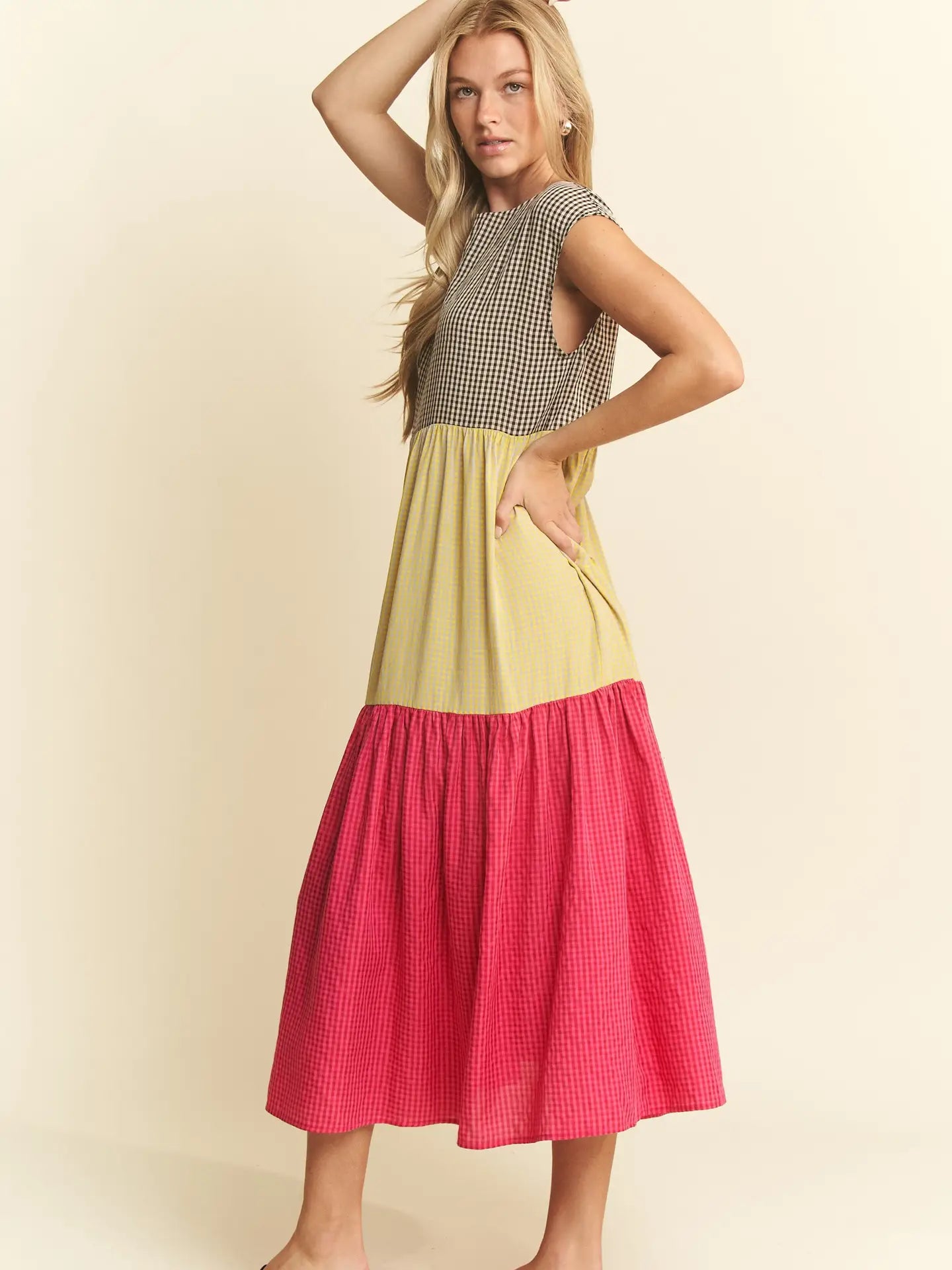 Playful and distinctive, this plaid color block midi dress blends contrasting patterns and colors for a look that feels both artistic and effortless. The relaxed silhouette drapes beautifully, while the flared skirt adds movement and charm. Finished with practical pockets and breathable cotton fabric, this dress offers an easy, standout style perfect for everyday wear or casual gatherings.