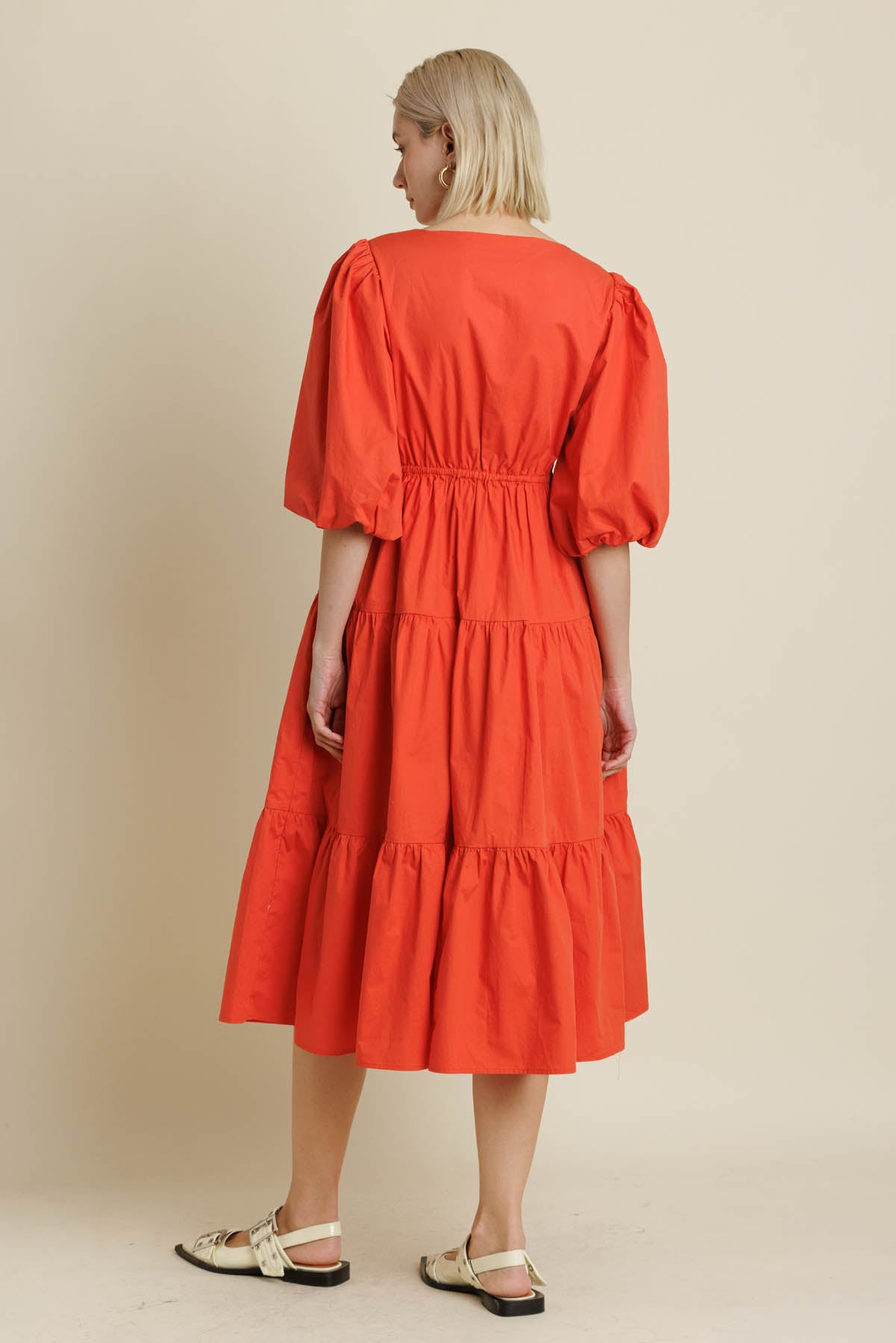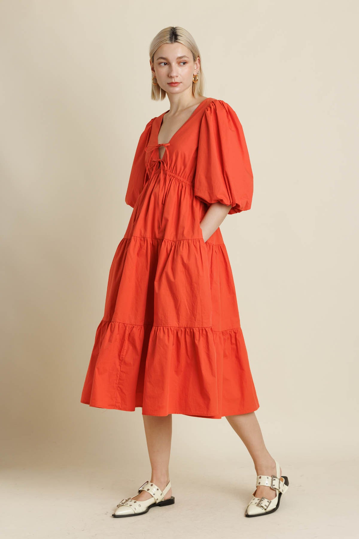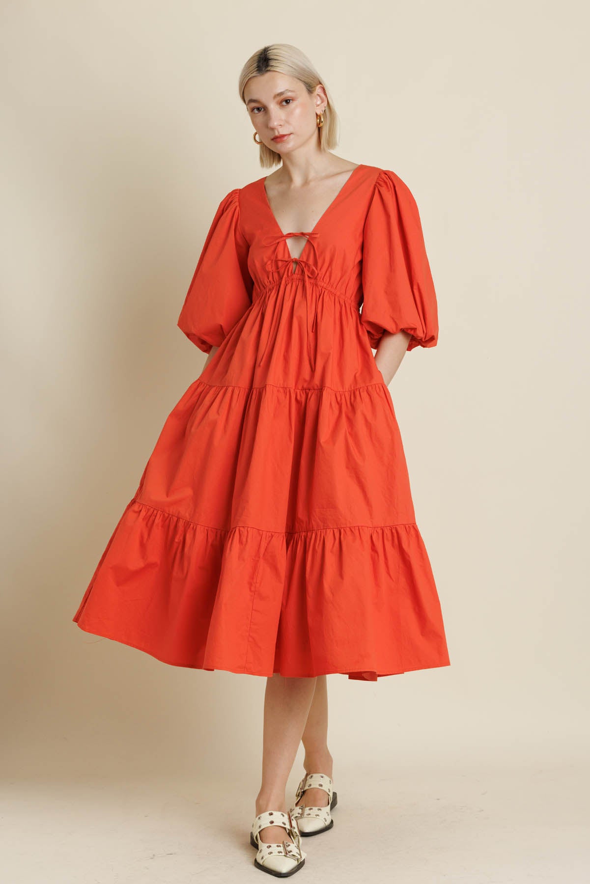 Bold and feminine, this cotton poplin midi dress is designed with a plunging neckline and tie detail for a modern touch. The puff sleeves balance the voluminous tiered skirt, creating an effortlessly chic silhouette. With side seam floating pockets for functionality and a fully lined finish for comfort, this piece combines everyday wearability with standout style. Perfect for both casual daytime looks and elevated evening outings.