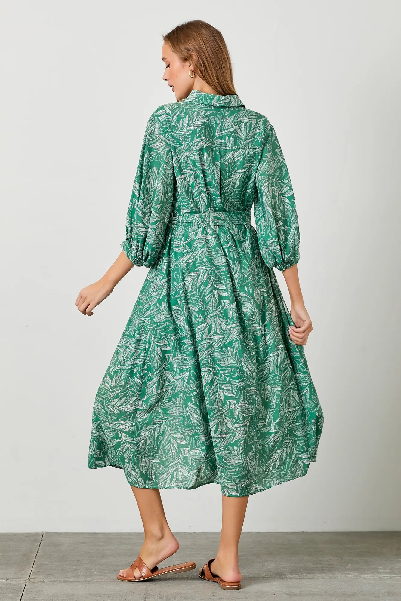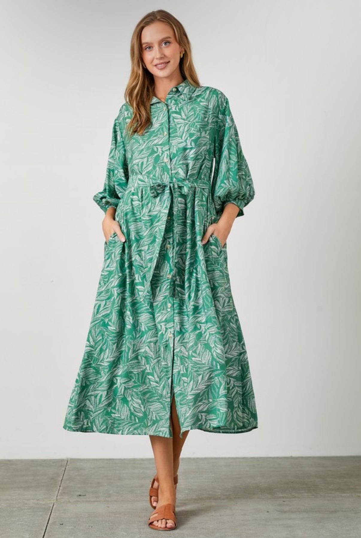 Effortlessly polished and breathable, this button-down midi dress offers a refined take on relaxed dressing. The soft green leaf print and easy silhouette make it a timeless choice for both casual days and elevated occasions.